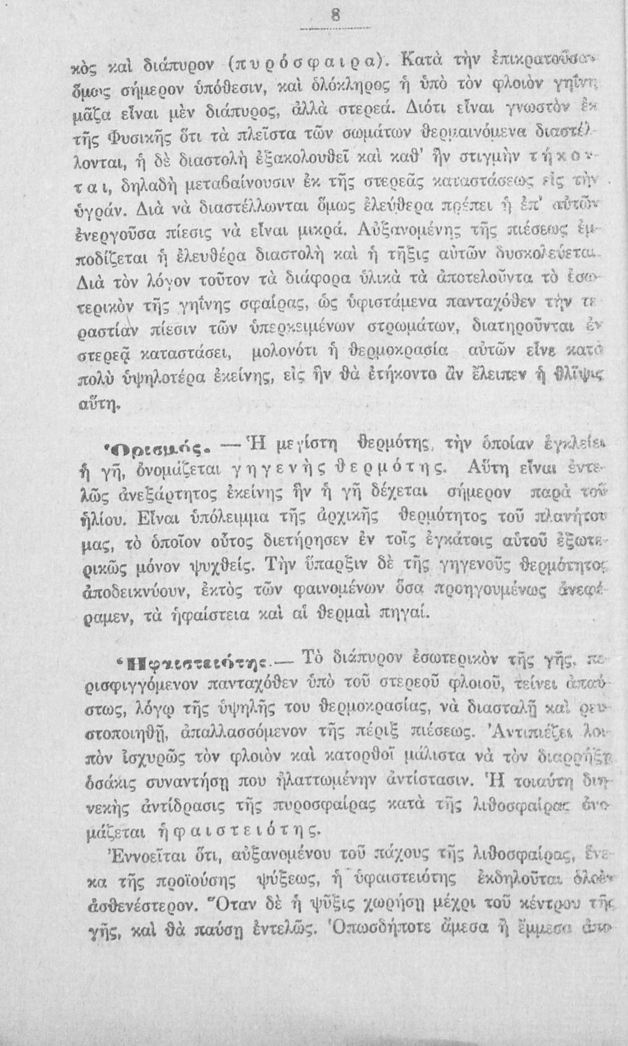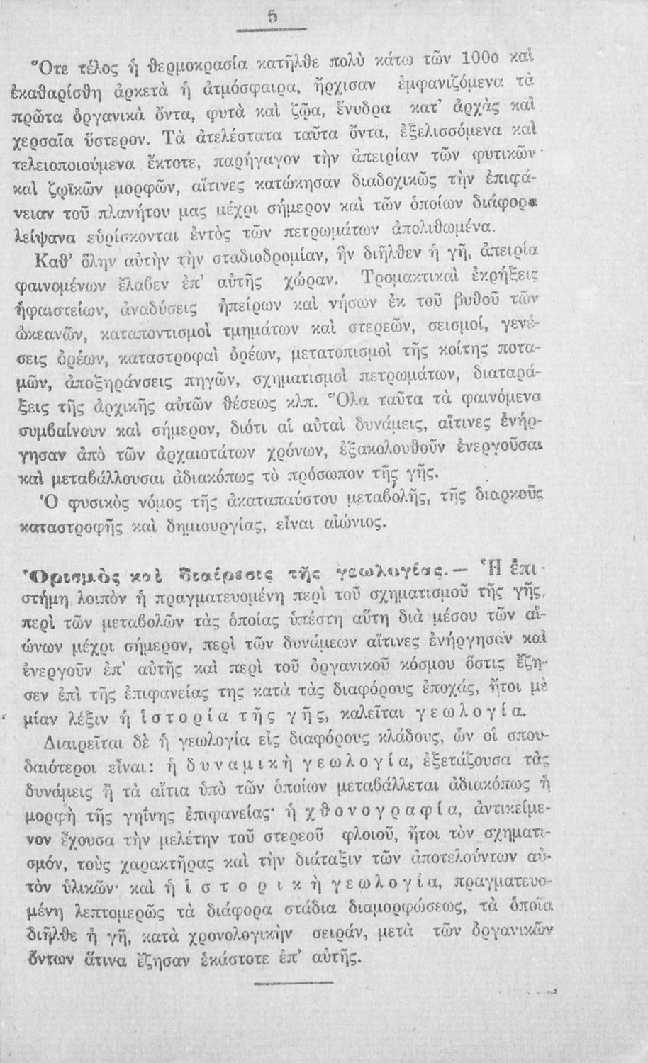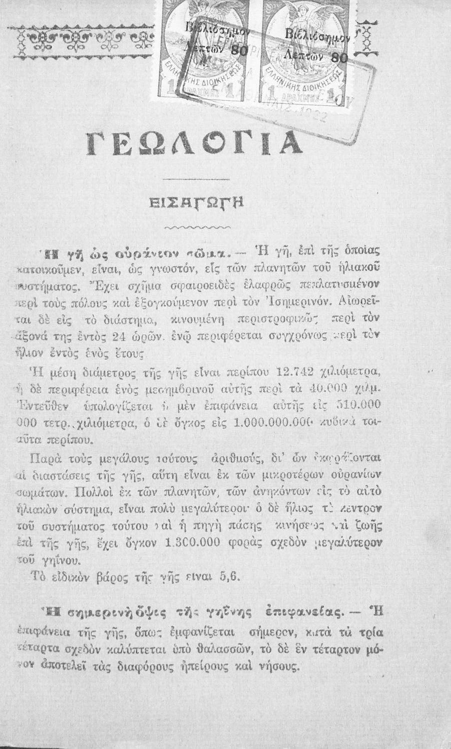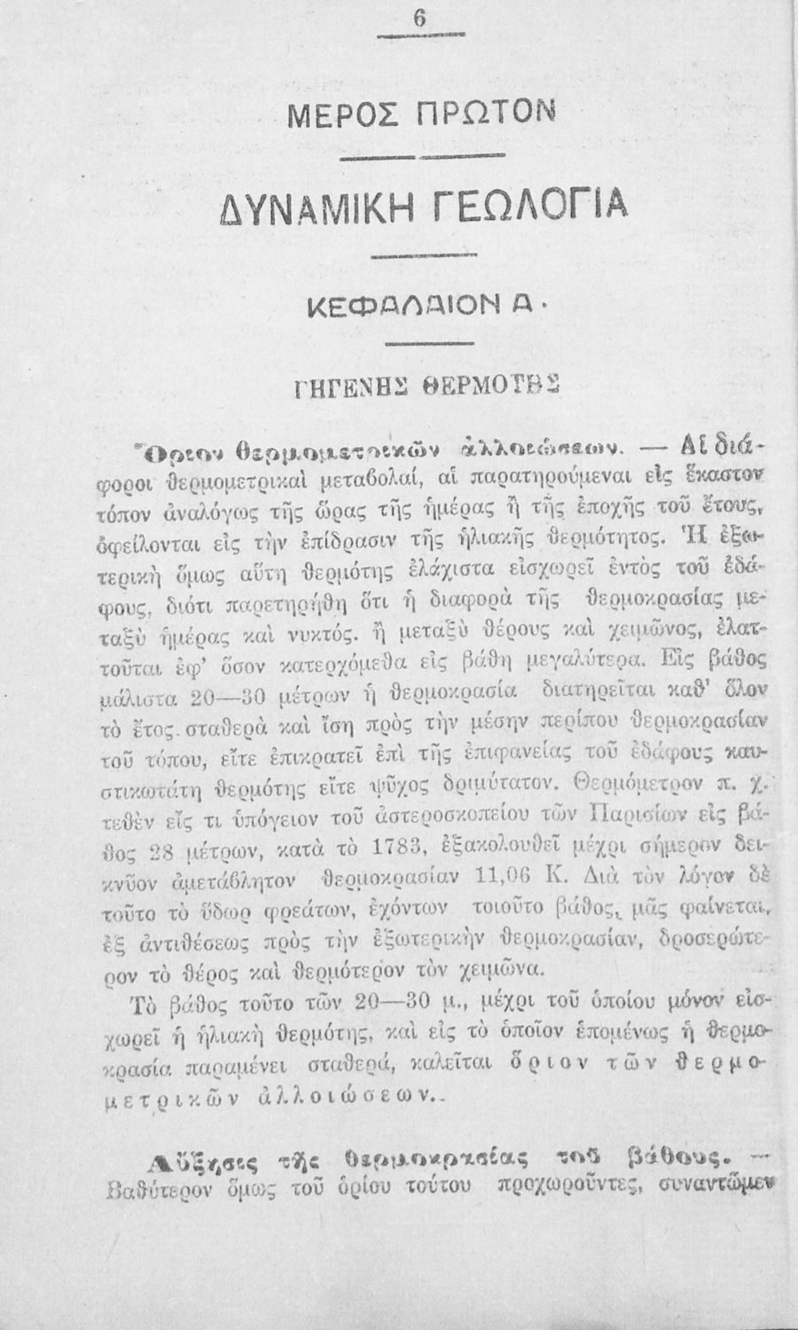 Βαθμίδα εκπαίδευσης: Δευτεροβάθμια Τάξη: Β' Γυμνασίου Μάθημα: Γεωλογία, Ορυκτολογία Γλώσσα: Απλή καθαρεύουσα Παρουσίαση περιεχομένου: Σχολικό εγχειρίδιο Γεωλογίας/Ορυκτολογίας Β΄ Γυμνασίου που εστιάζει στη δυναμική και ιστορική γεωλογία (παλαιοντολογία) και στις διακρίσεις μεταξύ των ορυκτών. |