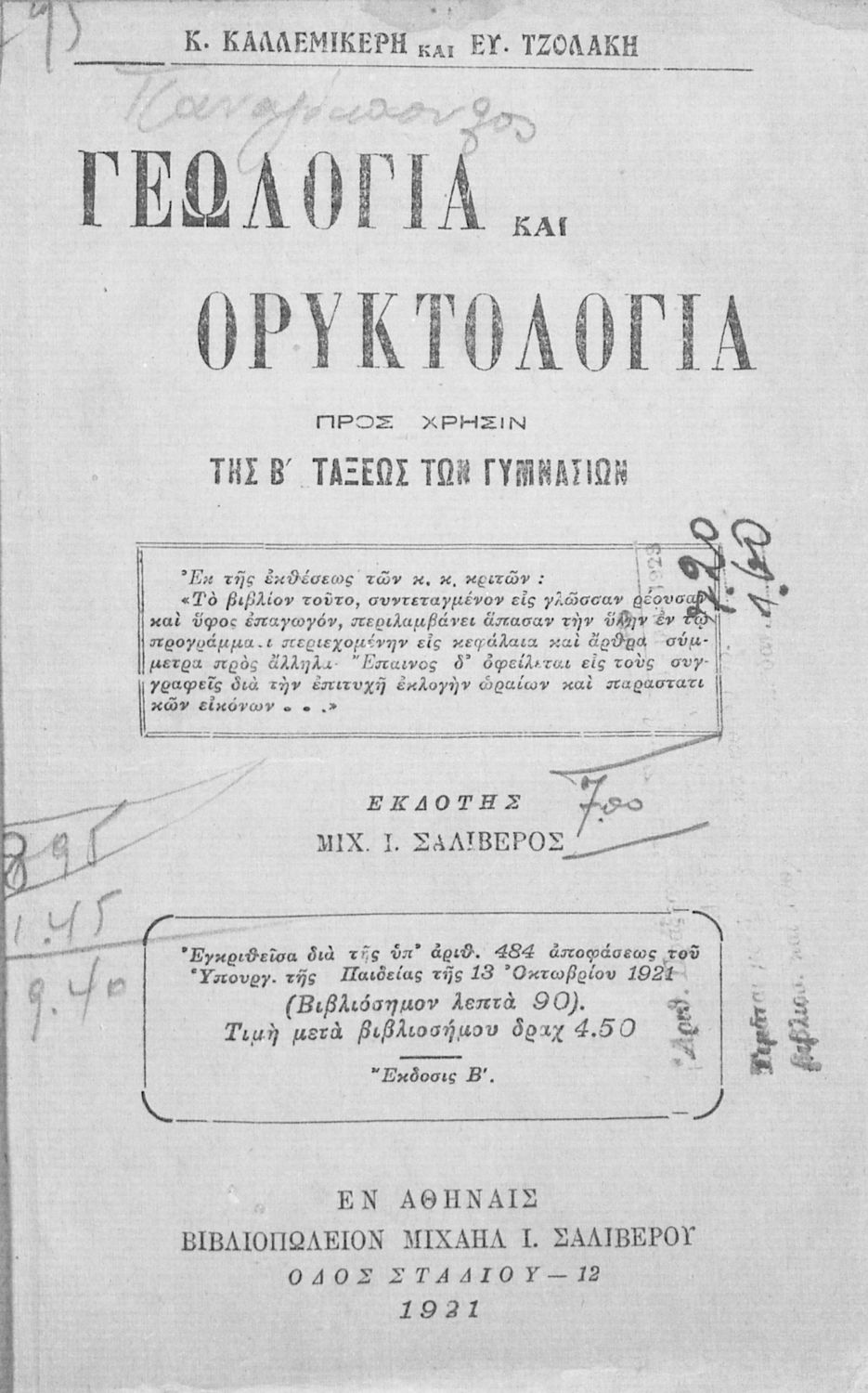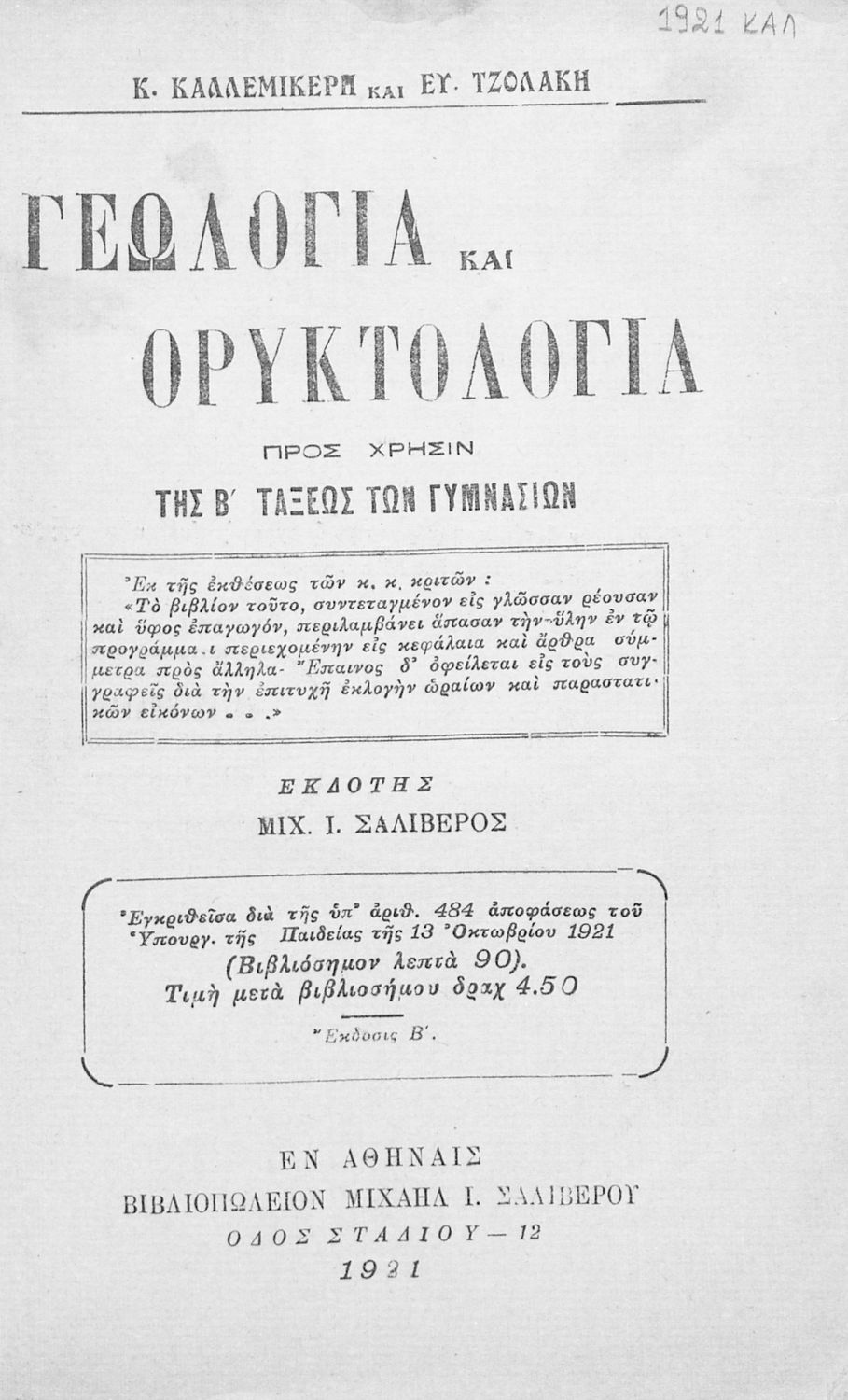 Εκδότης: Μιχαήλ Ι. Σαλίβερος Έτος έκδοσης: 1921 Τόπος έκδοσης: Αθήνα Υπουργική απόφαση / Σύμβαση: 3139/6-9-1921 Έτος έγκρισης: 1921 |