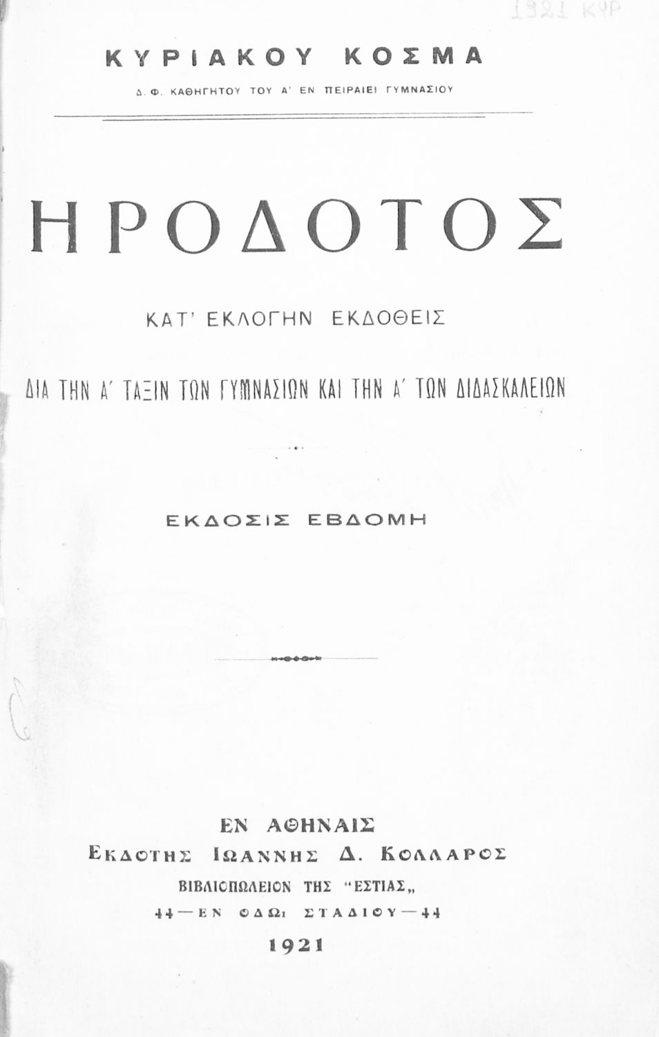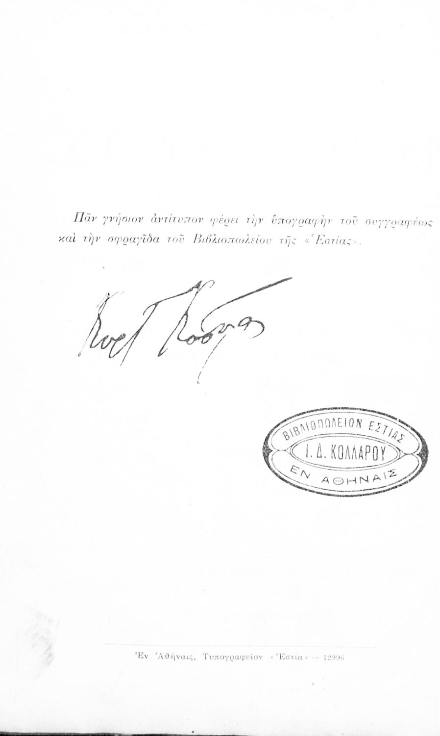 Εντοπισμός πρωτοτύπου: Ελληνικό Λογοτεχνικό και Ιστορικό Αρχείο Κωδικός βιβλιοθήκης: 1921 ΚΥΡ |