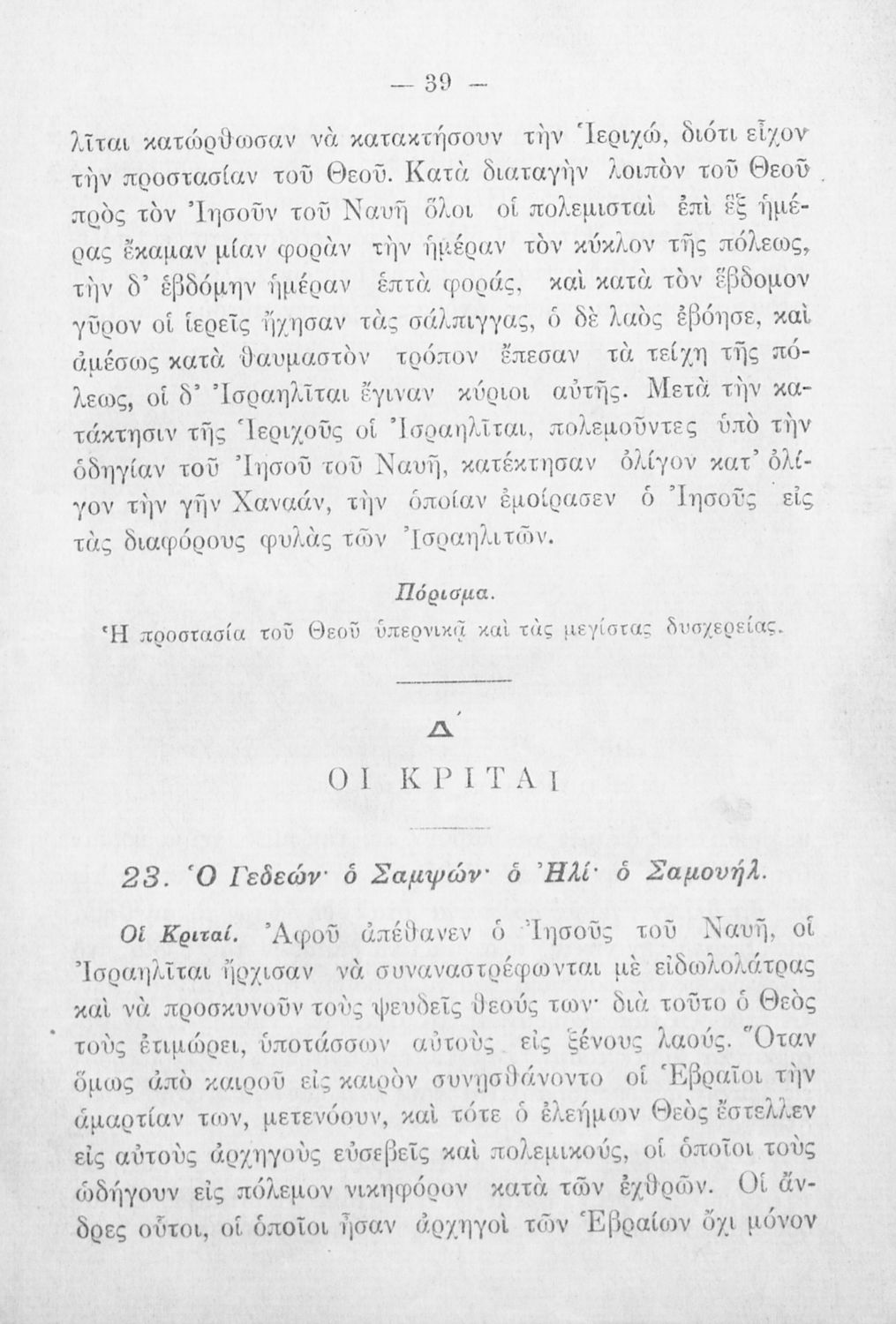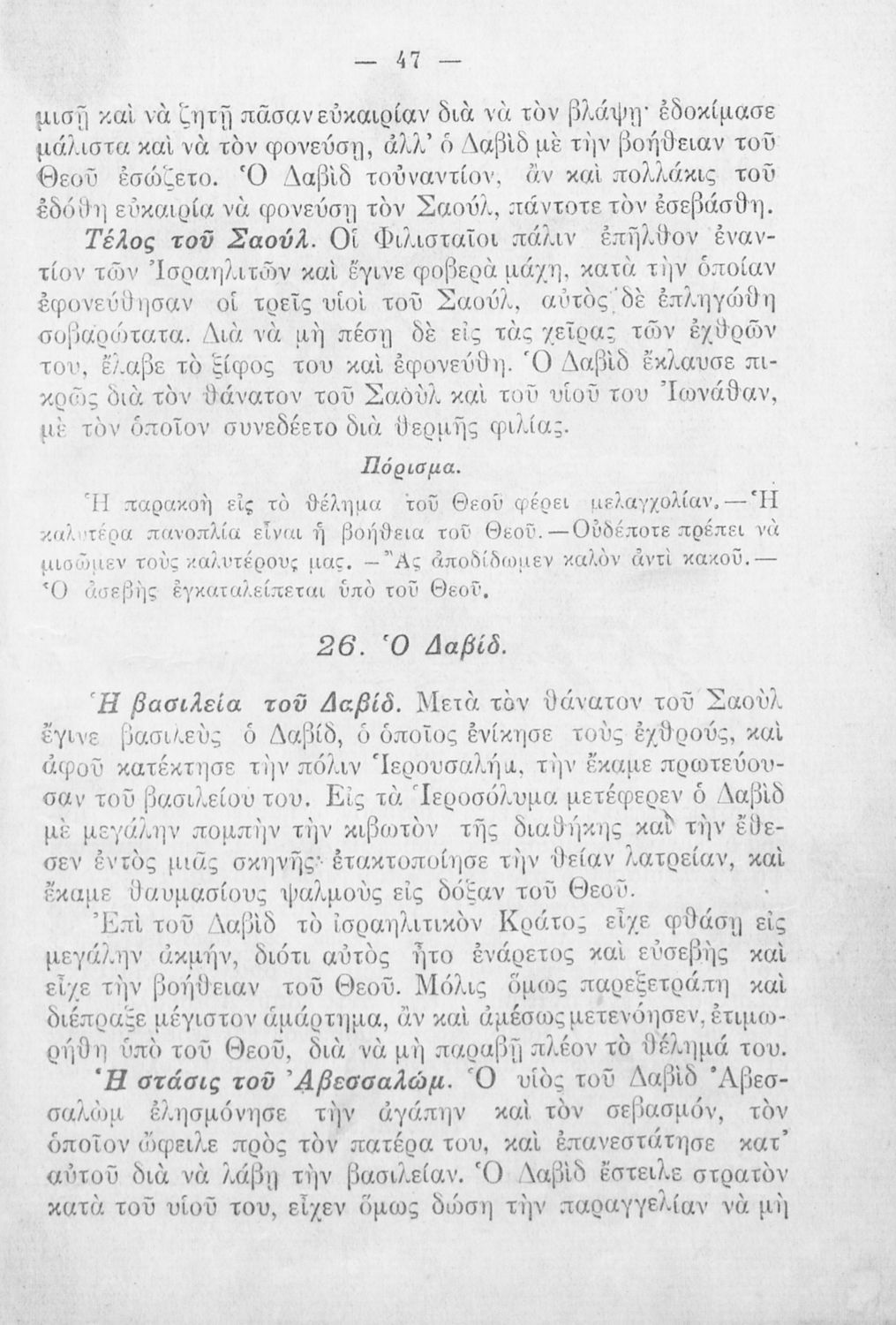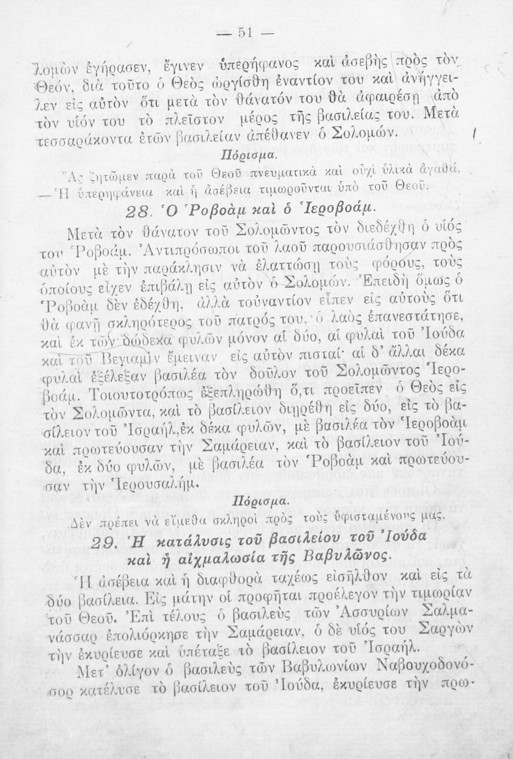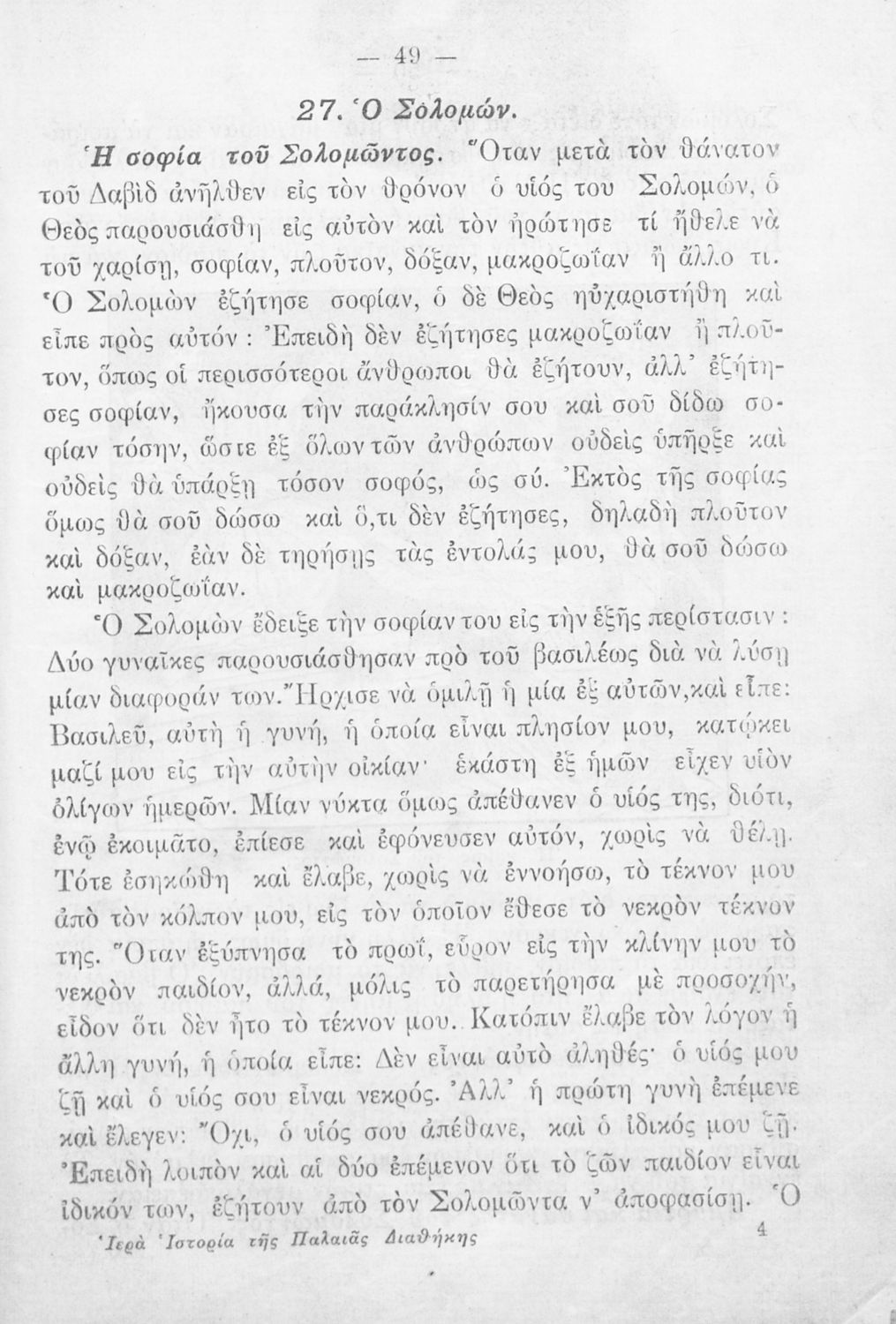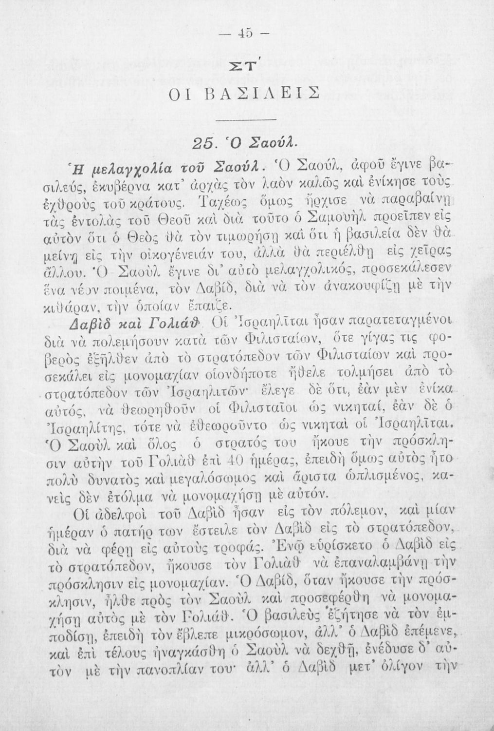 Σχολικό εγχειρίδιο Θρησκευτικών που συνιστά μία εξιστόρηση της Παλαιάς Διαθήκης από τη δημιουργία του κόσμου ως την υποταγή των Εβραίων στους Ρωμαίους. Περιέχει και στοιχεία γεωγραφίας της Παλαιστίνης.