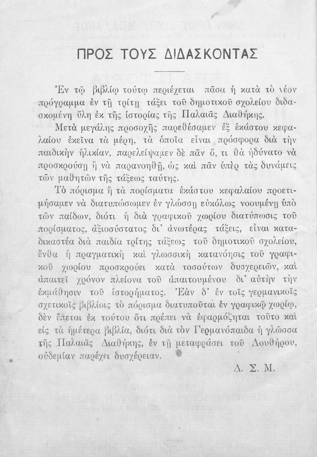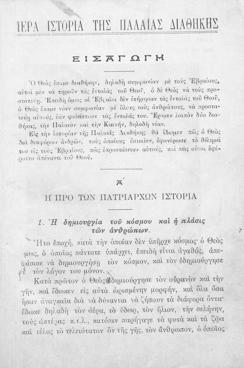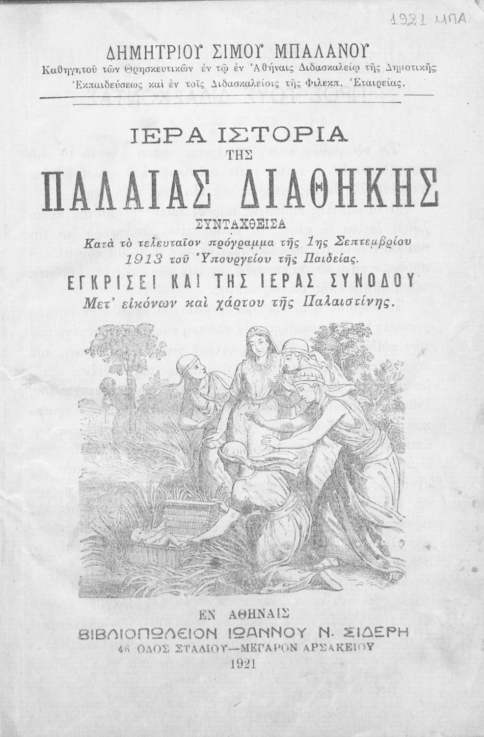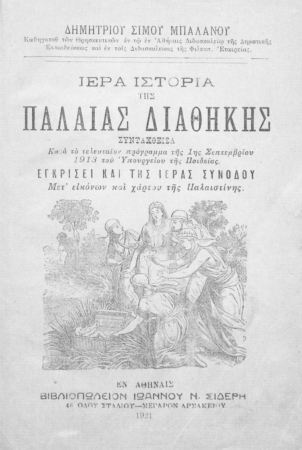 Σχολικό εγχειρίδιο Θρησκευτικών που συνιστά μία εξιστόρηση της Παλαιάς Διαθήκης από τη δημιουργία του κόσμου ως την υποταγή των Εβραίων στους Ρωμαίους. Περιέχει και στοιχεία γεωγραφίας της Παλαιστίνης.
