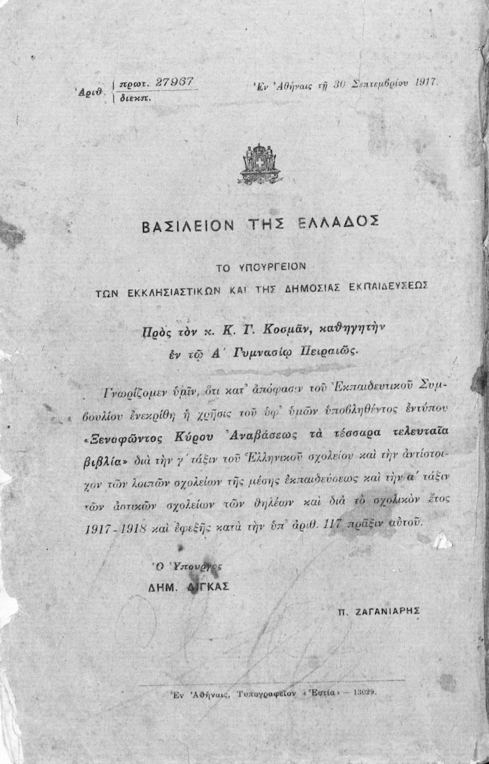 Σχολικό εγχειρίδιο Αρχαίων Ελληνικών για τις Γ΄ Ελληνικών Σχολείων και Α΄ Αστικών Σχολείων Θηλέων που περιλαμβάνει το έργο του Ξενοφώντα Κύρου Ανάβασις, εισαγωγικά σχόλια για τη ζωή και το έργο του, ...