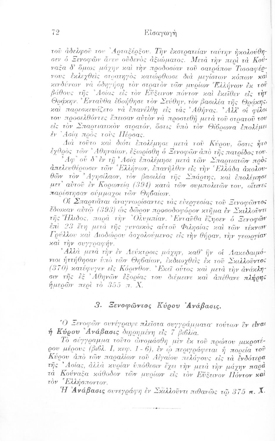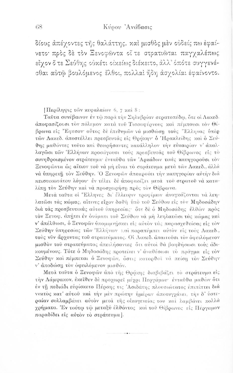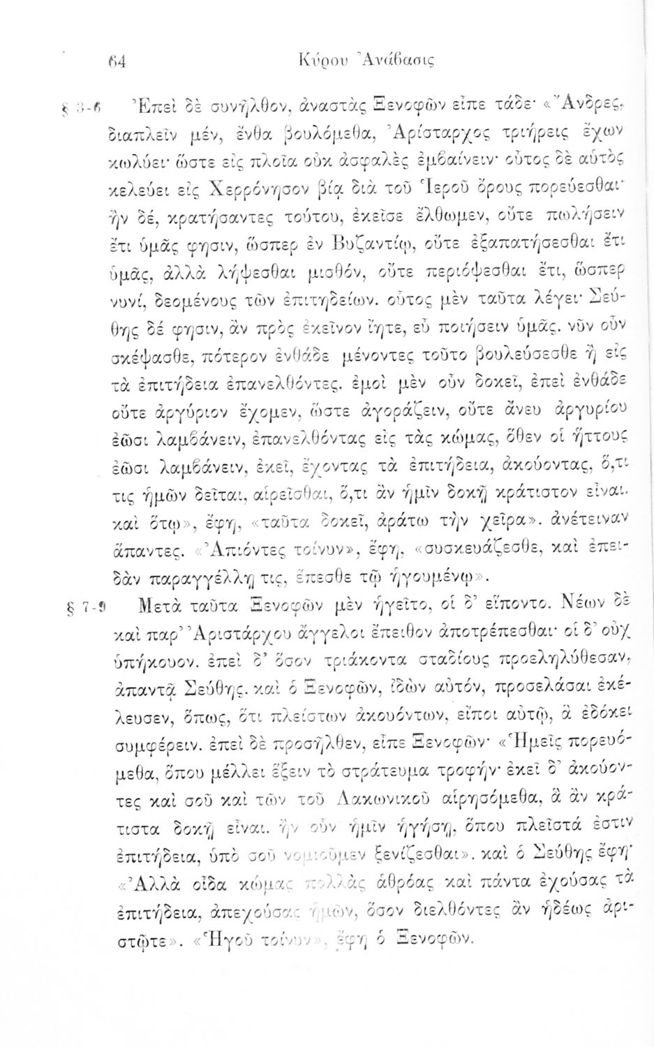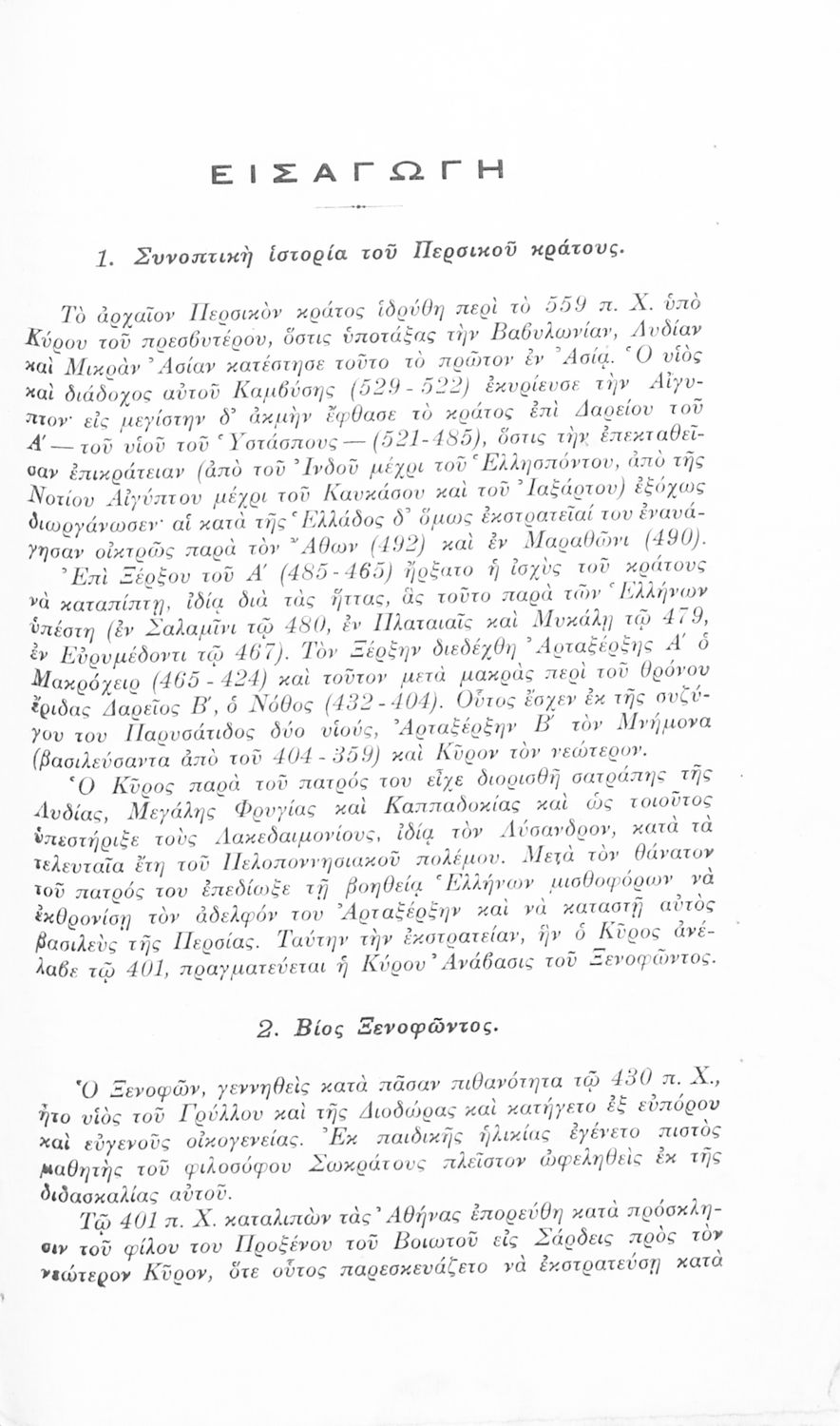Σχολικό εγχειρίδιο Αρχαίων Ελληνικών Γ' Ελληνικού και Αστικού Σχολείου που περιλαμβάνει το έργο του Ξενοφώντα Κύρου Ανάβασις, εισαγωγικά σχόλια για τη ζωή και το έργο του, ερμηνευτικές και γραμματικές παρατηρήσεις, και πίνακα κυριοτέρων ονομάτων.