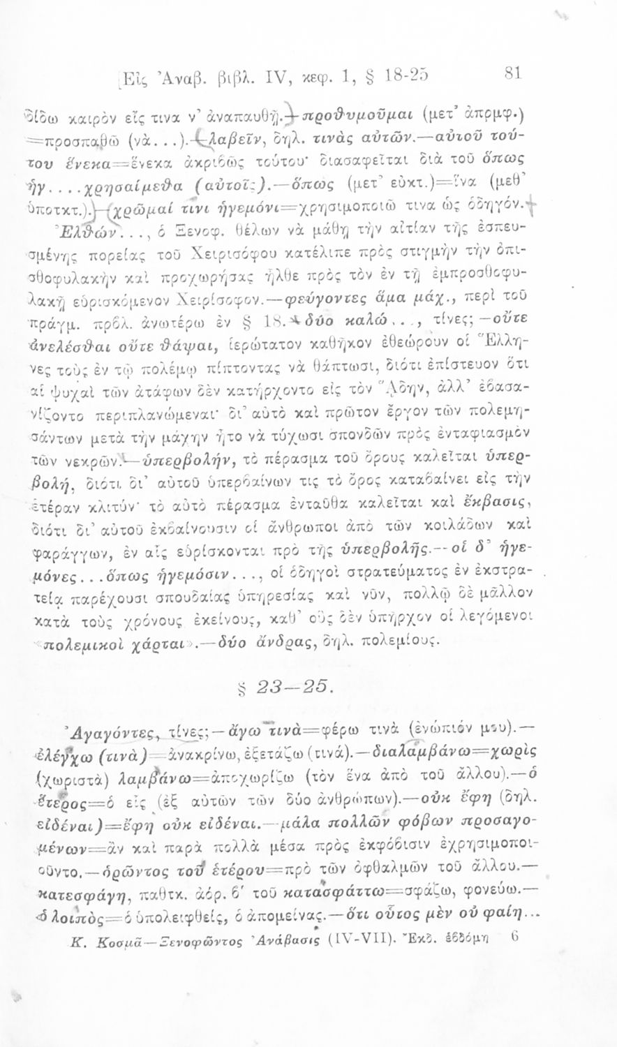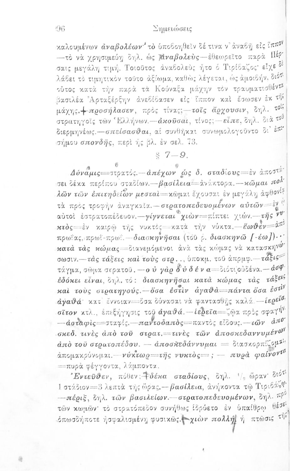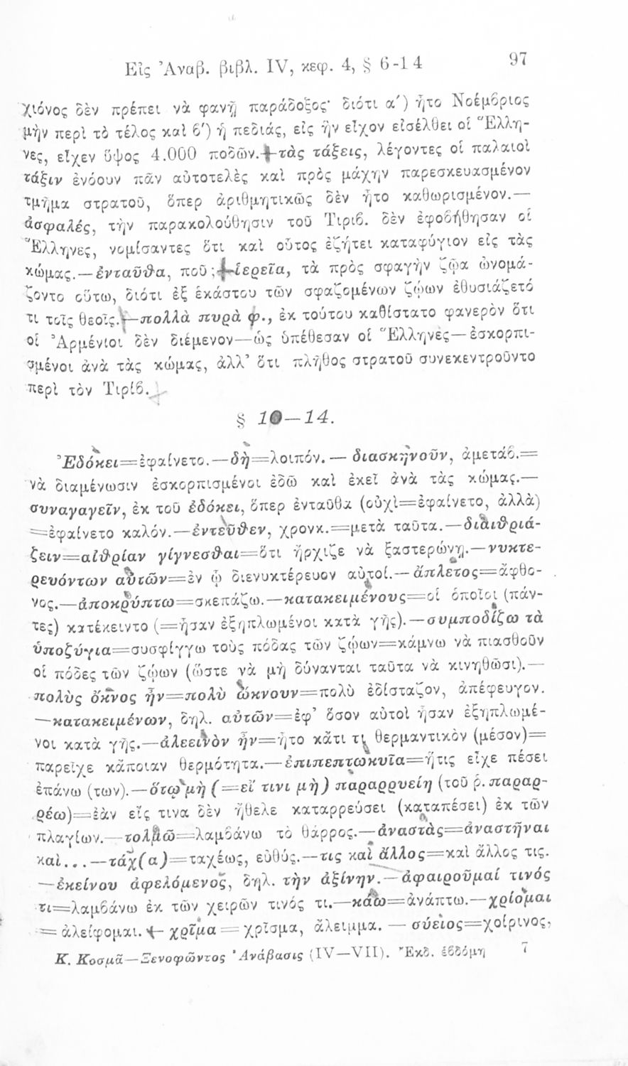 Σχολικό εγχειρίδιο Αρχαίων Ελληνικών Γ' Ελληνικού και Αστικού Σχολείου που περιλαμβάνει το έργο του Ξενοφώντα Κύρου Ανάβασις, εισαγωγικά σχόλια για τη ζωή και το έργο του, ερμηνευτικές και γραμματικές παρατηρήσεις, και πίνακα κυριοτέρων ονομάτων.