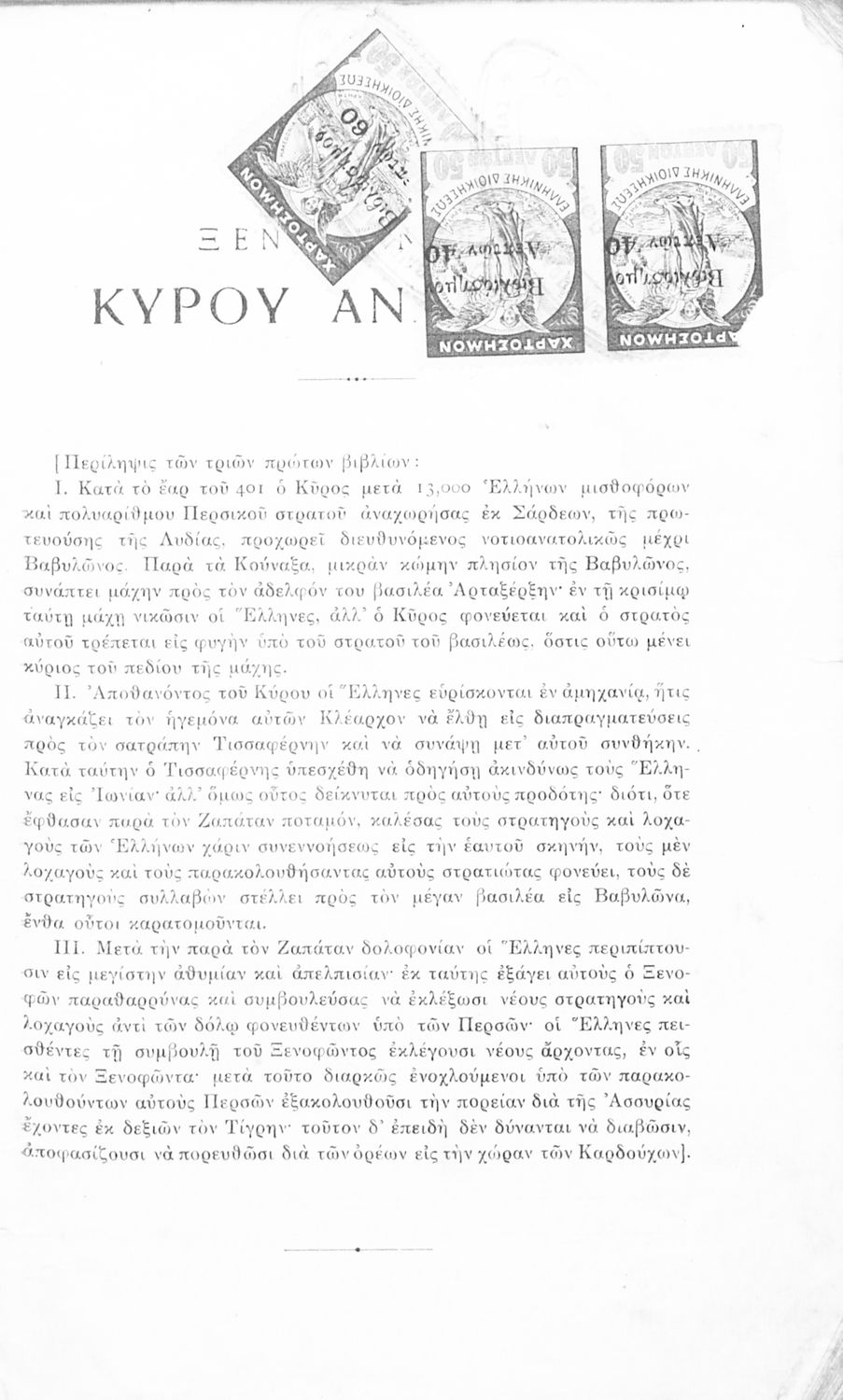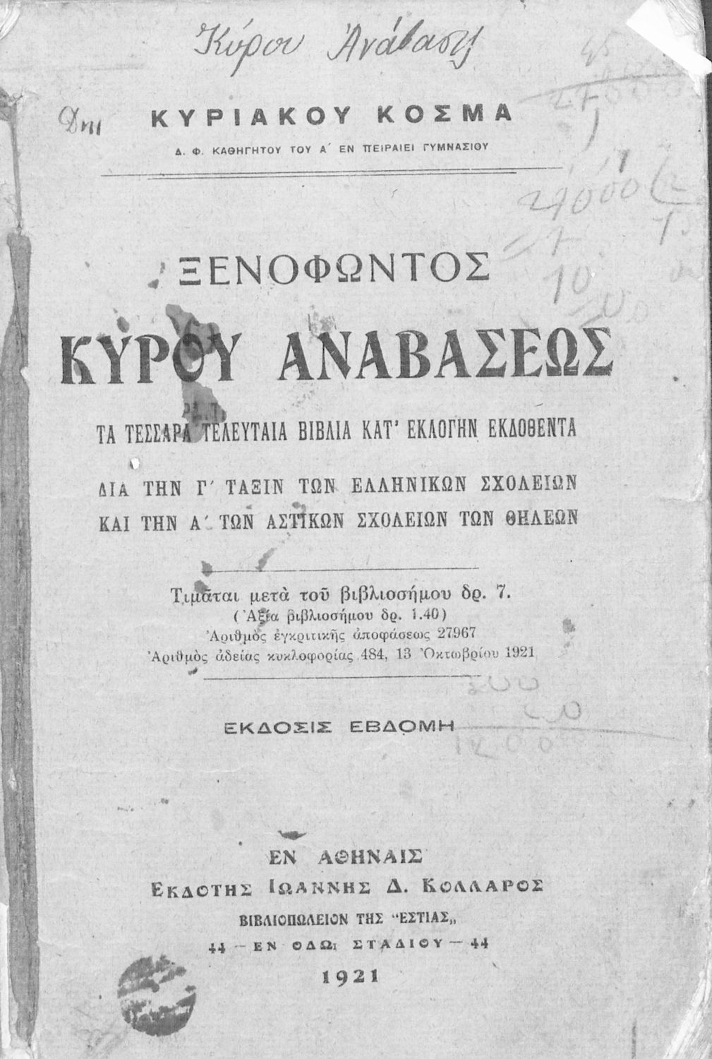 Σχολικό εγχειρίδιο Αρχαίων Ελληνικών για τις Γ΄ Ελληνικού Σχολείου και Α΄ Αστικού Σχολείου Θηλέων που περιλαμβάνει το έργο του Ξενοφώντα Κύρου Ανάβασις, ερμηνευτικά και πραγματολογικά σχόλια και λεξιλογικές ...