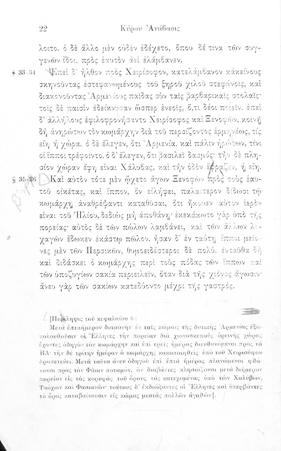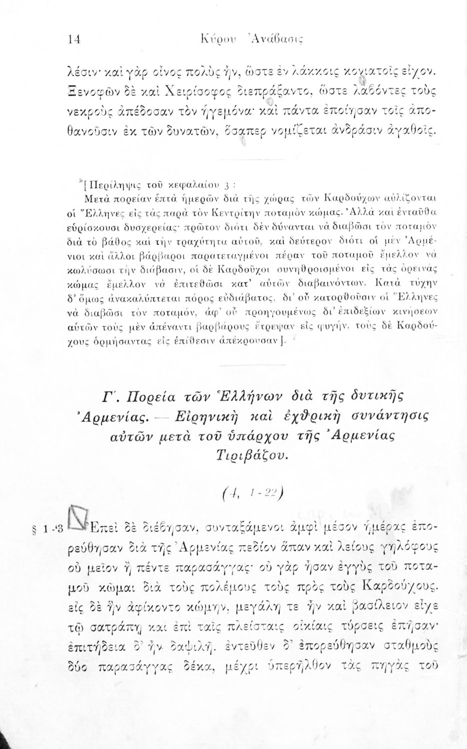 Σχολικό εγχειρίδιο Αρχαίων Ελληνικών Γ' Ελληνικού και Αστικού Σχολείου που περιλαμβάνει το έργο του Ξενοφώντα Κύρου Ανάβασις, εισαγωγικά σχόλια για τη ζωή και το έργο του, ερμηνευτικές και γραμματικές παρατηρήσεις, και πίνακα κυριοτέρων ονομάτων.