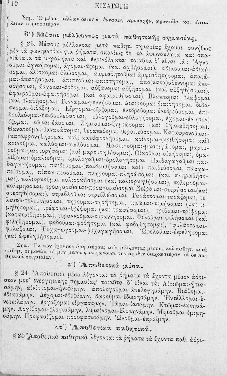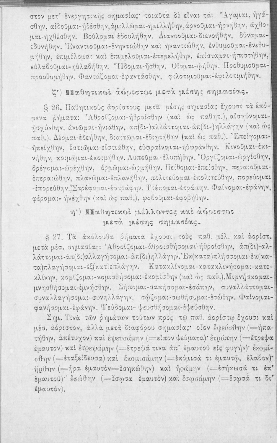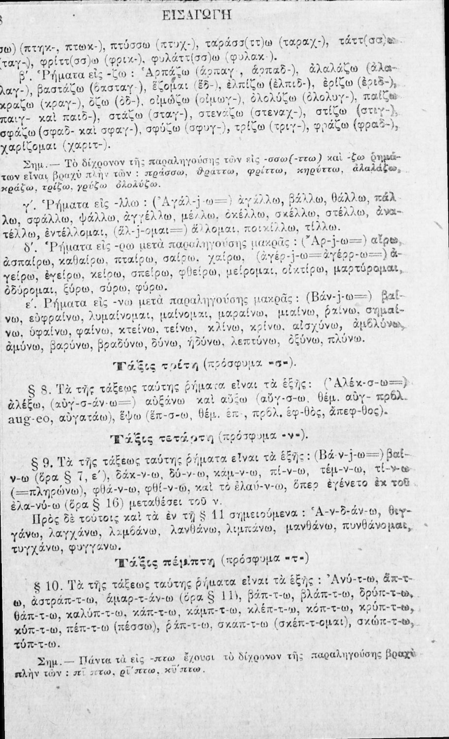 Σχολικό εγχειρίδιο Αρχαίων Ελληνικών για τα Ελληνικά Σχολεία, Παρθεναγωγεία και Γυμνάσια που περιέχει τους κανόνες γραμματικής και είναι χωρισμένο σε φθογγολογικό, τυπολογικό και ετυμολογικό μέρος.