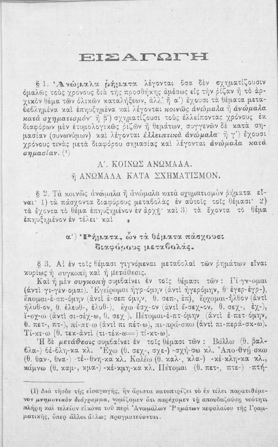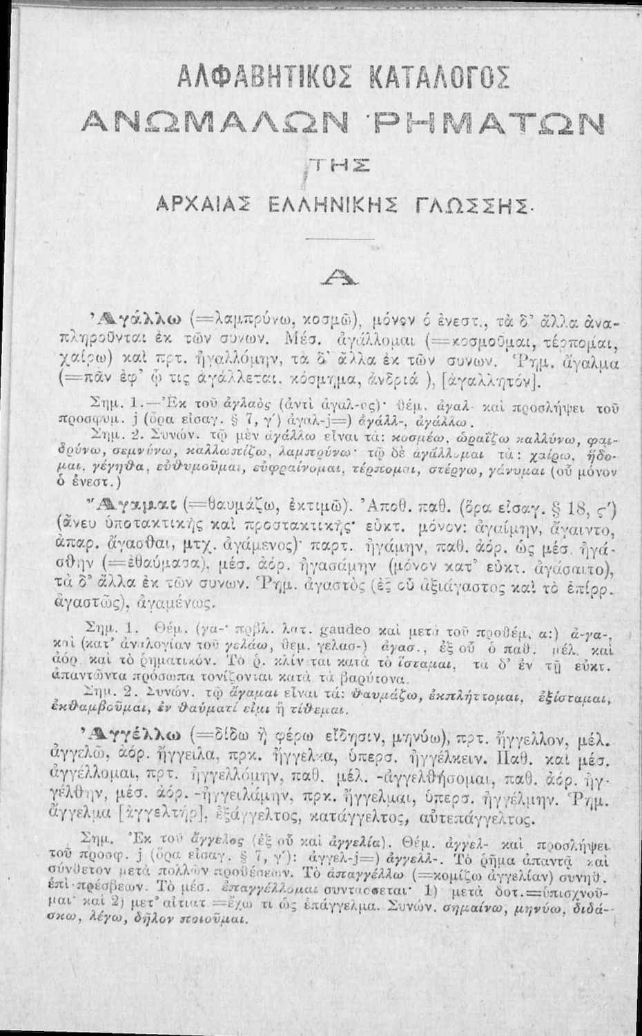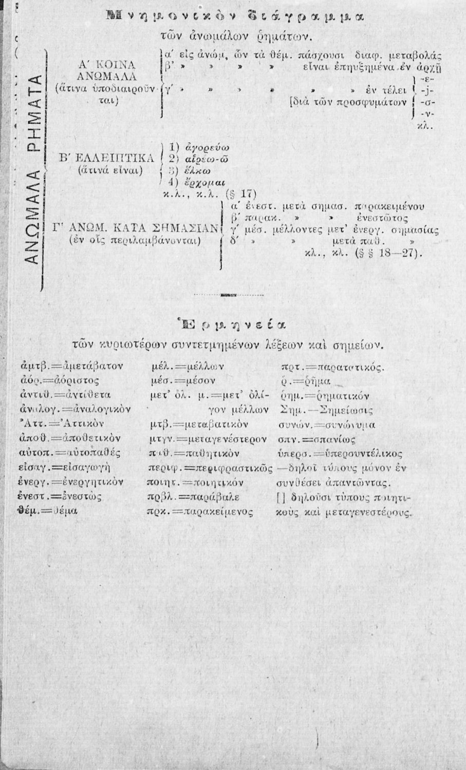 Μαθητικό βοήθημα Αρχαίων Ελληνικών για τα Γυμνάσια, Παρθεναγωγεία και Ελληνικά σχολεία το οποίο περιέχει κατάλογο ανωμάλων ρημάτων της Αττικής διαλέκτου.