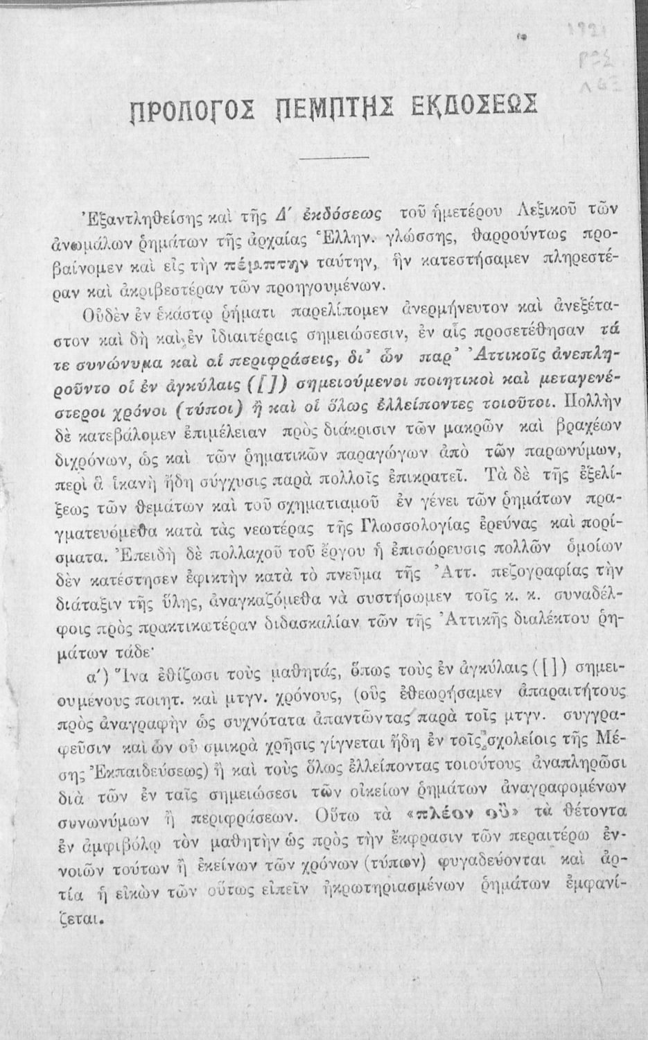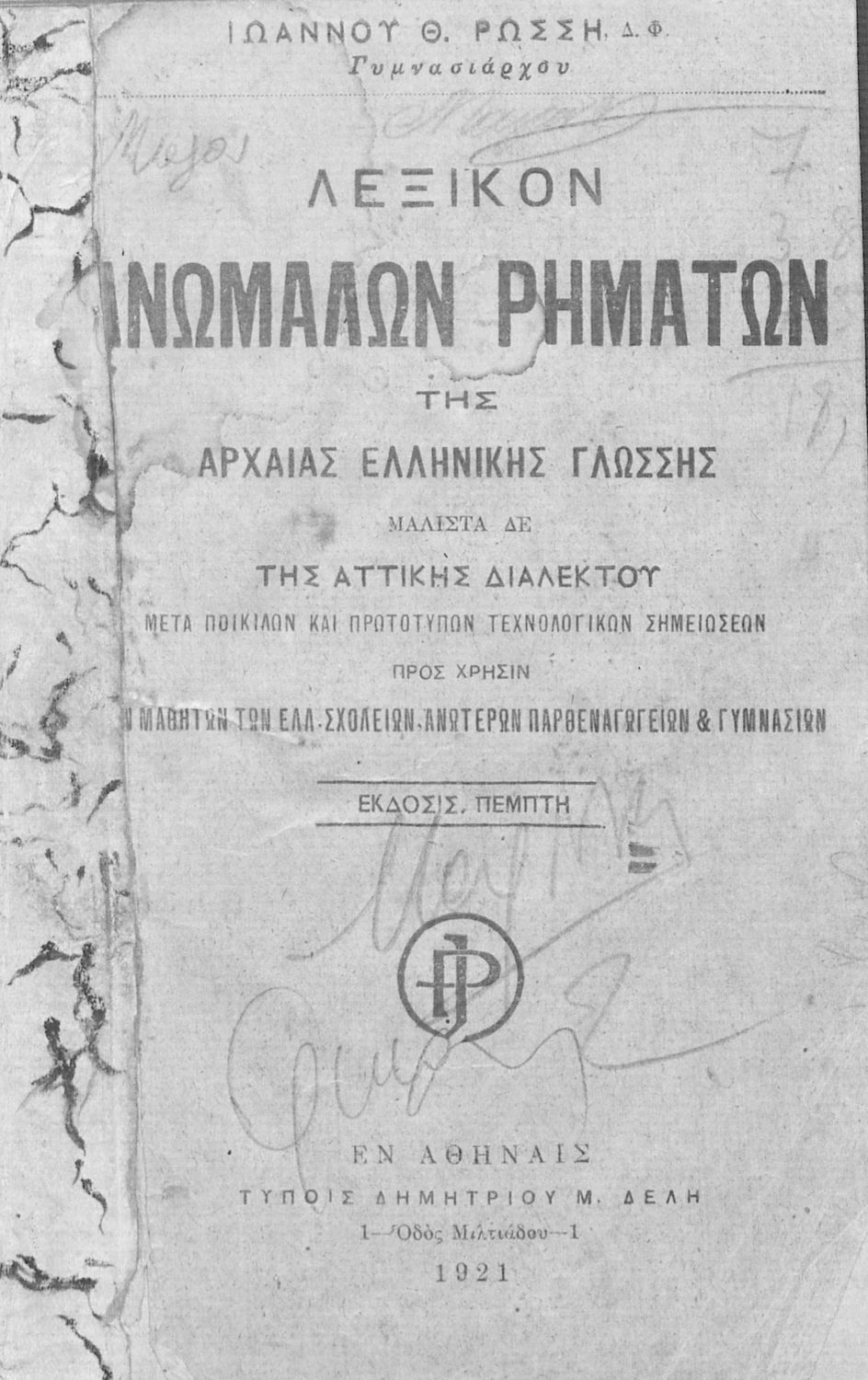 Τίτλος: Λεξικόν ανωμάλων ρημάτων της αρχαίας ελληνικής γλώσσης μάλιστα δε της αττικής διαλέκτου μετά ποικίλων και πρωτοτύπων τεχνολογικών σημειώσεων προς χρήσιν των μαθητών των Ελληνικών Σχολείων, Ανωτέρων Παρθεναγωγείων και Γυμνασίων