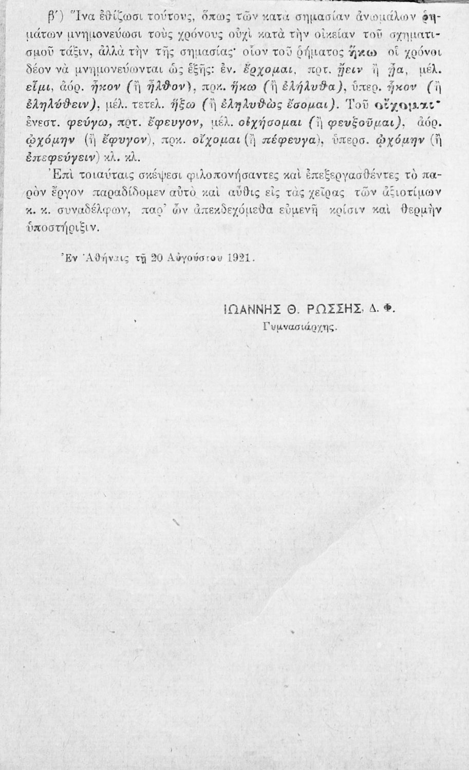 Μαθητικό βοήθημα Αρχαίων Ελληνικών για τους μαθητές των Ημιγυμνασίων, Παρθεναγωγείων, Αστικών σχολείων και Παρθεναγωγείων που περιλαμβάνει κατάλογο ανωμάλων ρημάτων και σειρά σημειώσεων και ασκήσεων για ...