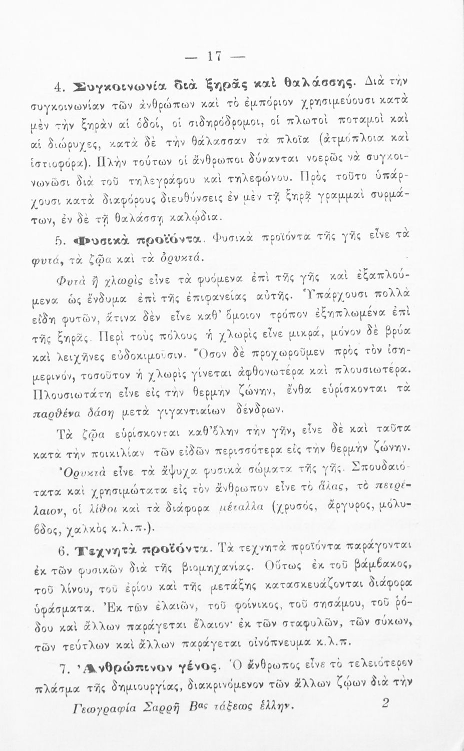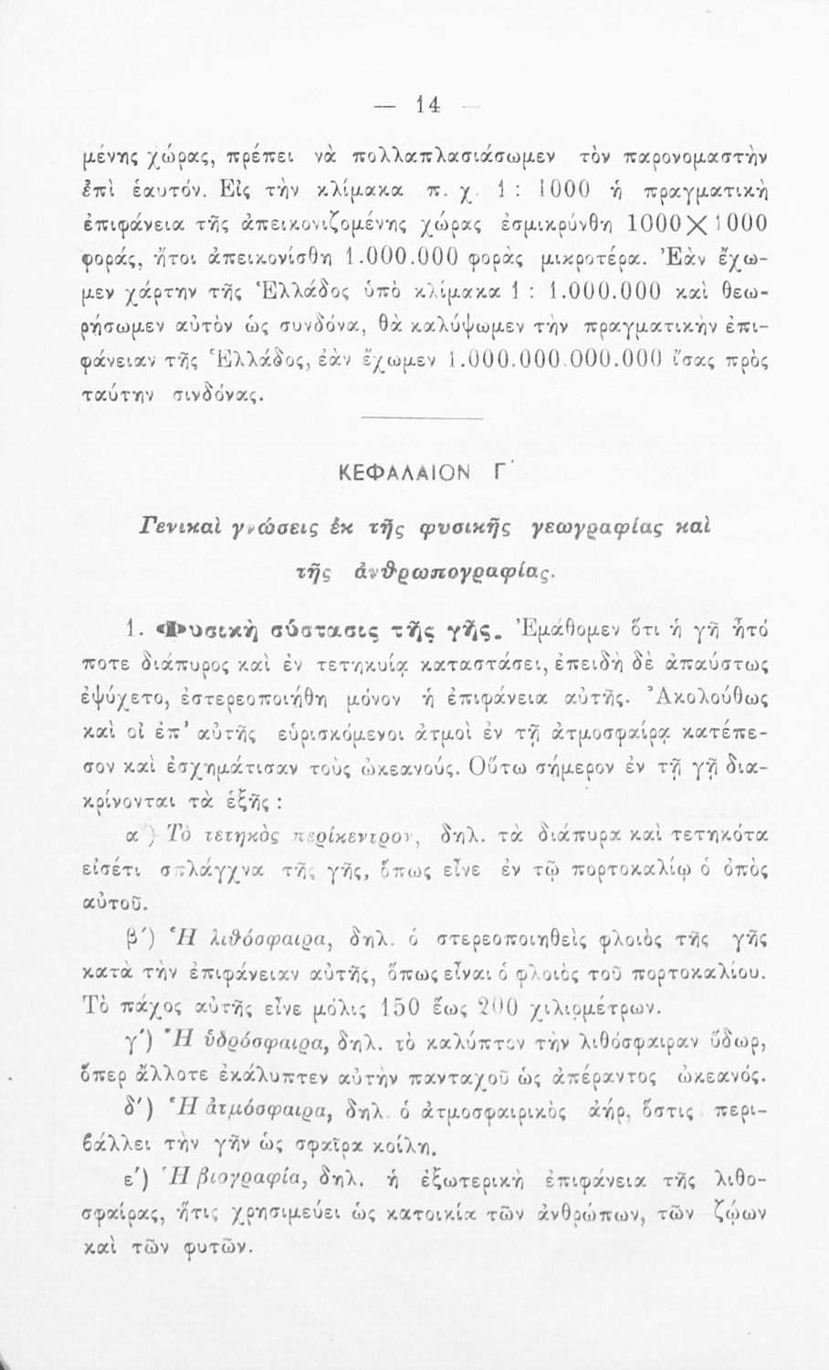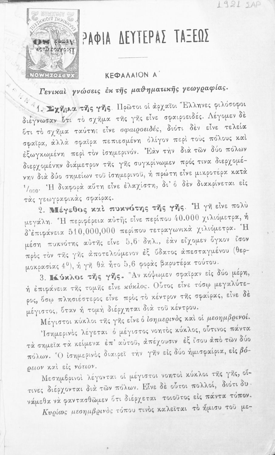 Βαθμίδα εκπαίδευσης: Δευτεροβάθμια Τάξη: Β' Ελληνικού Σχολείου Μάθημα: Γεωγραφία Γλώσσα: Καθαρεύουσα Παρουσίαση περιεχομένου: Σχολικό εγχειρίδιο Γεωγραφίας Β' Ελληνικού Σχολείου που περιλαμβάνει εισαγωγή στη φυσική και μαθηματική γεωγραφία και παρουσιάζει ενδεικτικές χώρες και περιοχές από τις πέντε ηπείρους από γεωμορφολογική, πολιτική και οικονομική σκοπιά. |