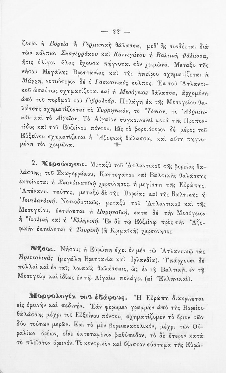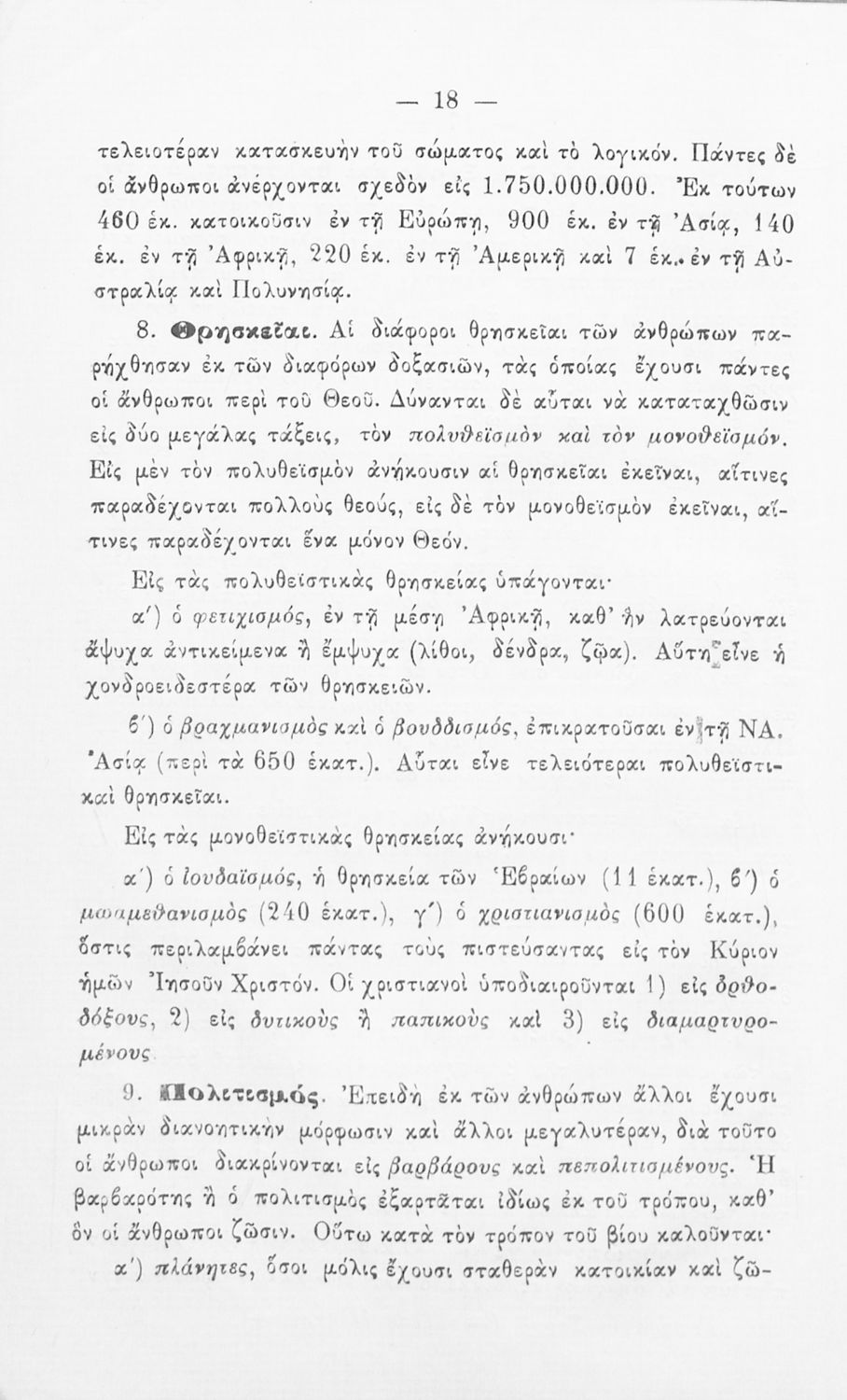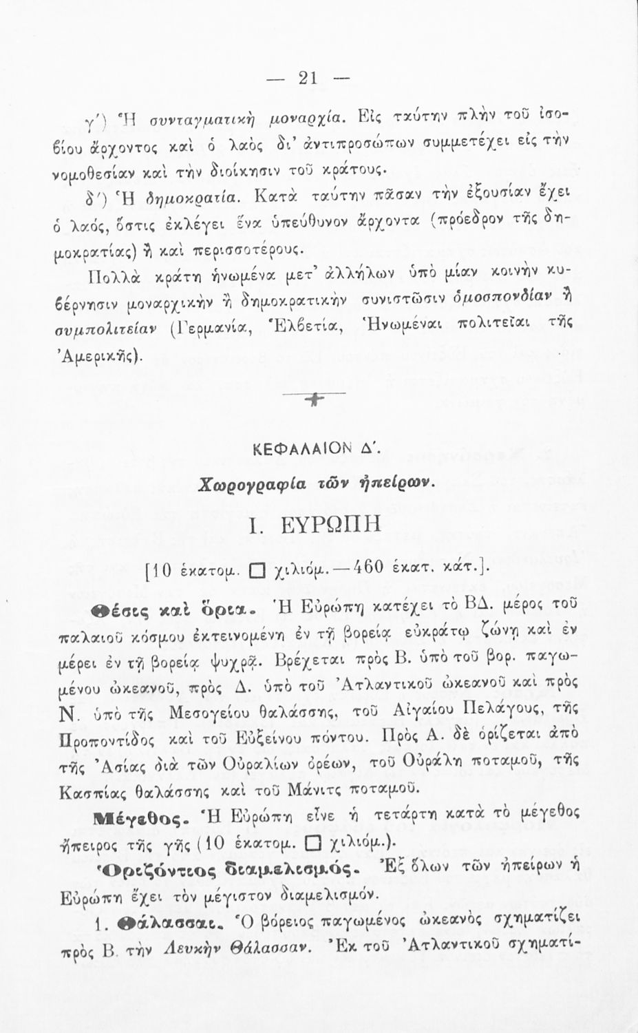Βαθμίδα εκπαίδευσης: Δευτεροβάθμια Τάξη: Β' Ελληνικού Σχολείου Μάθημα: Γεωγραφία Γλώσσα: Καθαρεύουσα Παρουσίαση περιεχομένου: Σχολικό εγχειρίδιο Γεωγραφίας Β' Ελληνικού Σχολείου που περιλαμβάνει εισαγωγή στη φυσική και μαθηματική γεωγραφία και παρουσιάζει ενδεικτικές χώρες και περιοχές από τις πέντε ηπείρους από γεωμορφολογική, πολιτική και οικονομική σκοπιά. |