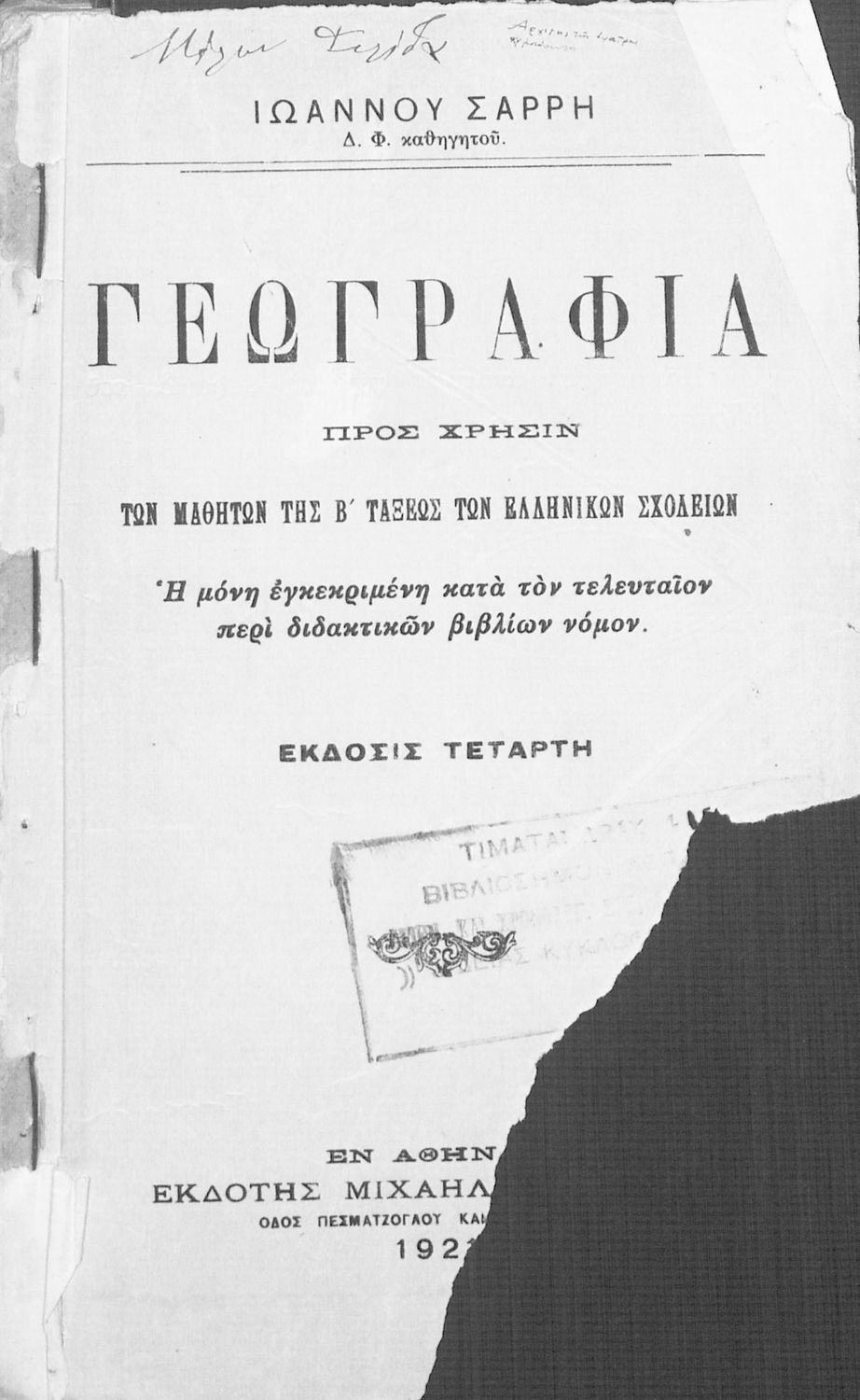Κωδικός αναγνώρισης: 02-01983 Τίτλος: Γεωγραφία προς χρήσιν των μαθητών της Β΄ τάξεως των Ελληνικών Σχολείων η μόνη εγκεκριμένη κατά τον τελευταίον περί διδακτικών βιβλίων νόμον Συγγραφέας: Ιωάννης Σαρρής Μέγεθος και υπόστρωμα: Σχολικό εγχειρίδιο, σκληρό εξώφυλλο, 106 σελίδες. Εικόνες (ασπρόμαυρες), σκίτσα (ασπρόμαυρα). |