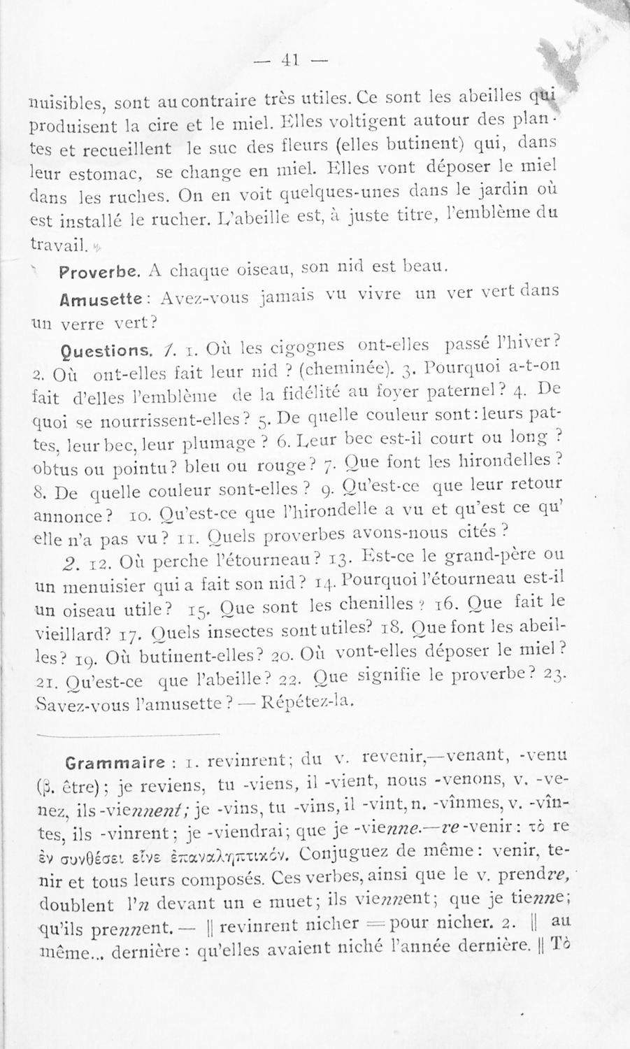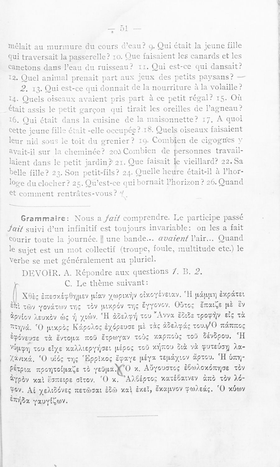 Σχολικό εγχειρίδιο Γαλλικών των Γυμνασίων, Αστικών σχολείων, Παρθεναγωγείων, Διδασκαλείων και Εμπορικών σχολών το οποίο παρουσιάζει τους βασικούς κανόνες γραμματικής μέσα από ασκήσεις και σειρά κειμένων υιοθετώντας της μέθοδο της εποπτικής και πρακτικής διδασκαλίας.