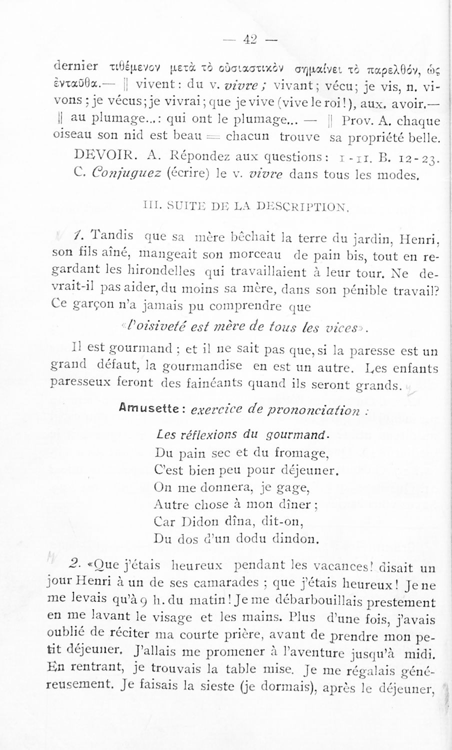 Σχολικό εγχειρίδιο Γαλλικών που περιλαμβάνει κείμενα, λεξιλόγιο και ασκήσεις. Ο συγγραφέας ήταν καθηγητής της Δημόσιας Εμπορικής Σχολής Αθηνών και του Αρσακείου.