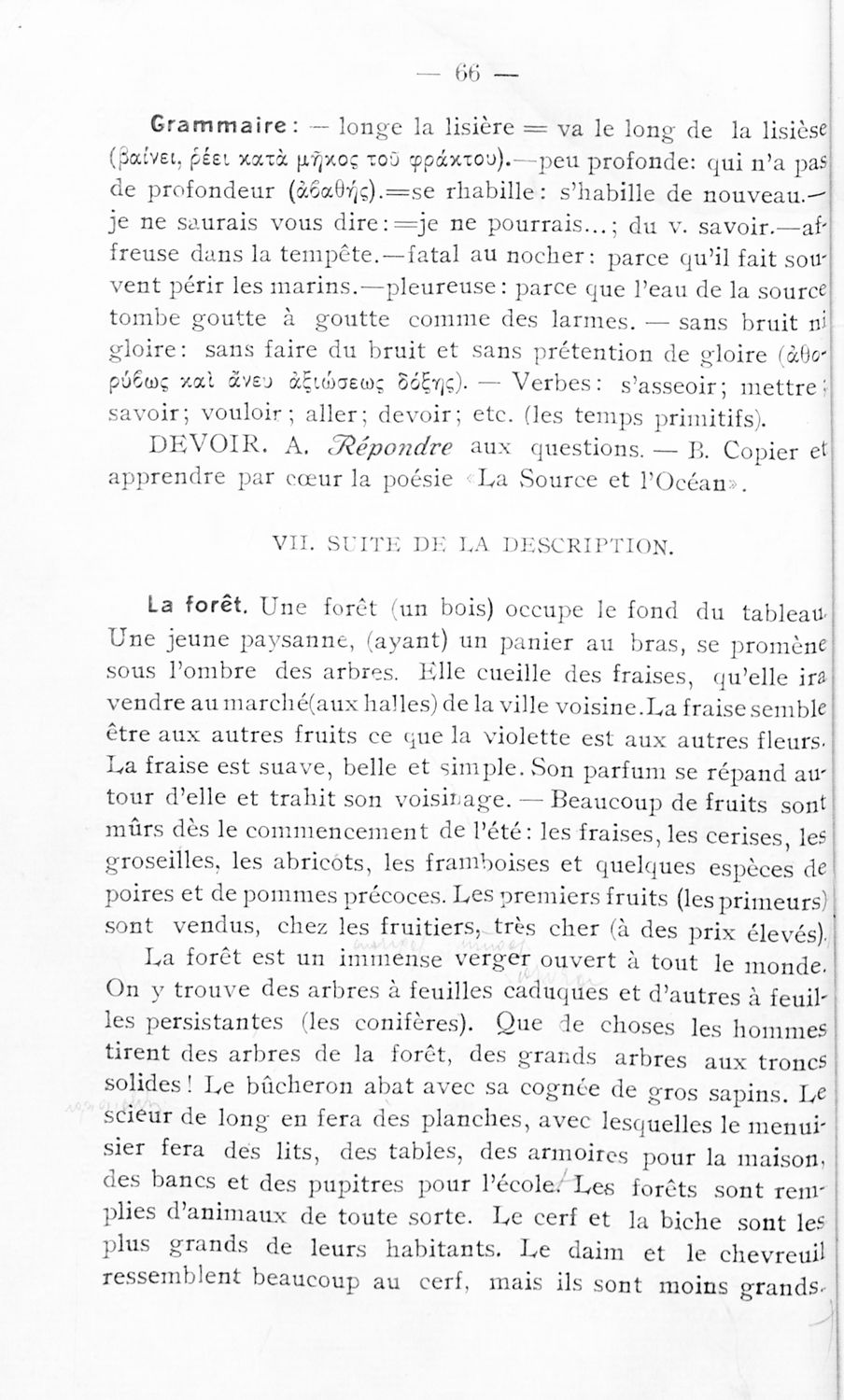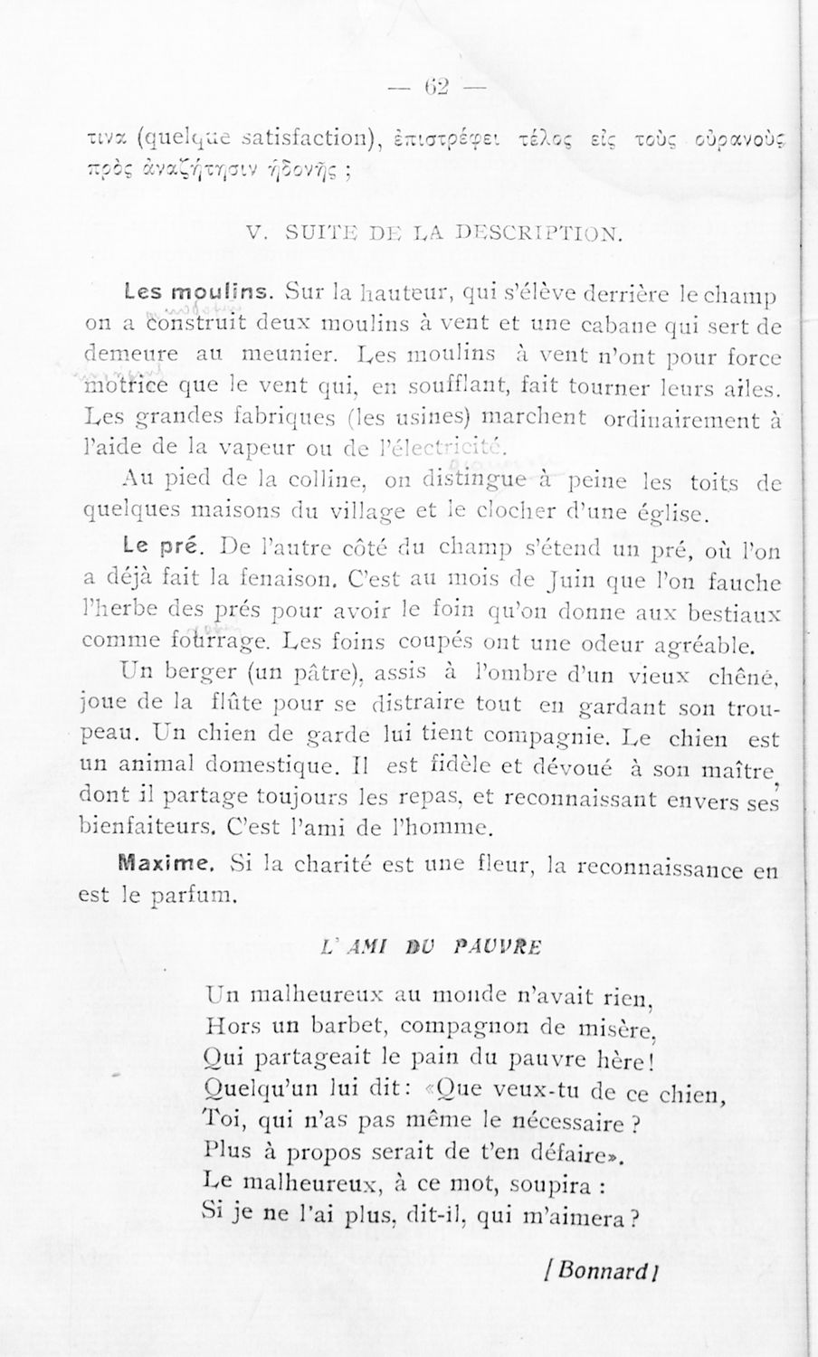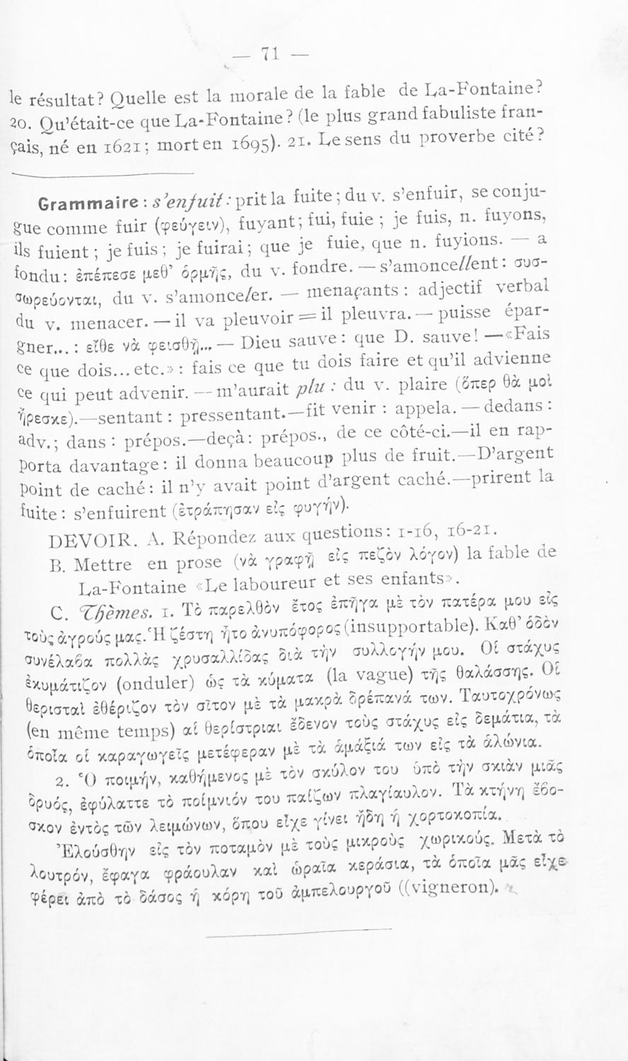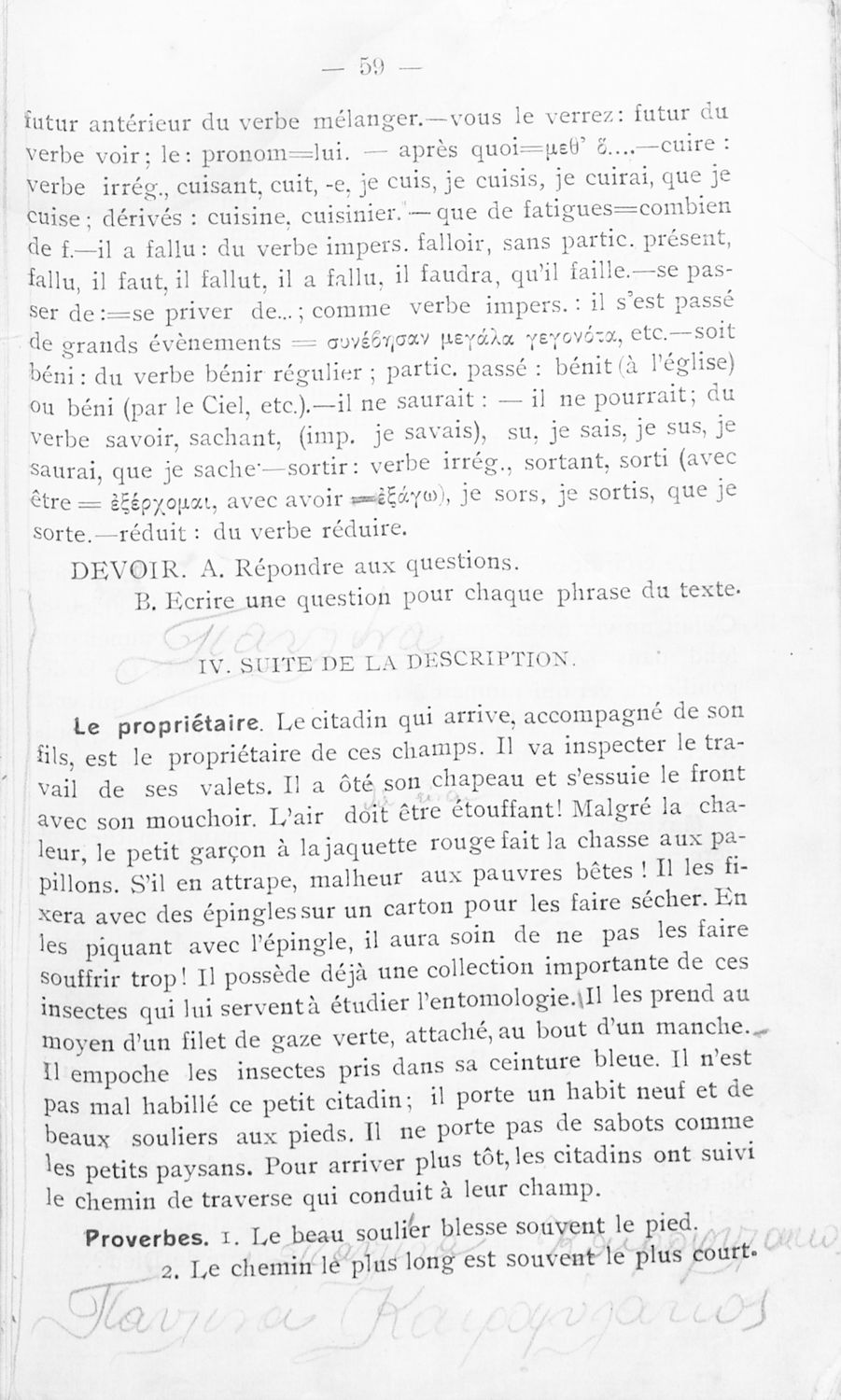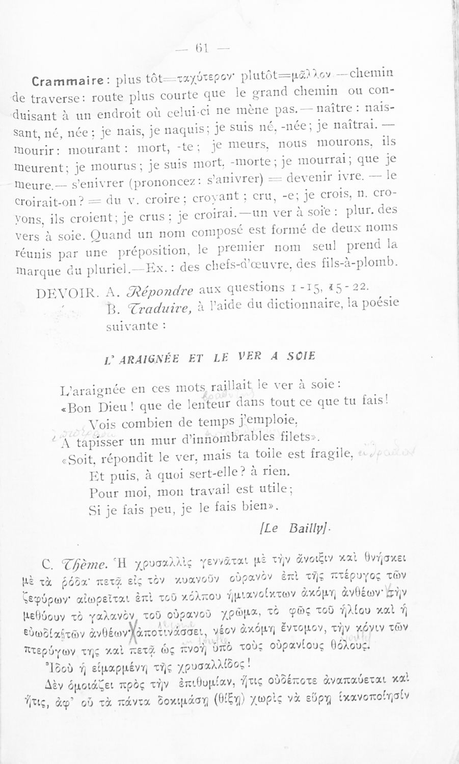 Σχολικό εγχειρίδιο Γαλλικών που περιλαμβάνει κείμενα, λεξιλόγιο και ασκήσεις. Ο συγγραφέας ήταν καθηγητής της Δημόσιας Εμπορικής Σχολής Αθηνών και του Αρσακείου.