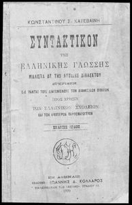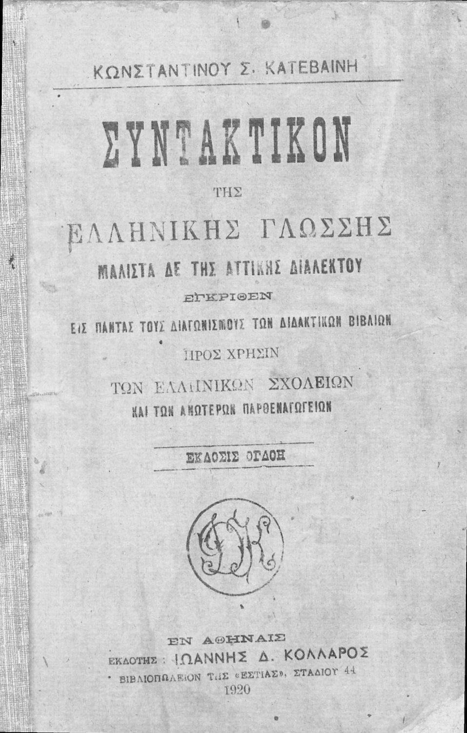 Κωδικός αναγνώρισης: 02-01998 Τίτλος: Συντακτικόν της ελληνικής γλώσσης μάλιστα δε της αττικής διαλέκτου Συγγραφέας: Κωνσταντίνος Σ. Κατεβαίνης Μέγεθος και υπόστρωμα: Σχολικό εγχειρίδιο, σκληρό εξώφυλλο, 56 σελίδες. |