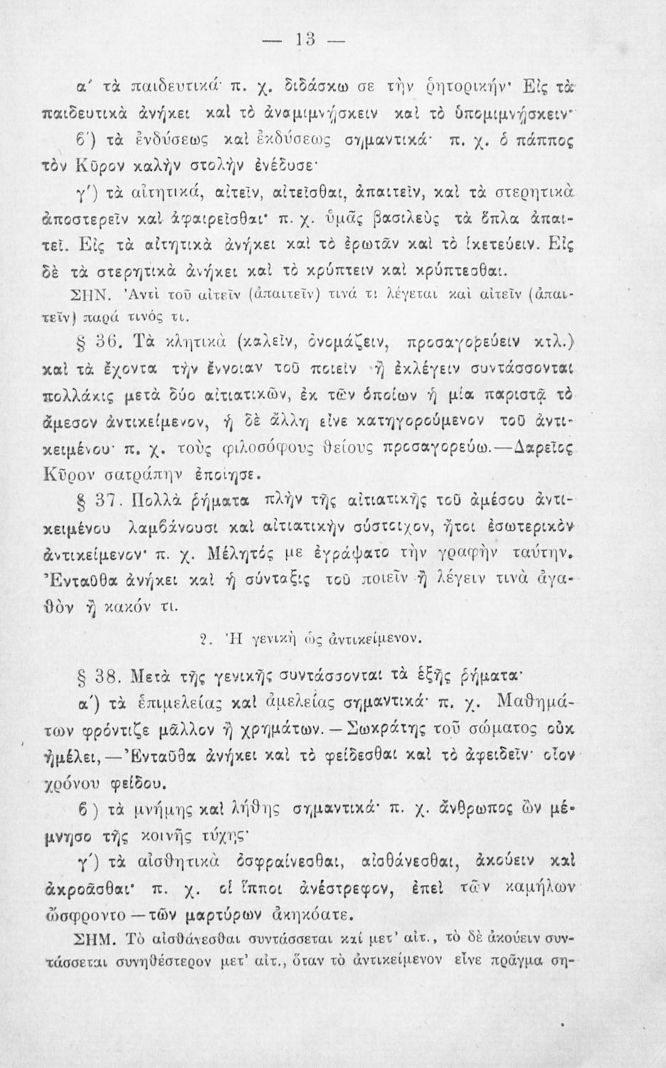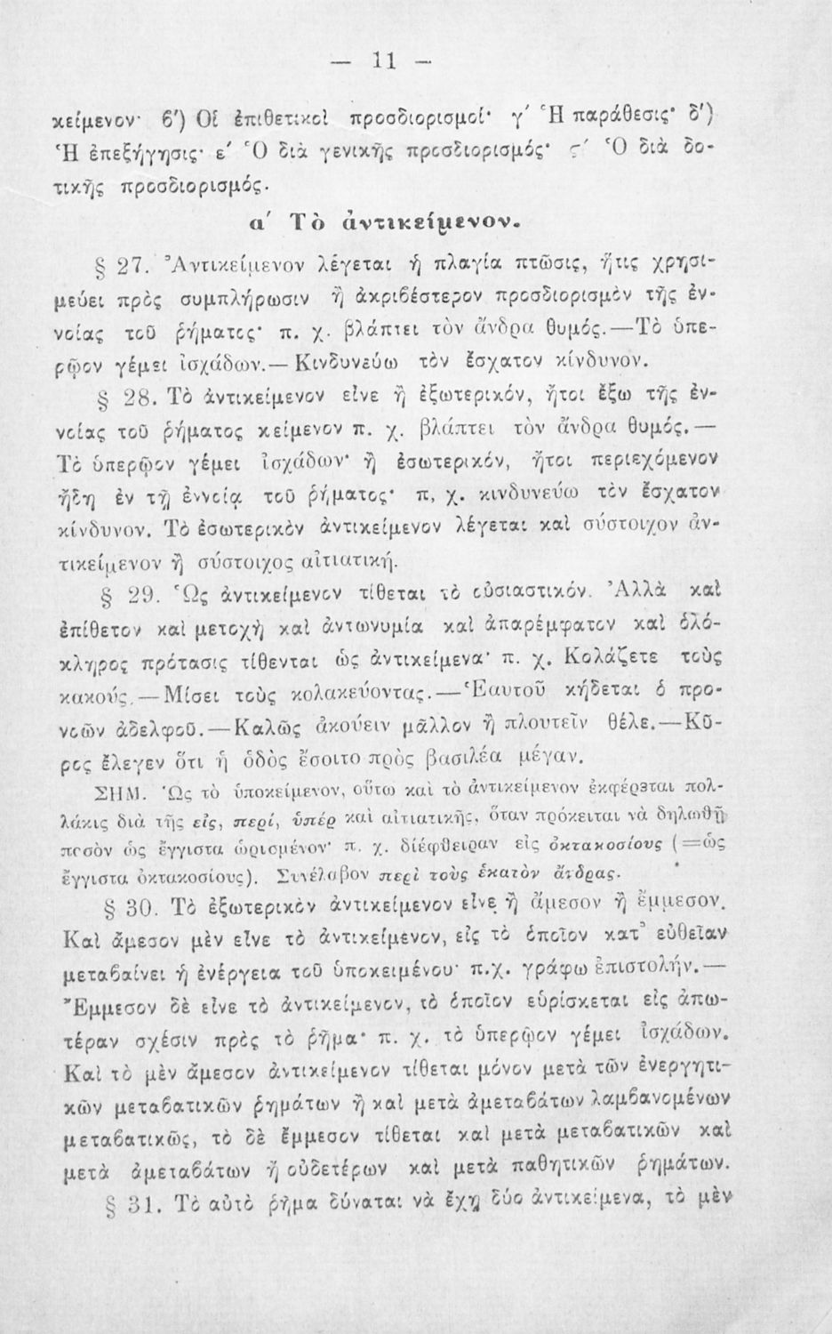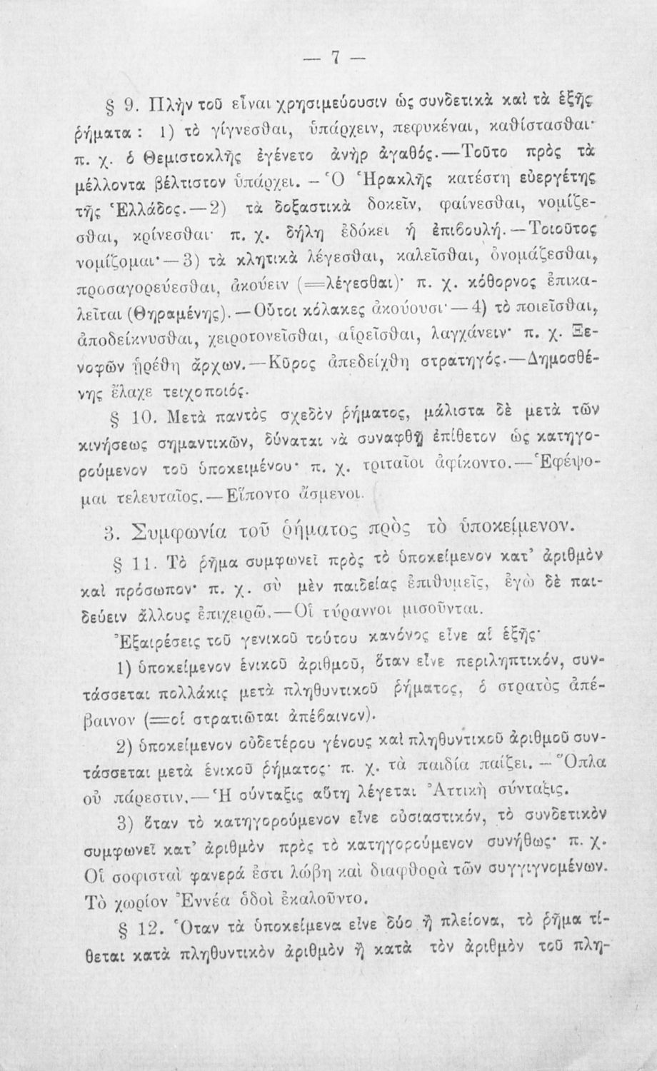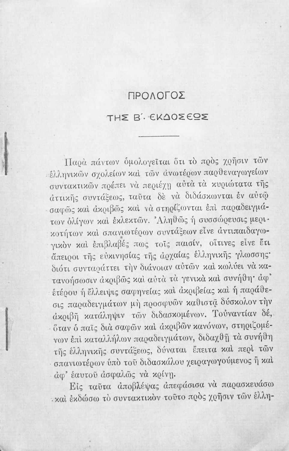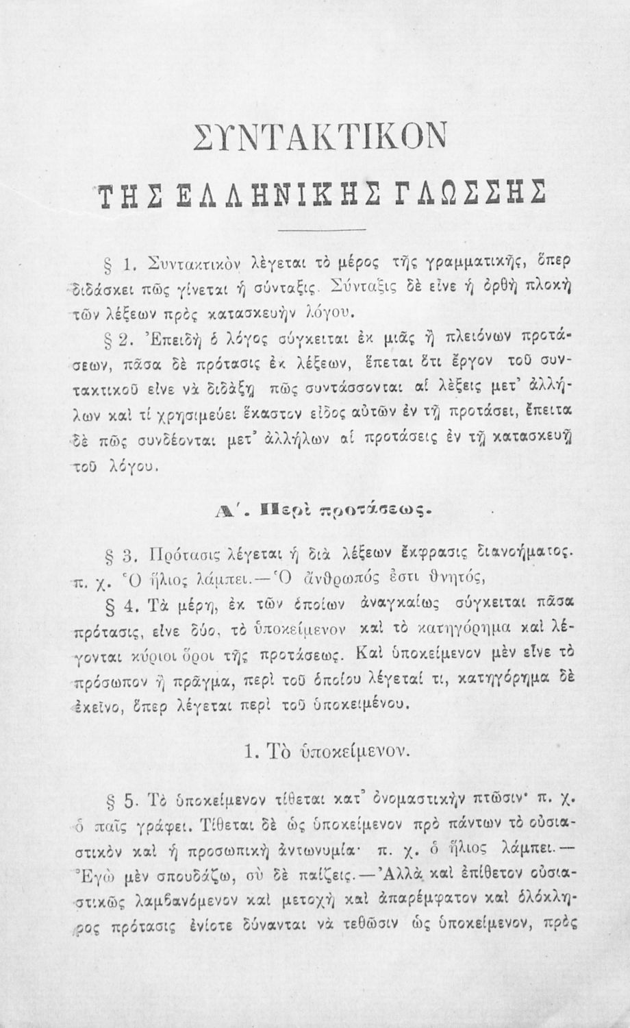 Βαθμίδα εκπαίδευσης: Δευτεροβάθμια Τάξη: Γυμνάσιο Μάθημα: Αρχαία Ελληνικά Γλώσσα: Καθαρεύουσα Παρουσίαση περιεχομένου: Σχολικό εγχειρίδιο Αρχαίων Ελληνικών που εστιάζει στα μέρη του λόγου και στην σύνταξή τους. |