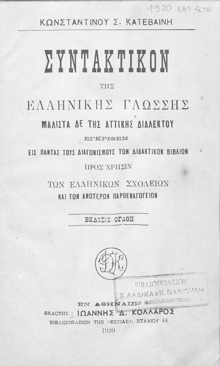 Εκδότης: Ιωάννης Δ. Κολλάρος Έτος έκδοσης: 1920 Τόπος έκδοσης: Αθήνα Έκδοση: 8η Υπουργική απόφαση / Σύμβαση: 8130/ |