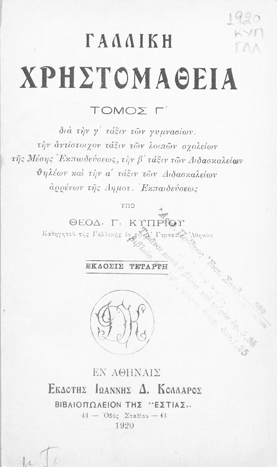 Τίτλος: Γαλλική χρηστομάθεια, Τόμος Γ΄ διά την Γ΄ τάξιν των Γυμνασίων, την αντίστοιχον τάξιν των λοιπών σχολείων της Μέσης Εκπαιδεύσεως, την Β΄ τάξιν των Διδασκαλείων Θηλέων και την Α΄ τάξιν των Διδασκαλείων Αρρένων της Δημοτικής Εκπαιδεύσεως