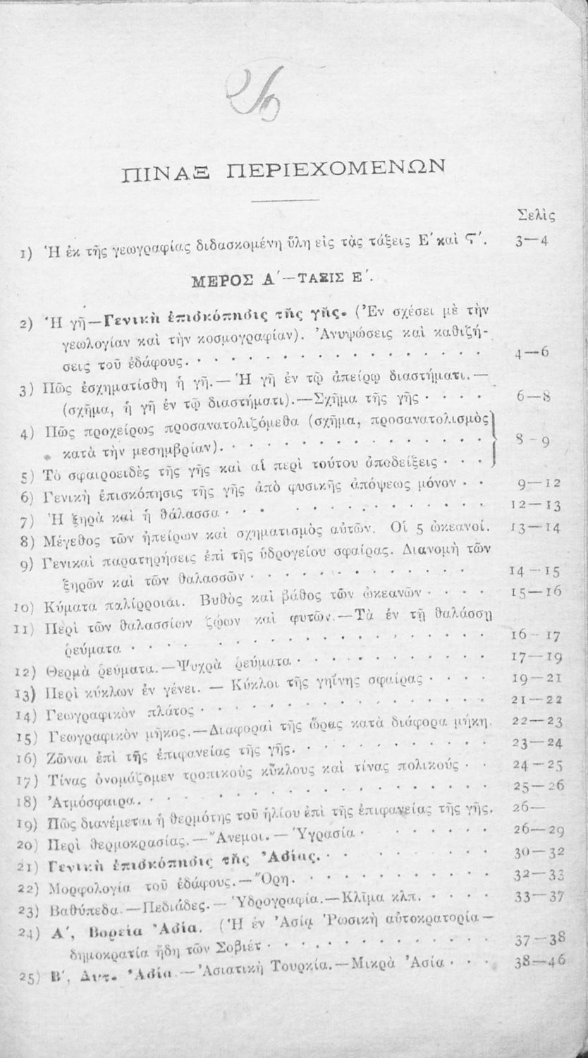 Παρουσίαση περιεχομένου: Σχολικό εγχειρίδιο Γεωγραφίας για τις Ε΄ και ΣΤ΄ Δημοτικού που περιλαμβάνει στοιχεία μαθηματικής και φυσικής γεωγραφίας, γεωλογίας και κοσμογραφίας, και εξετάζει την Ελλάδα και ενδεικτικές χώρες από τις πέντε ηπείρους. Περιέχει και αναφορά στις "αλύτρωτες ελληνικές χώρες" στις οποίες περιλαμβάνει την Σερβική και Βουλγαρική Μακεδονία, τη Βόρεια Ήπειρο, τη Θράκη, τη Μικρά Ασία και την Κύπρο.