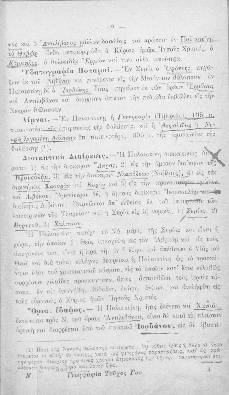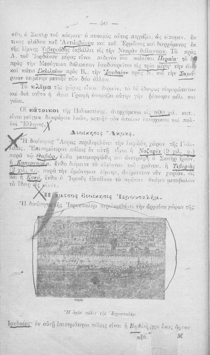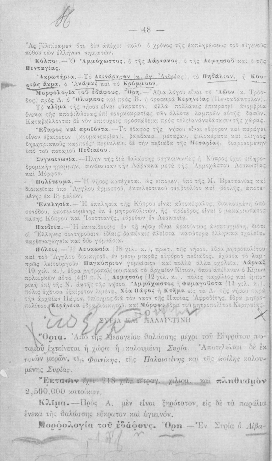 520 ## _aΣχολικό εγχειρίδιο Γεωγραφίας για τις Ε΄ και ΣΤ΄ Δημοτικού που περιλαμβάνει στοιχεία μαθηματικής και φυσικής γεωγραφίας, γεωλογίας και κοσμογραφίας, και εξετάζει την Ελλάδα και ενδεικτικές χώρες από τις πέντε ηπείρους. Περιέχει και αναφορά στις "αλύτρωτες ελληνικές χώρες" στις οποίες περιλαμβάνει την Σερβική και Βουλγαρική Μακεδονία, τη Βόρεια Ήπειρο, τη Θράκη, τη Μικρά Ασία και την Κύπρο.