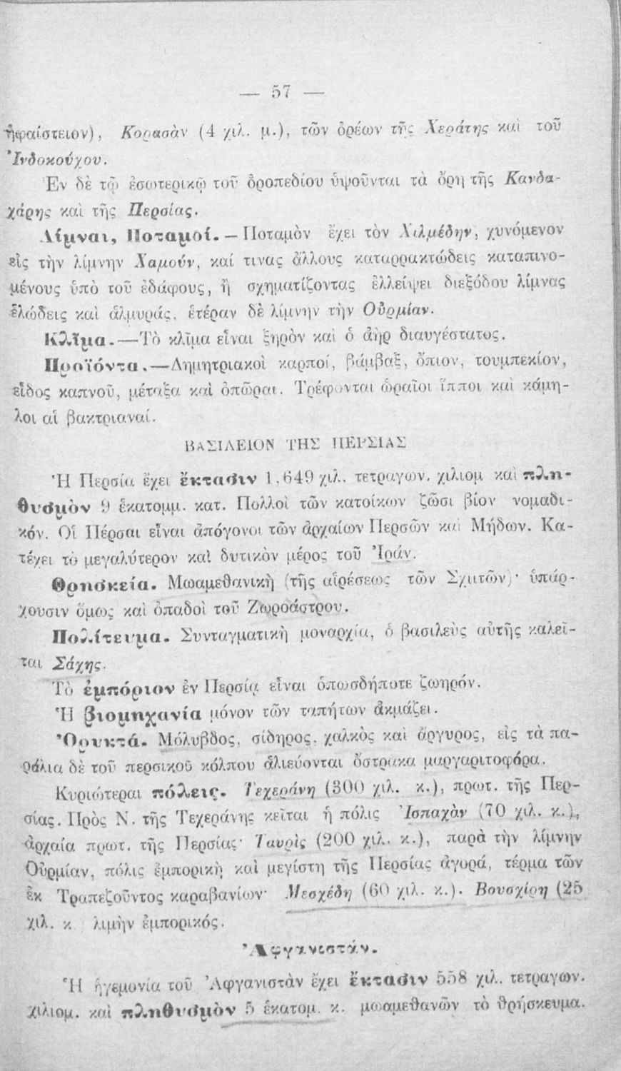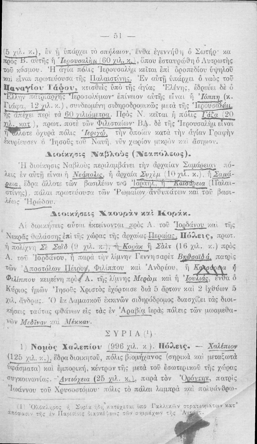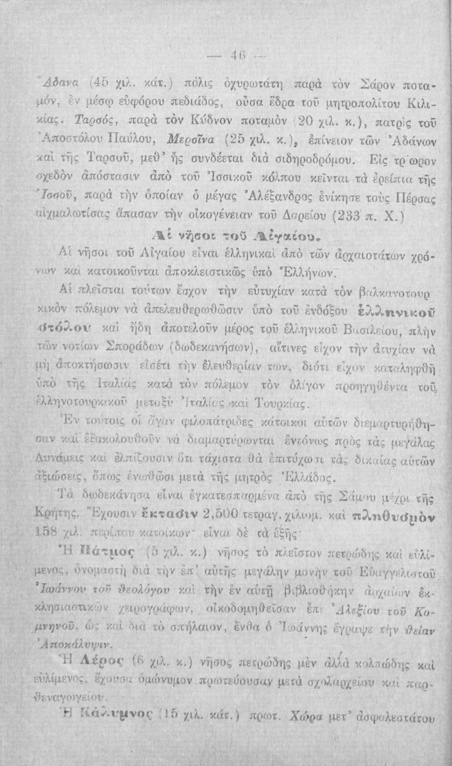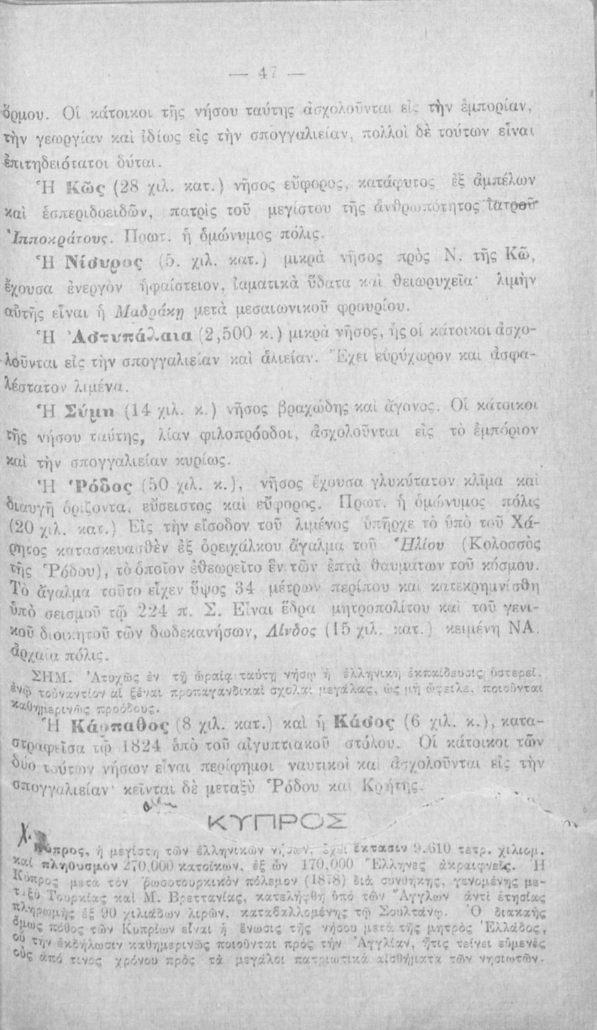 520 ## _aΣχολικό εγχειρίδιο Γεωγραφίας για τις Ε΄ και ΣΤ΄ Δημοτικού που περιλαμβάνει στοιχεία μαθηματικής και φυσικής γεωγραφίας, γεωλογίας και κοσμογραφίας, και εξετάζει την Ελλάδα και ενδεικτικές χώρες από τις πέντε ηπείρους. Περιέχει και αναφορά στις "αλύτρωτες ελληνικές χώρες" στις οποίες περιλαμβάνει την Σερβική και Βουλγαρική Μακεδονία, τη Βόρεια Ήπειρο, τη Θράκη, τη Μικρά Ασία και την Κύπρο.