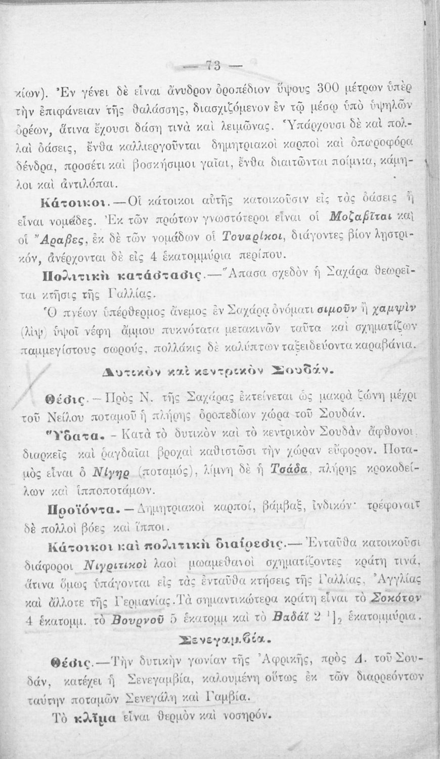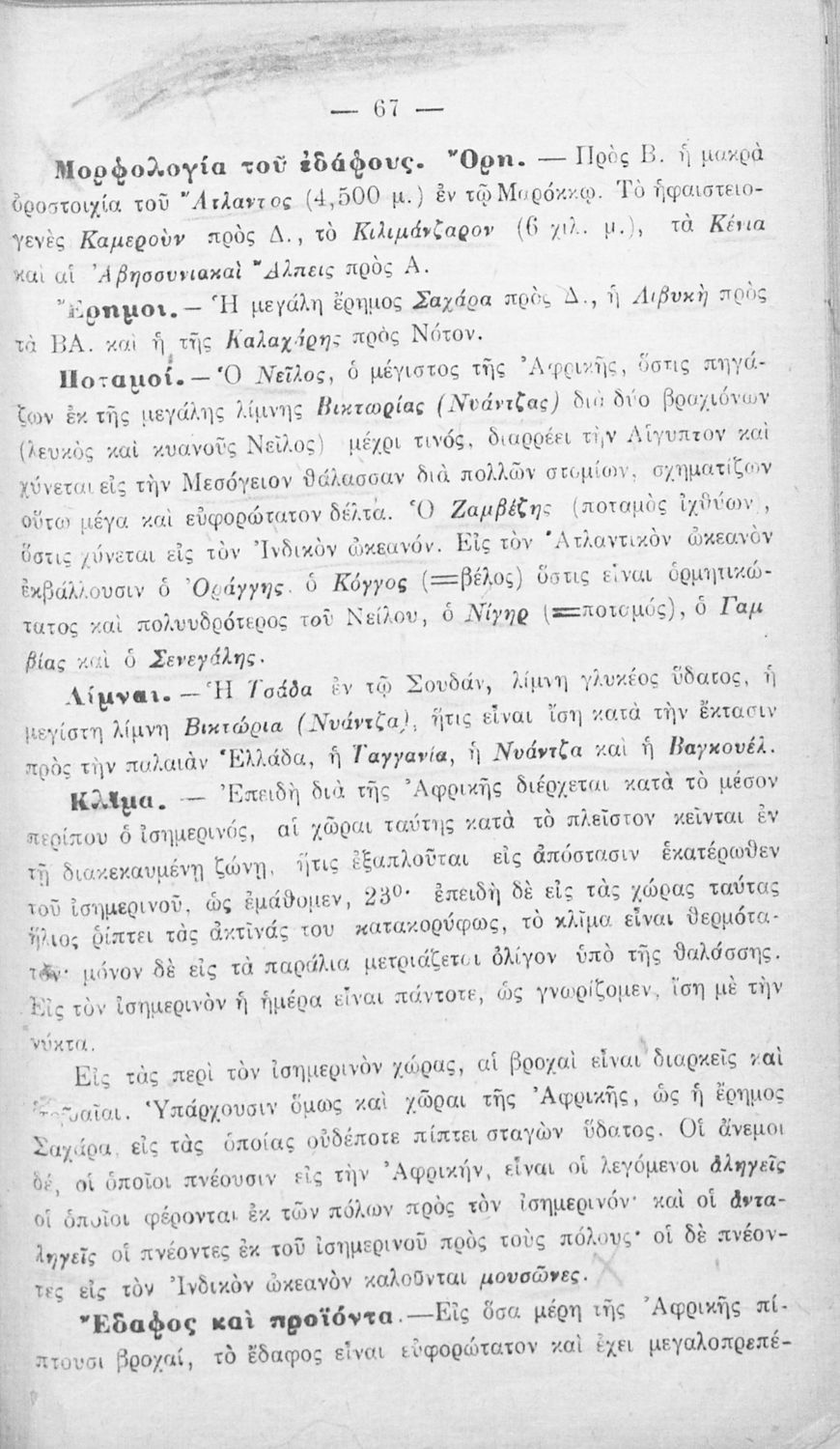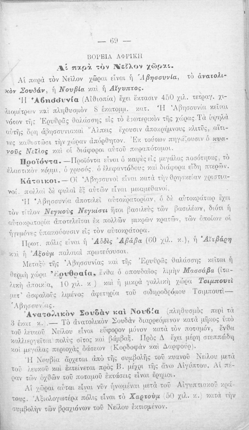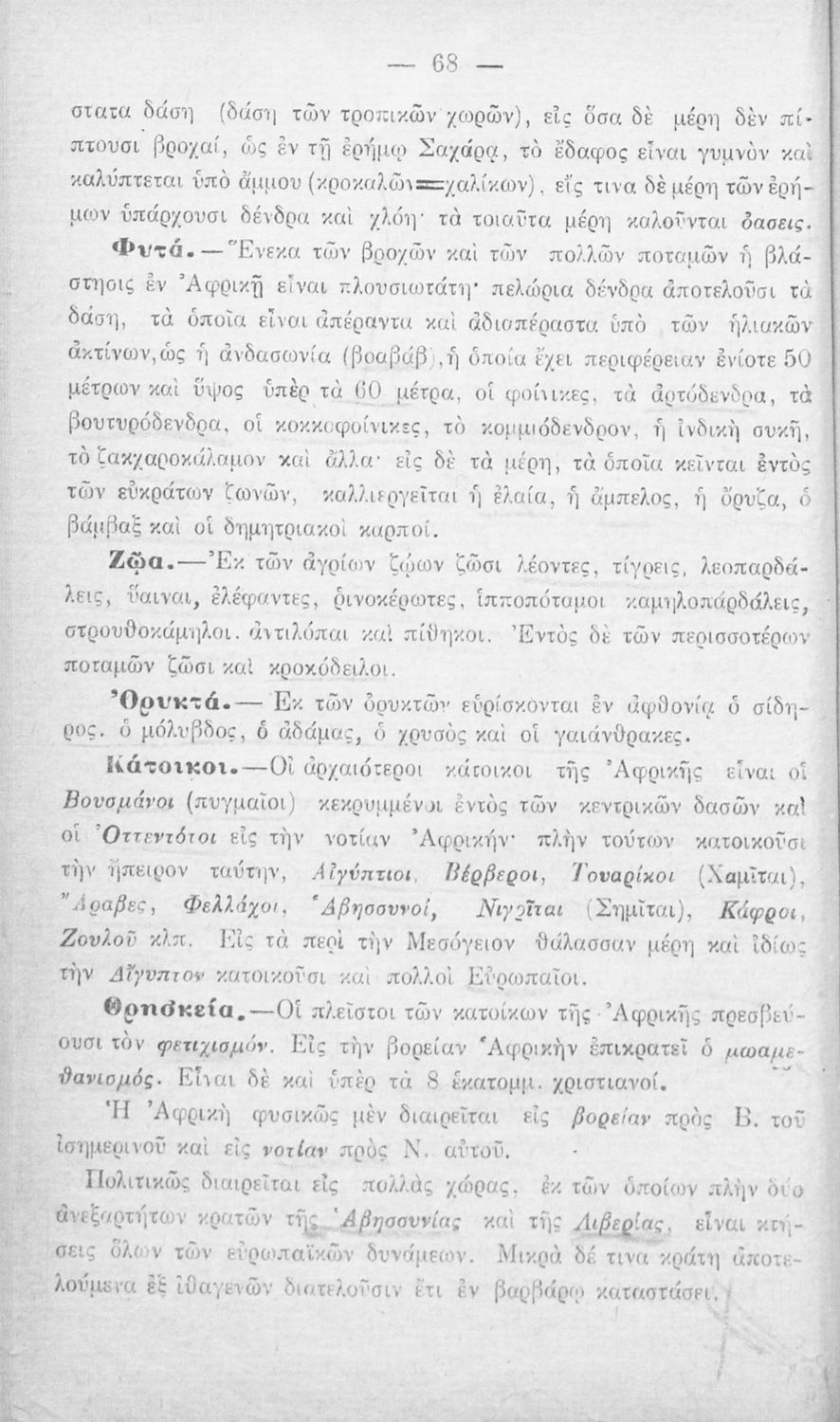 Σχολικό εγχειρίδιο Γεωγραφίας για τα Παρθεναγωγεία και τα Ελληνικά Σχολεία που περιλαμβάνει εισαγωγή στη φυσική, μαθηματική και πολιτική γεωγραφία και εξετάζει την Ελλάδα και ενδεικτικές χώρες και περιοχές από