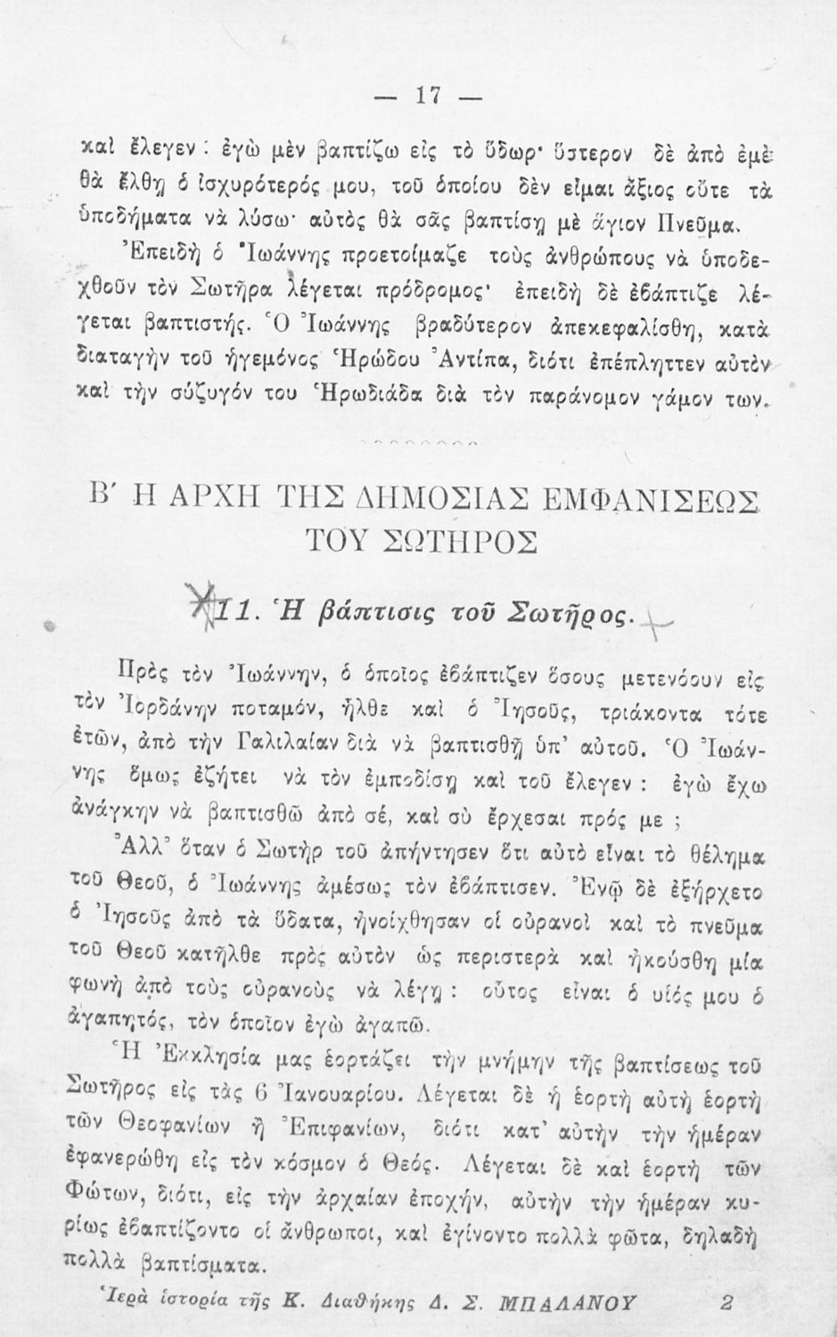 Κωδικός αναγνώρισης: 02-02003 Τίτλος: Ιερά ιστορία της Καινής Διαθήκης προς χρήσιν των μαθητών των Ελληνικών Σχολείων και Παρθεναγωγείων Συγγραφέας: Δημήτριος Σίμος Μπαλάνος Μέγεθος και υπόστρωμα: Σχολικό εγχειρίδιο, μαλακό εξώφυλλο, 94 σελίδες. Εικόνες (ασπρόμαυρες), σκίτσα (ασπρόμαυρα), χάρτες (ασπρόμαυροι). |