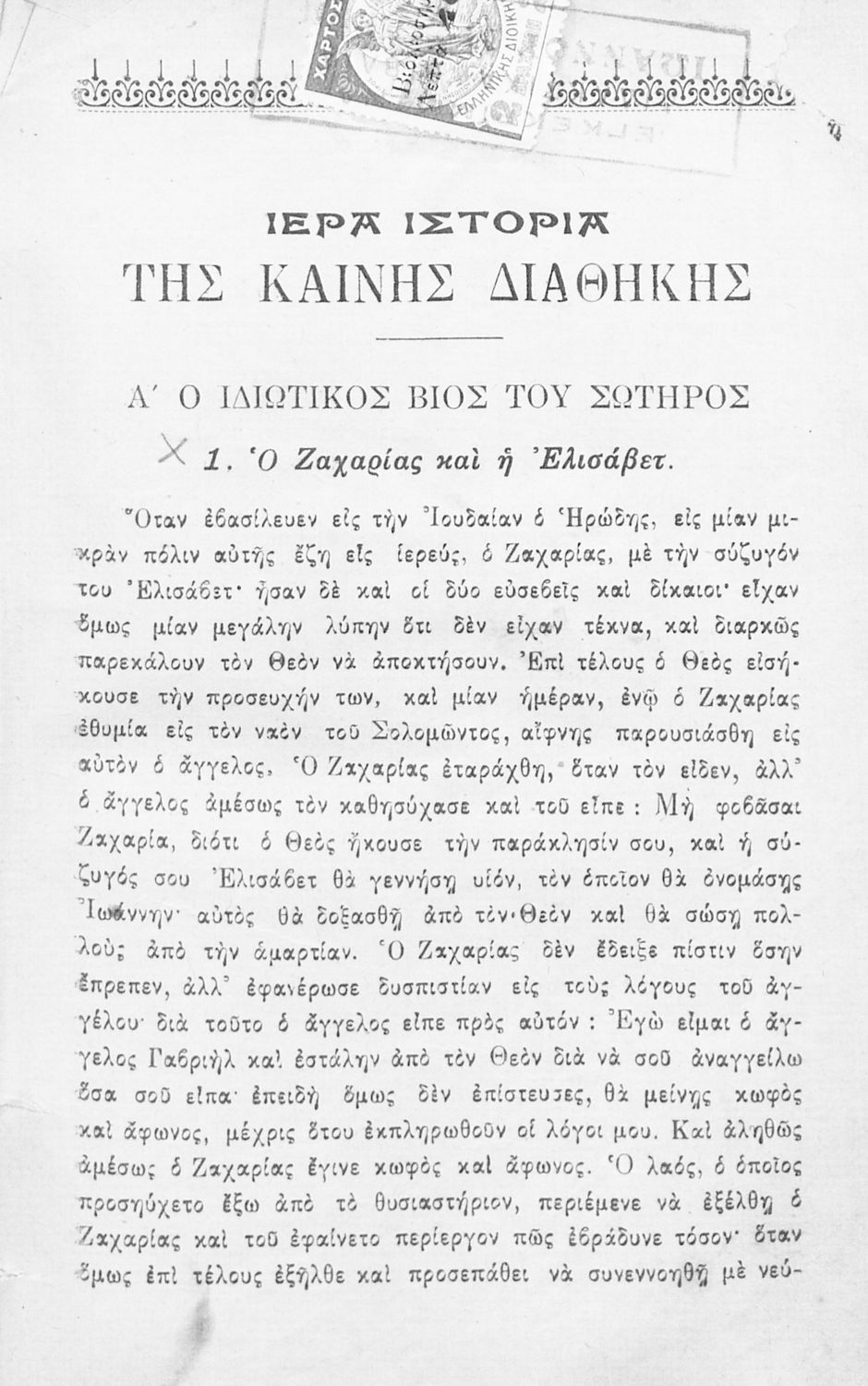 Σχολικό εγχειρίδιο Θρησκευτικών για τα Ελληνικά Σχολεία και Παρθεναγωγεία που συνιστά μία εξιστόρηση της Καινής Διαθήκης από τη γέννηση της Θεοτόκου ως την ανάληψη του Χριστού και τη δράση των Αποστόλων.