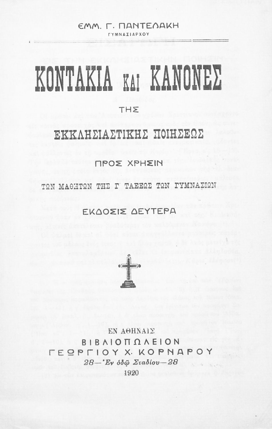 Κωδικός αναγνώρισης: 02-02008 Τίτλος: Κοντάκια και κανόνες της εκκλησιαστικής ποιήσεως προς χρήσιν των μαθητών της Γ΄ τάξεως των Γυμνασίων Συγγραφέας: Εμμανουήλ Γ. Παντελάκης Μέγεθος και υπόστρωμα: Σχολικό εγχειρίδιο, μαλακό εξώφυλλο, 48 σελίδες. |