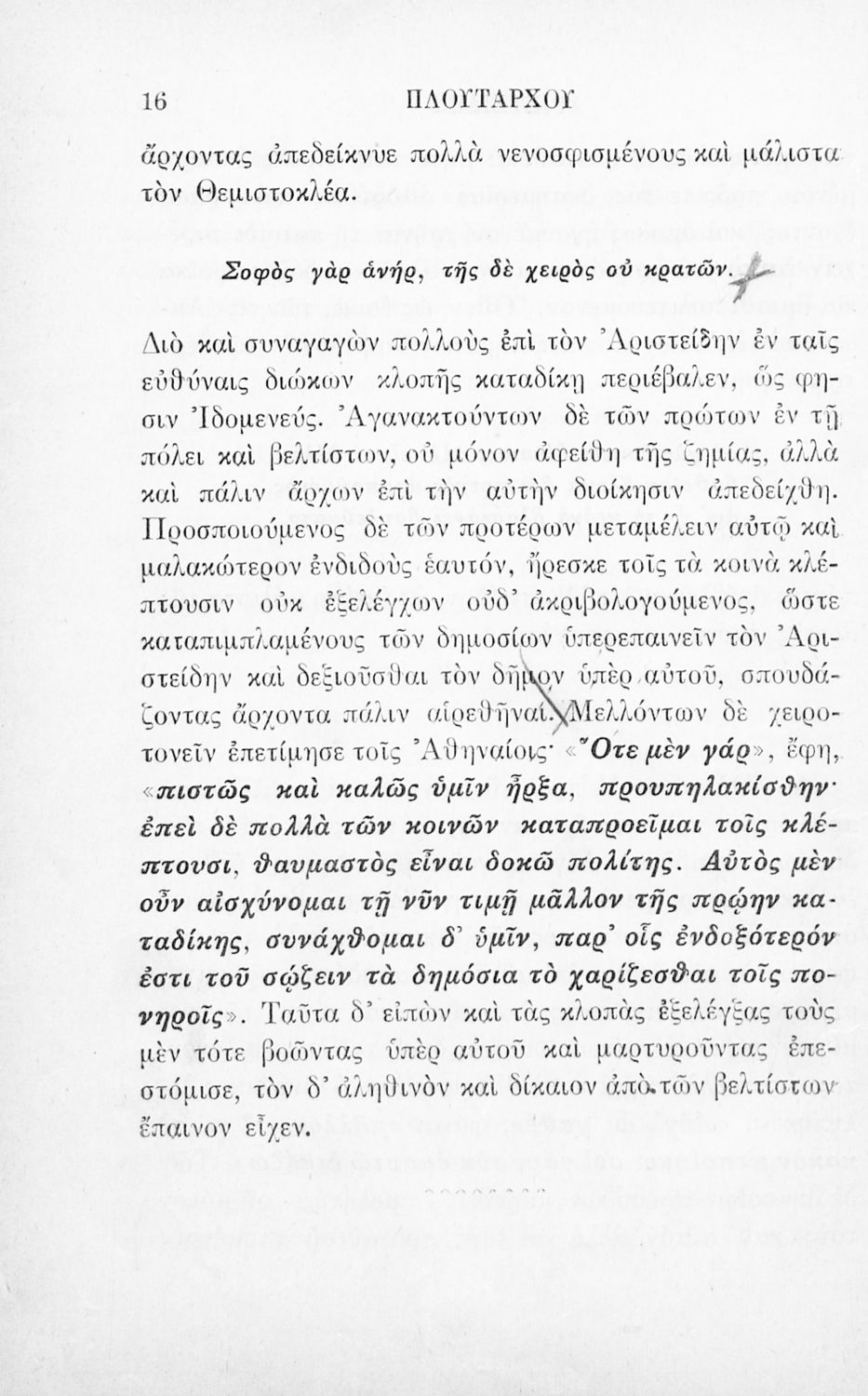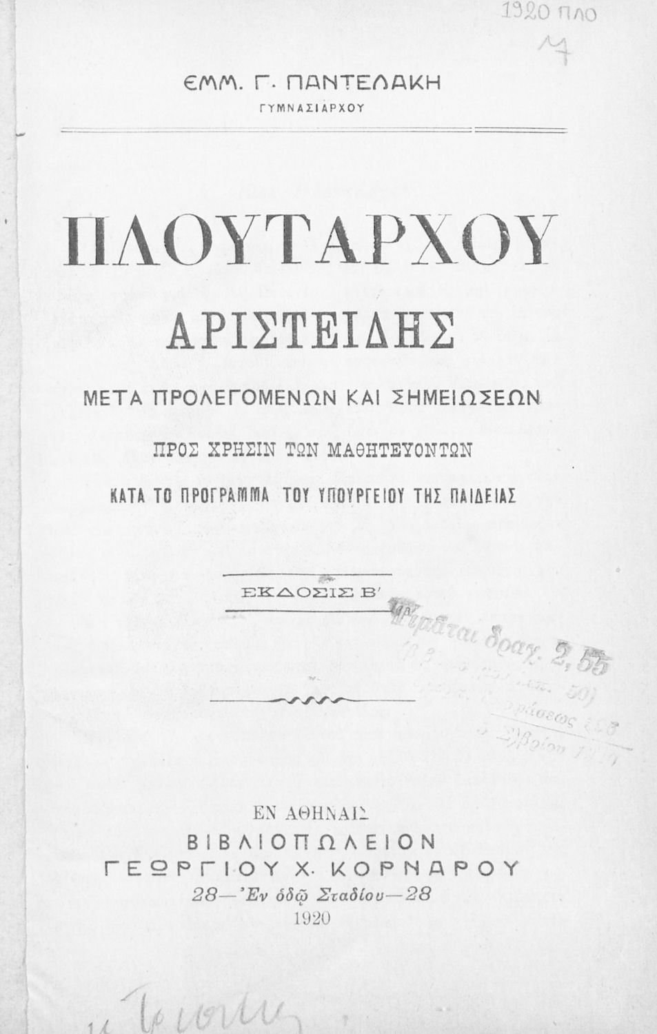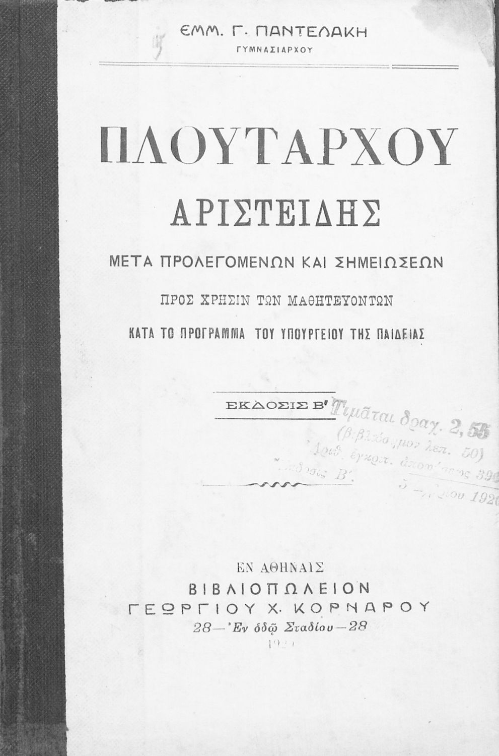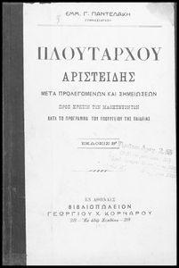 Σχολικό εγχειρίδιο Αρχαίων Ελληνικών για τα Γυμνάσια, Διδασκαλεία και Αστικά Σχολεία Θηλέων που περιλαμβάνει το έργο του Πλούταρχου Αριστείδης, εισαγωγή στη ζωή και το έργο του και λεξιλογικά και ερμηνευτικά σχόλια.