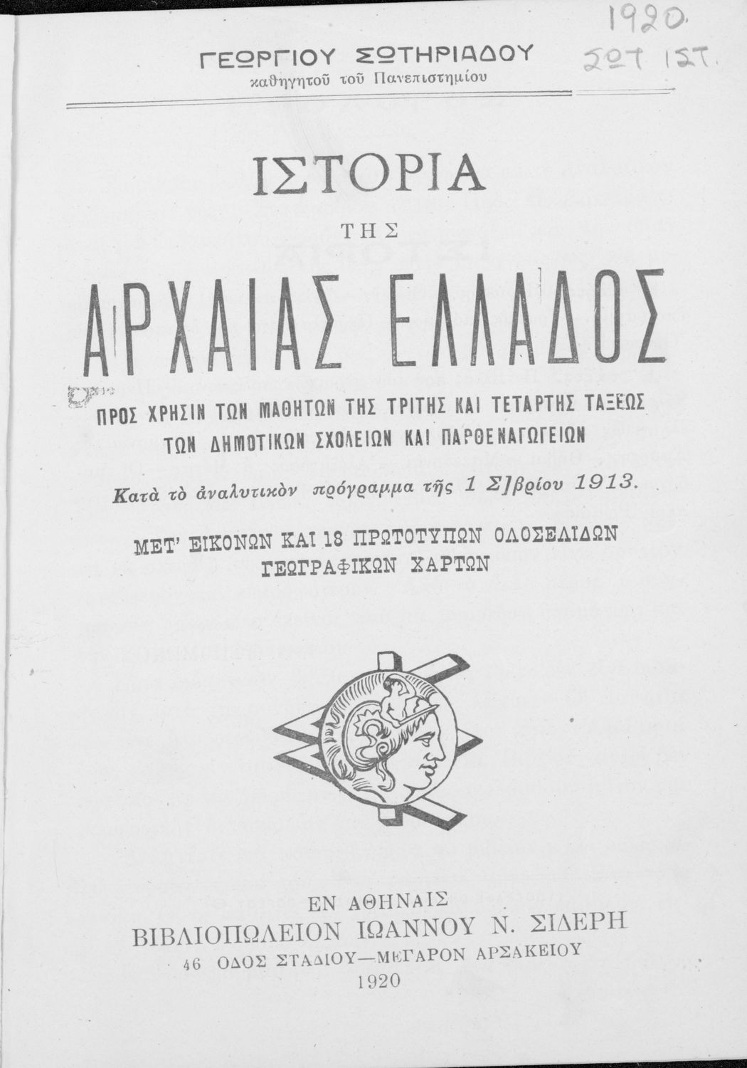 Κωδικός αναγνώρισης: 02-02014 Τίτλος: Ιστορία της αρχαίας Ελλάδος προς χρήσιν των μαθητών της τρίτης και τετάρτης τάξεως των Δημοτικών Σχολείων και Παρθεναγωγείων Συγγραφέας: Γεώργιος Σωτηριάδης Μέγεθος και υπόστρωμα: Σχολικό εγχειρίδιο, σκληρό εξώφυλλο, 154 σελίδες. Σκίτσα (ασπρόμαυρα), χάρτες (ασπρόμαυροι). |