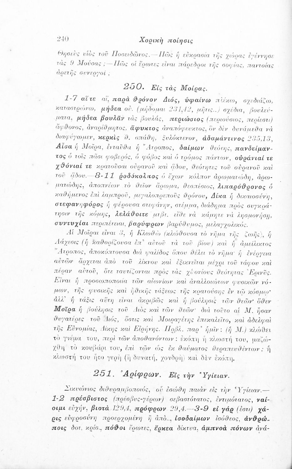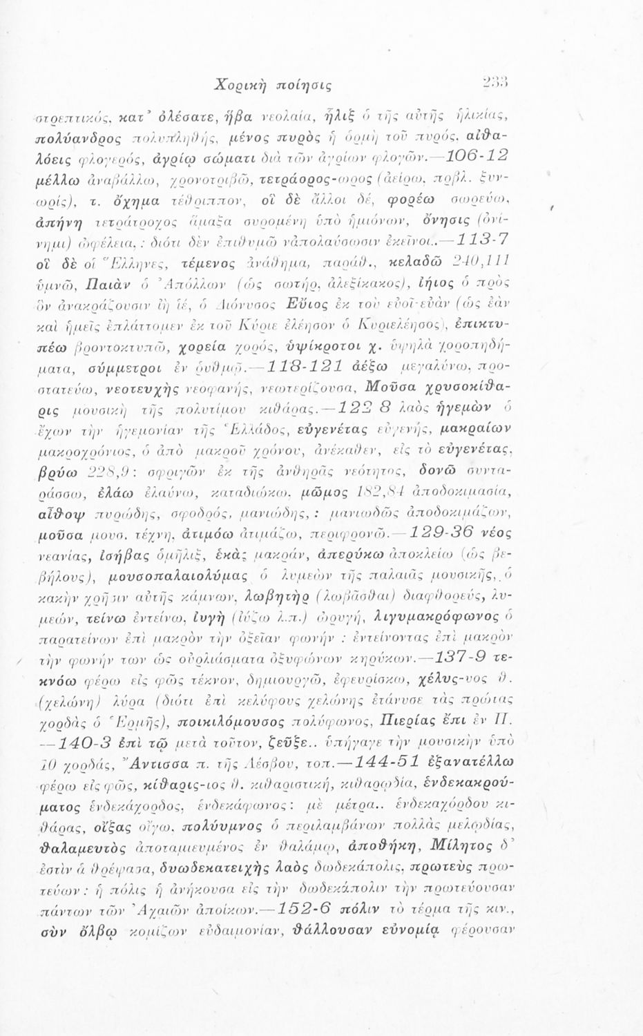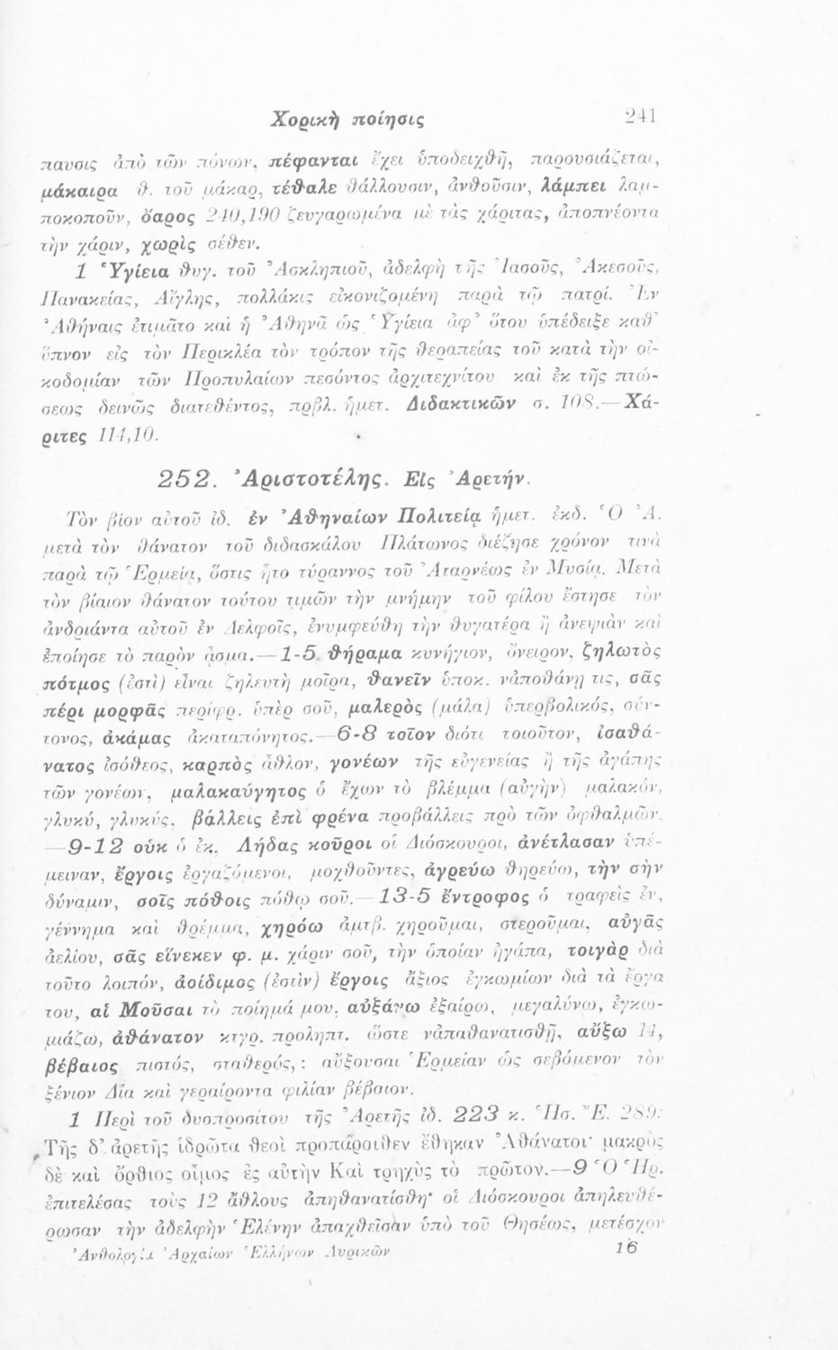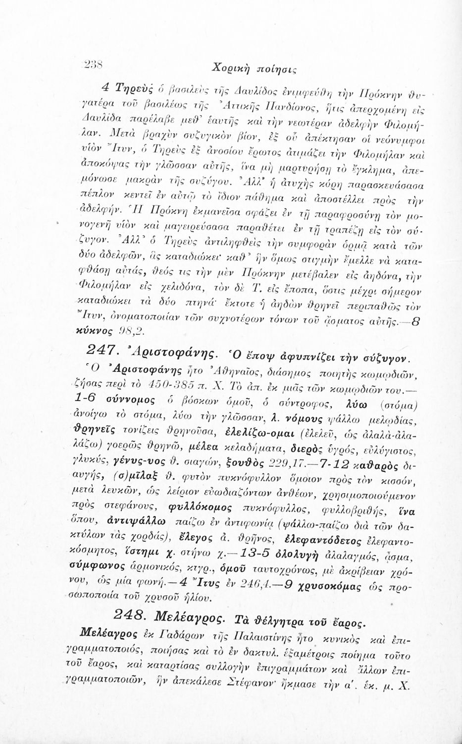 Μαθητικό βοήθημα Αρχαίων Ελληνικών που περιλαμβάνει αποσπάσματα έργων αρχαίων Ελλήνων λυρικών, πολιτικές και γνωμικές ελεγείες, ιάμβους και επιγράμματα. Περιέχει και υπόμνημα με ερμηνευτικά, πραγματολογικά, γλωσσικά και γραμματικά σχόλια.