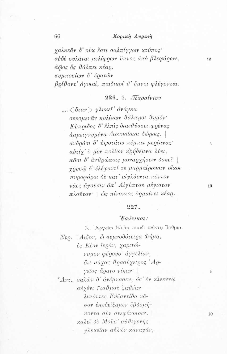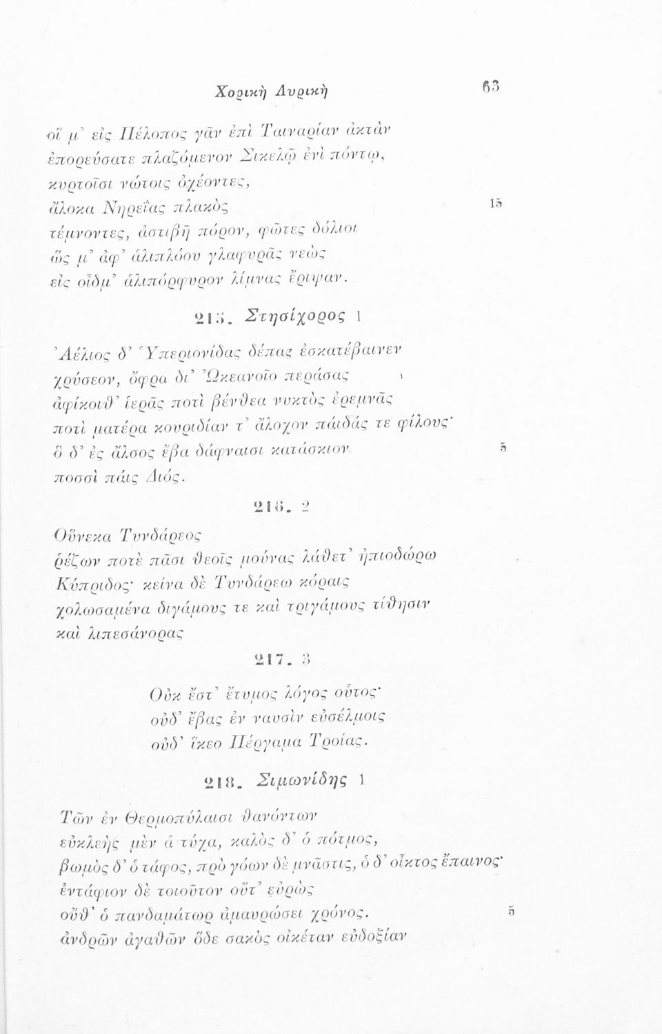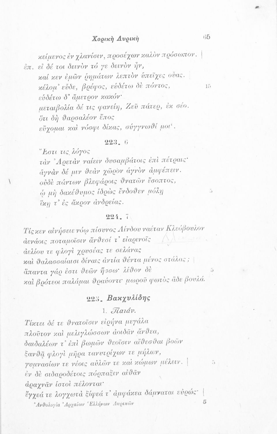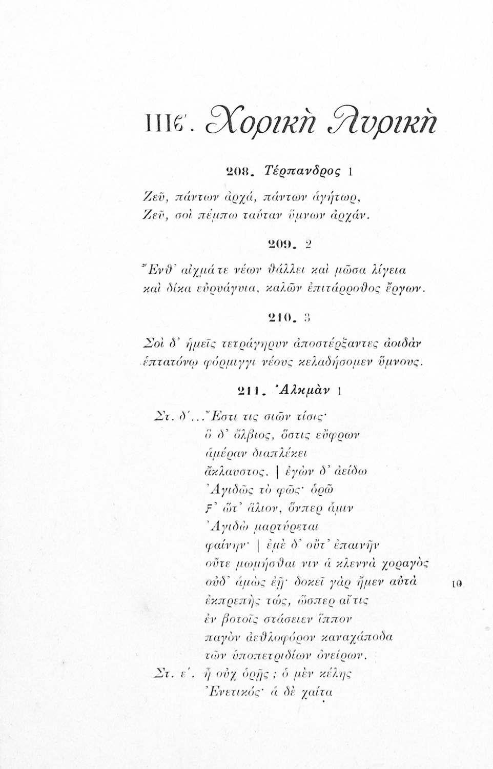 Μαθητικό βοήθημα Αρχαίων Ελληνικών που περιλαμβάνει αποσπάσματα έργων αρχαίων Ελλήνων λυρικών, πολιτικές και γνωμικές ελεγείες, ιάμβους και επιγράμματα. Περιέχει και υπόμνημα με ερμηνευτικά, πραγματολογικά, γλωσσικά και γραμματικά σχόλια.