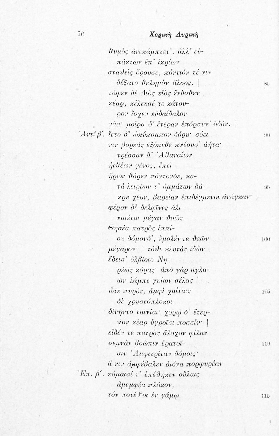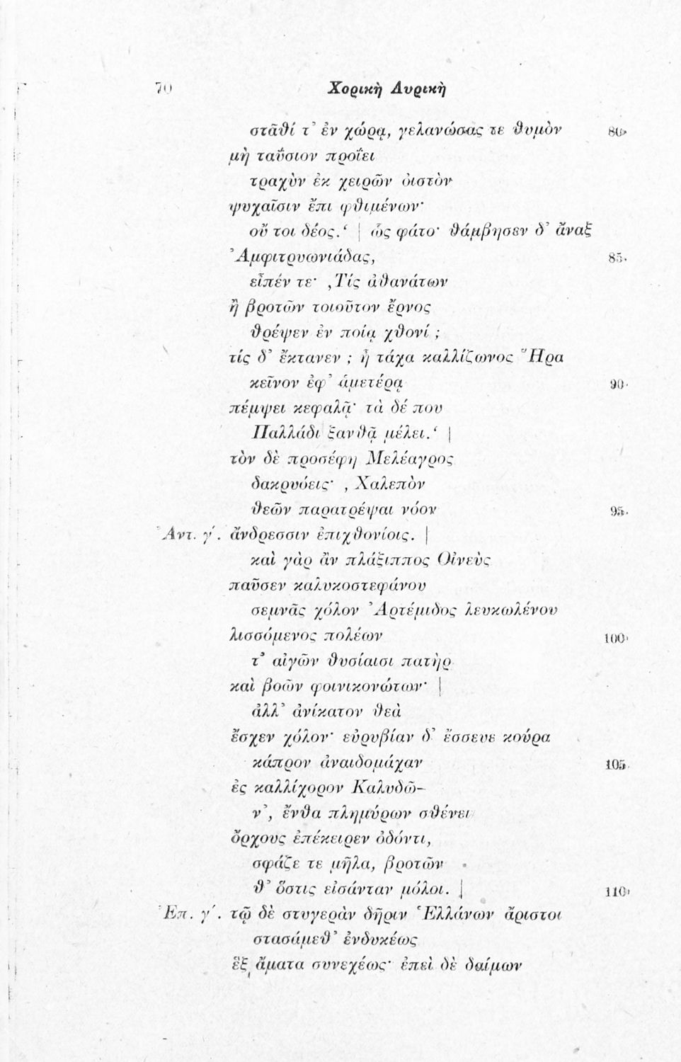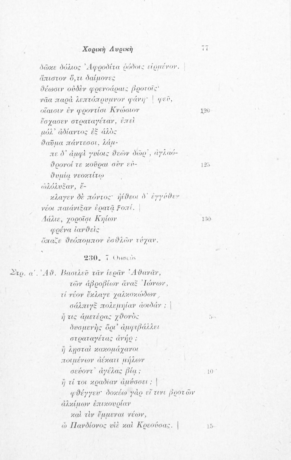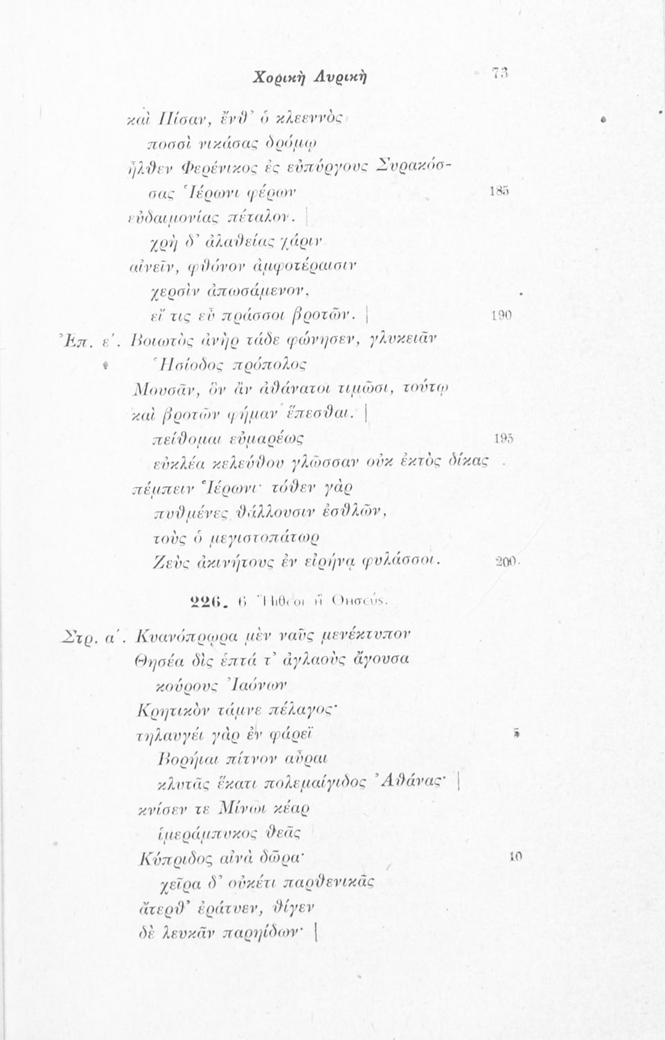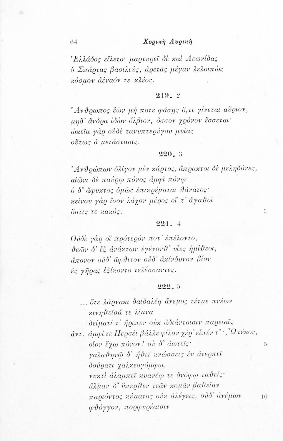 Μαθητικό βοήθημα Αρχαίων Ελληνικών που περιλαμβάνει αποσπάσματα έργων αρχαίων Ελλήνων λυρικών, πολιτικές και γνωμικές ελεγείες, ιάμβους και επιγράμματα. Περιέχει και υπόμνημα με ερμηνευτικά, πραγματολογικά, γλωσσικά και γραμματικά σχόλια.