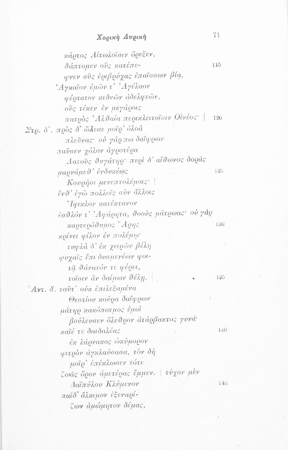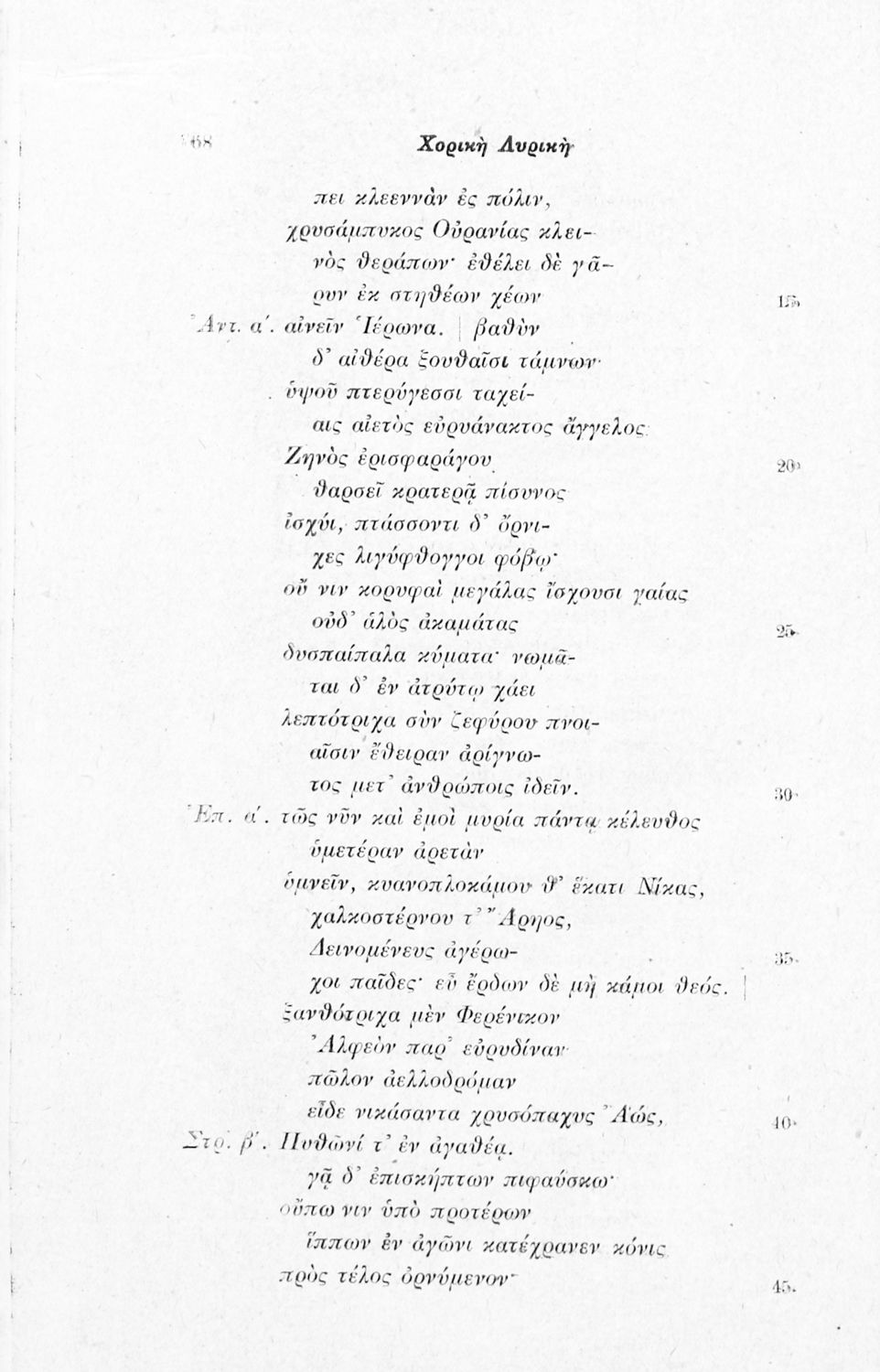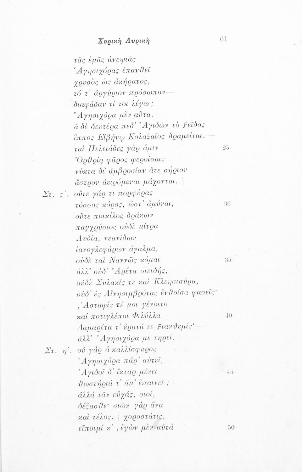 Σχολικό εγχειρίδιο Αρχαίων Ελληνικών για την ΣΤ΄ Γυμνασίου που περιέχει αποσπάσματα αρχαίων Ελλήνων λυρικών, εισαγωγή και ερμηνευτικά σχόλια. Κοσμείται από μικρά διακοσμητικά σχέδια.