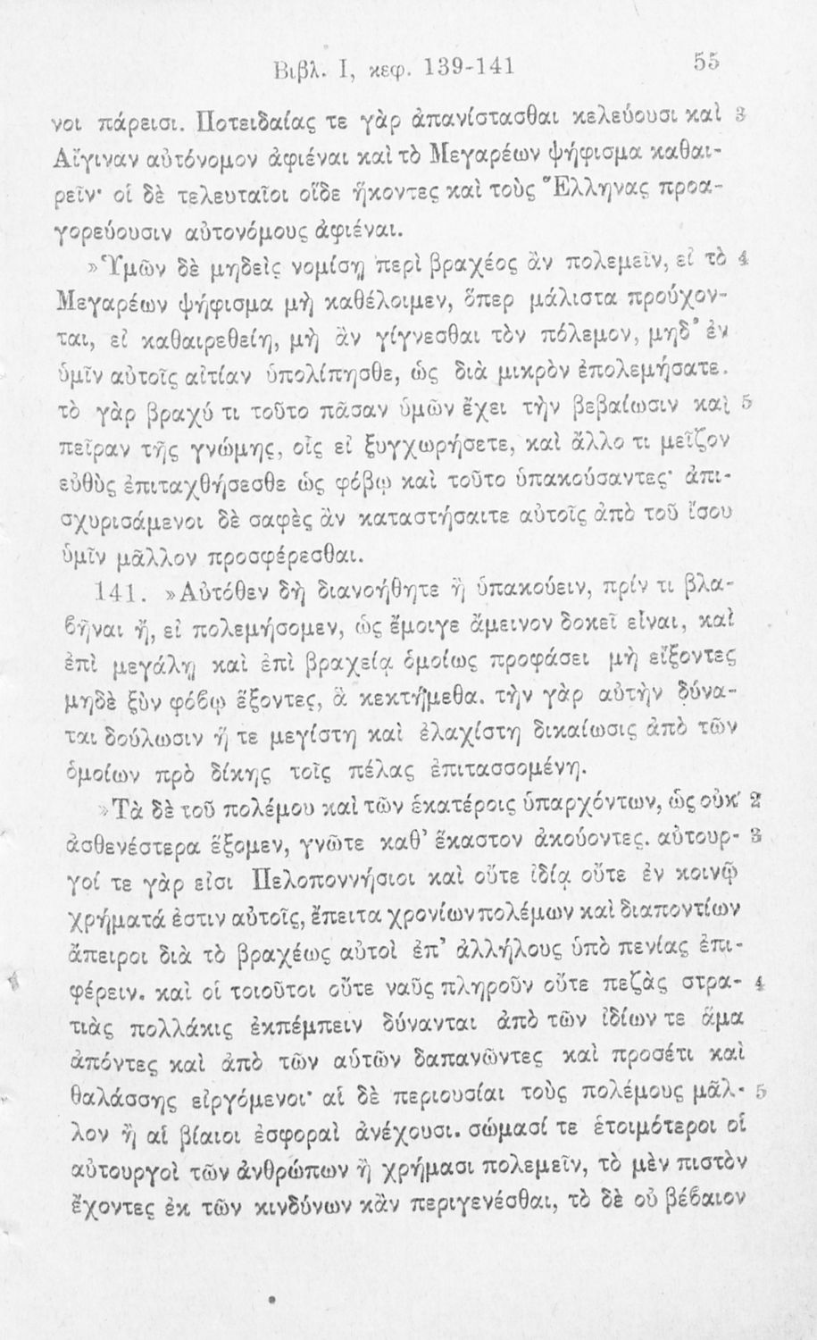 Σχολικό εγχειρίδιο Αρχαίων Ελληνικών για τις Β΄ και Γ΄ Γυμνασίου που περιλαμβάνει σύντομο βιογραφικό σημείωμα του Θουκυδίδη, εισαγωγικά σχόλια στο έργο, κείμενο και ετυμολογικό λεξιλόγιο.