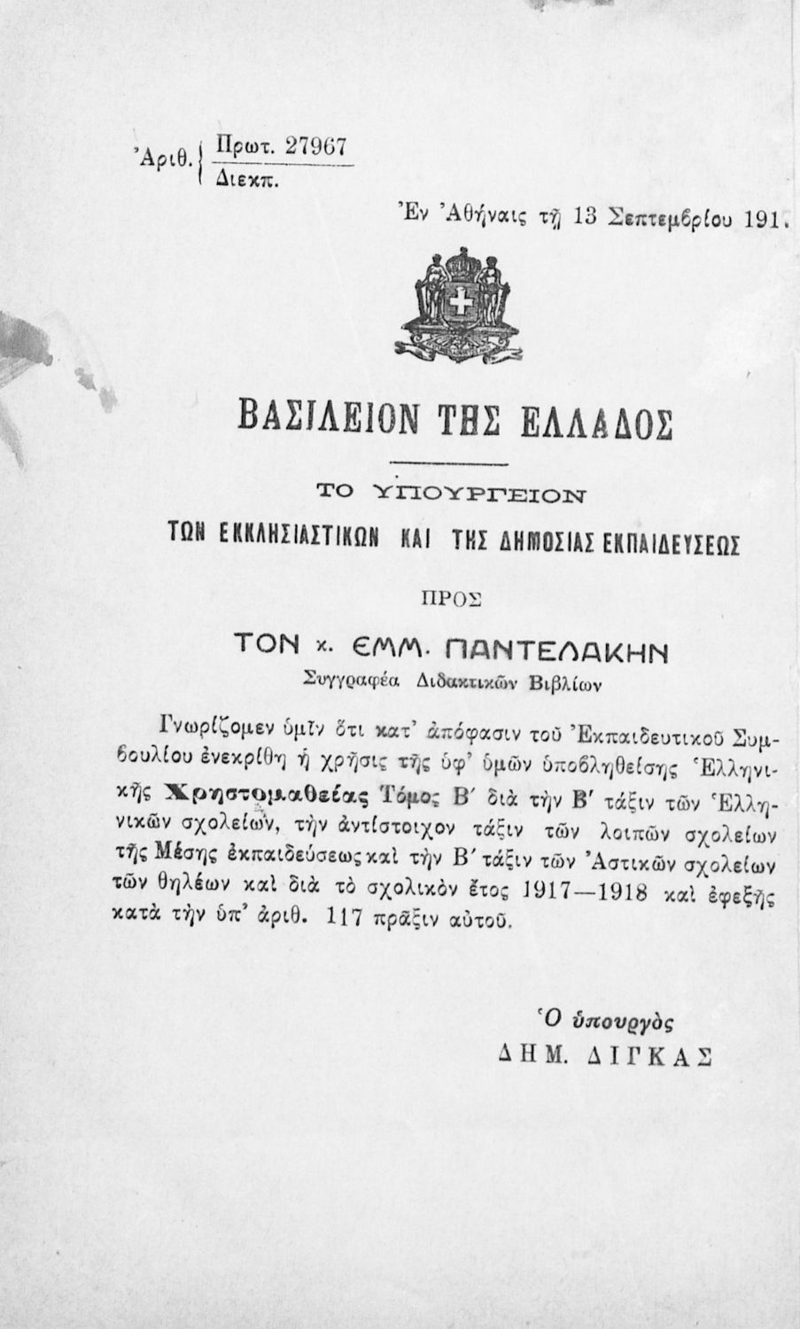 Υπουργική απόφαση / Σύμβαση: 27967/13-9-1917