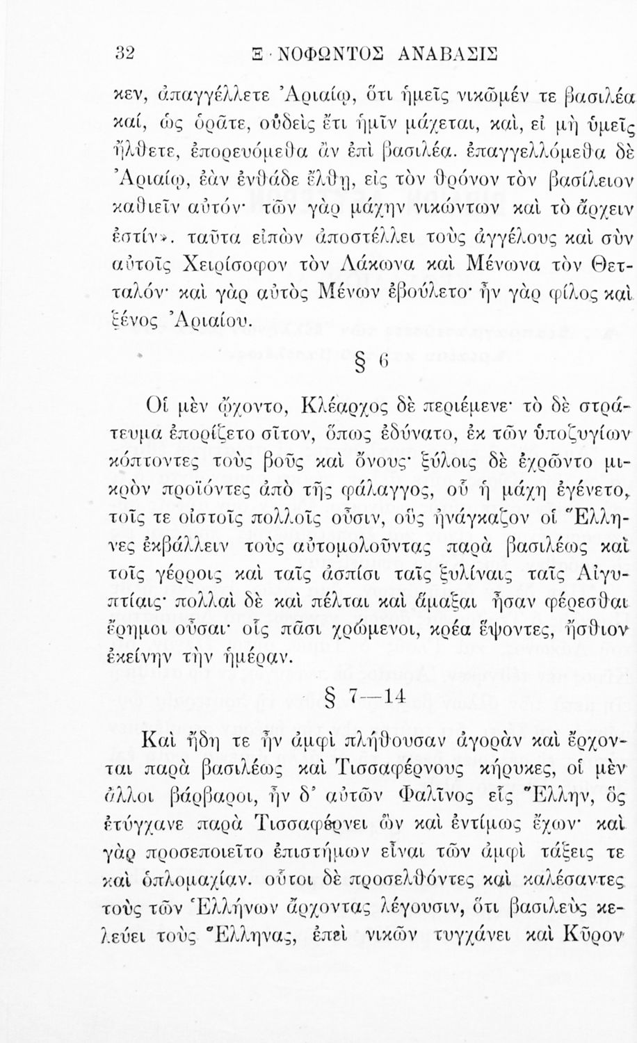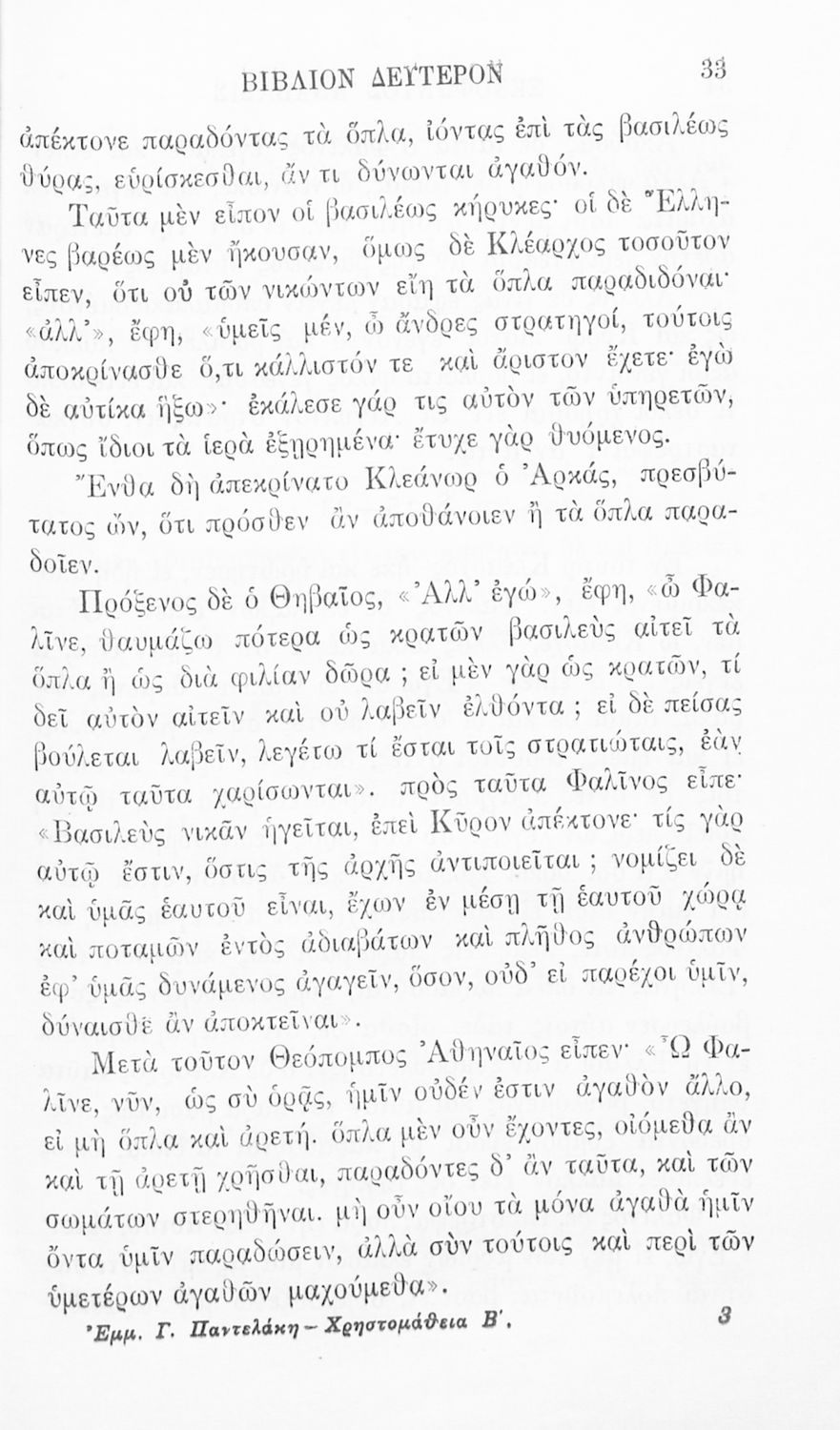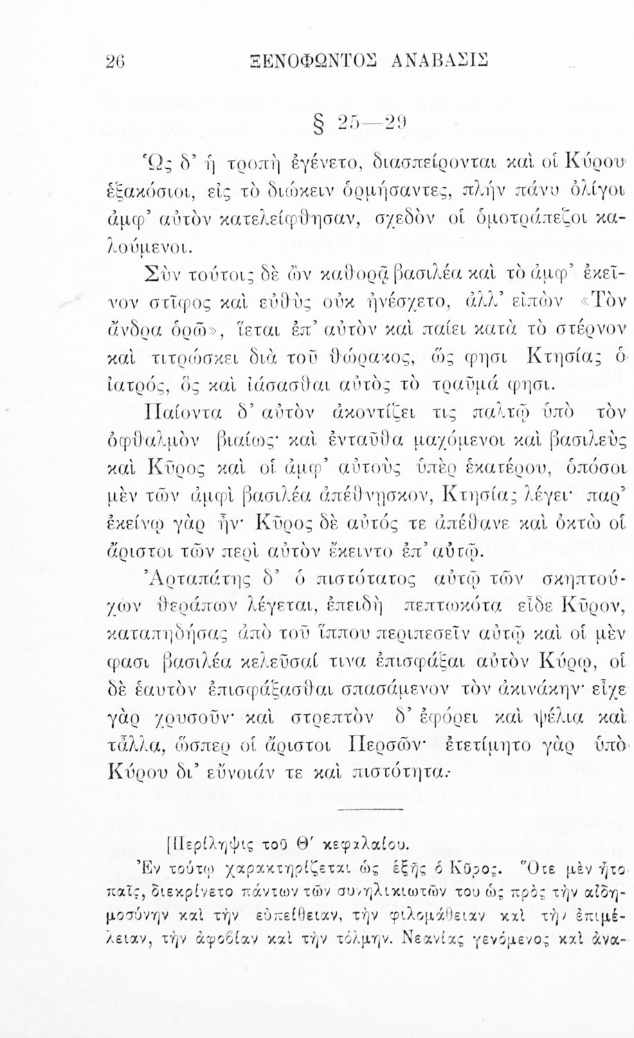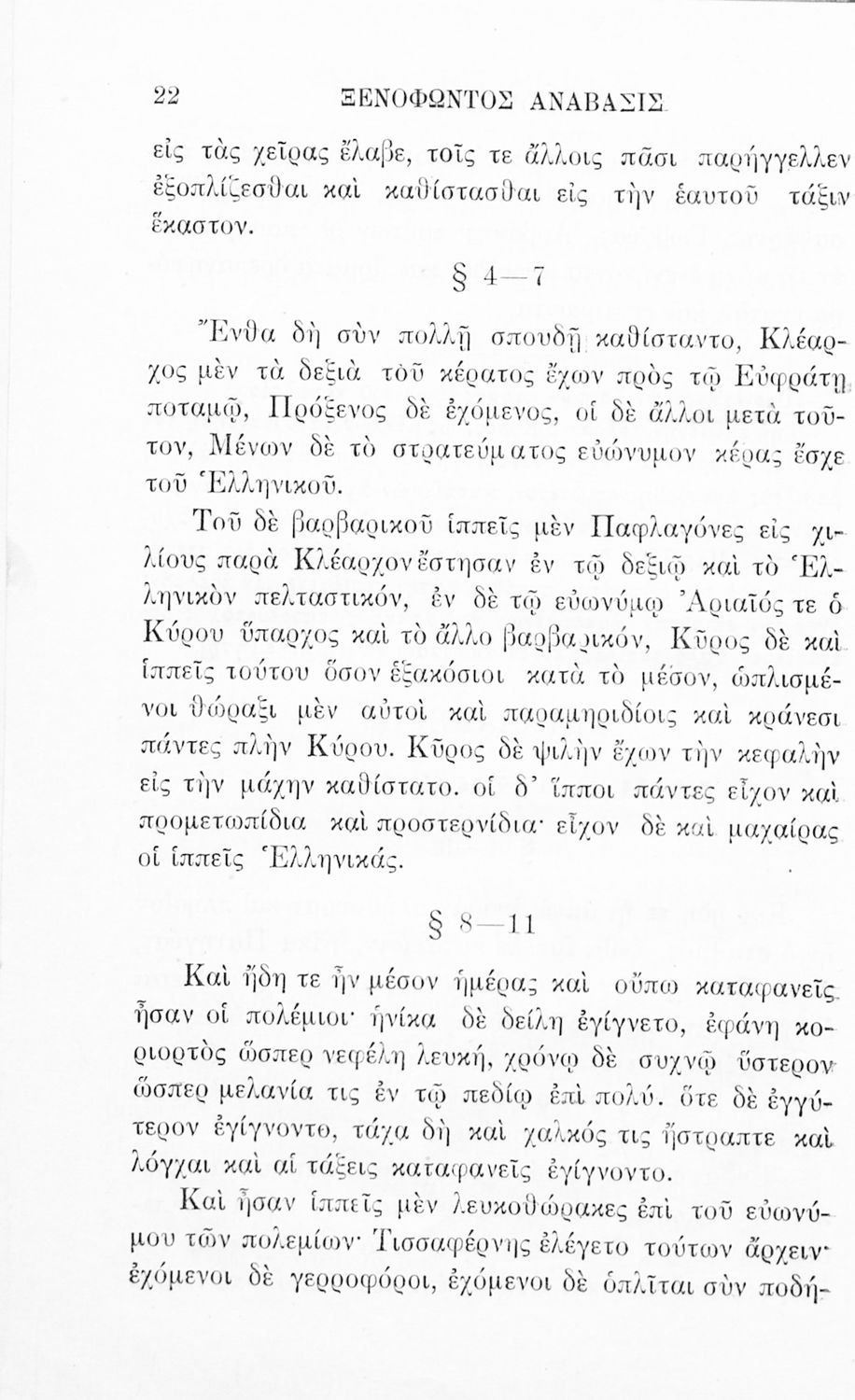 Σχολικό εγχειρίδιο Αρχαίων Ελληνικών για τις Β' Ελληνικού Σχολείου και Β΄ Αστικού Σχολείου Θηλέων που περιλαμβάνει το έργο του Ξενοφώντα Κύρου Ανάβασις, εισαγωγικά σχόλια για τη ζωή και το έργο του, ερμηνευτικές και γραμματικές παρατηρήσεις, λεξικολογικά σχόλια και πίνακα κυρίων ονομάτων.