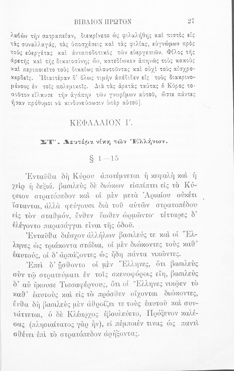 Σχολικό εγχειρίδιο Αρχαίων Ελληνικών για τα Ελληνικά Σχολεία και Παρθεναγωγεία που περιλαμβάνει αποσπάσματα από τα έργα του Ξενοφώντα Ελληνικά και Κύρου Παιδεία και λεξικολογικές παρατηρήσεις.