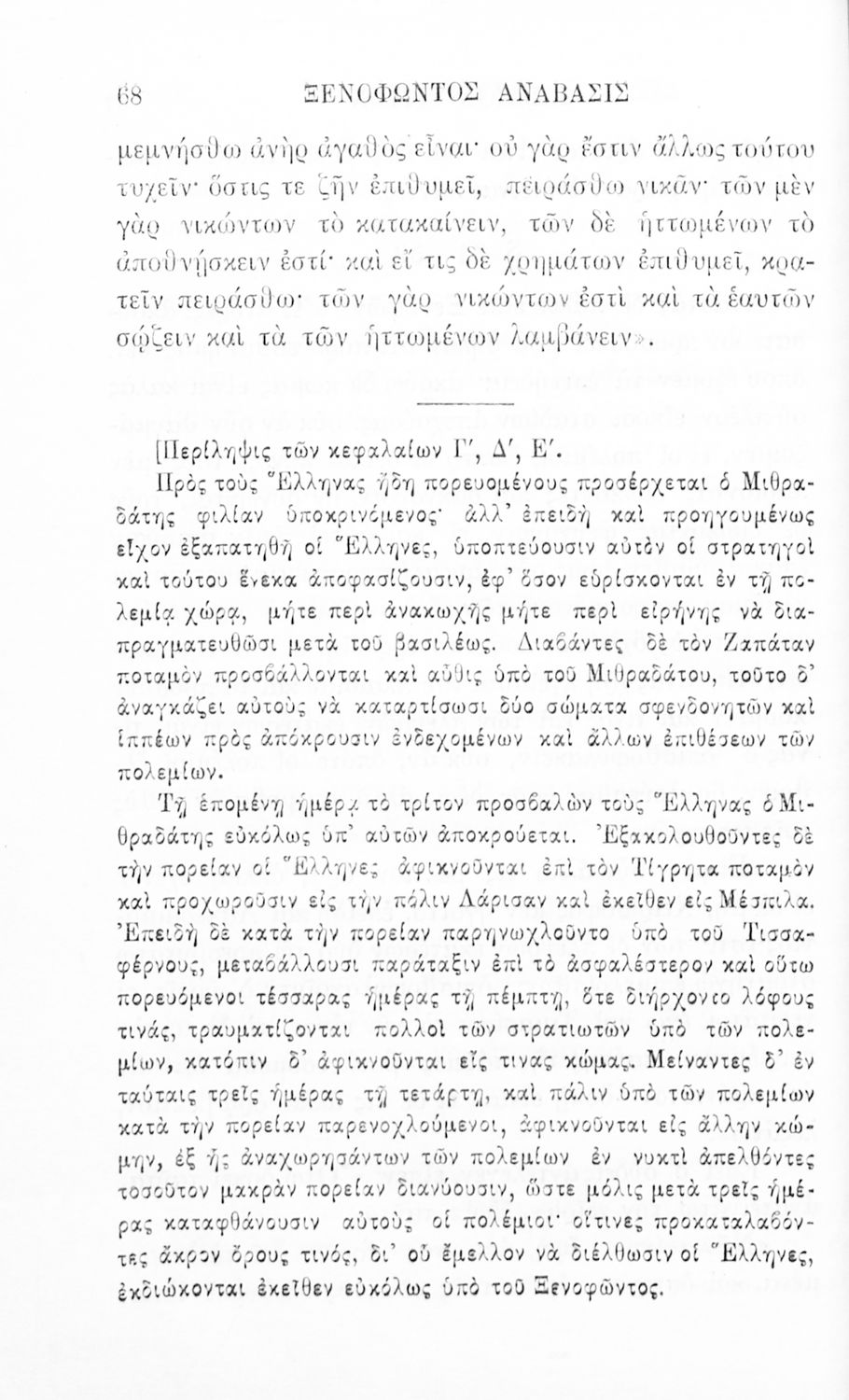 Σχολικό εγχειρίδιο Αρχαίων Ελληνικών για τα Ελληνικά Σχολεία και Παρθεναγωγεία που περιλαμβάνει αποσπάσματα από το έργο του Ξενοφώντα Κύρου Ανάβασις, και λεξικογραφικές παρατηρήσεις.