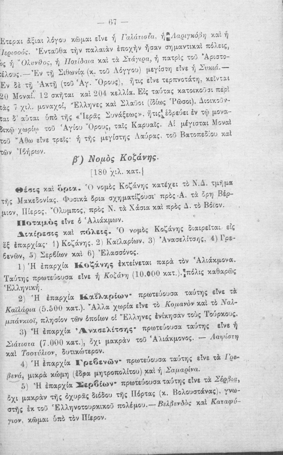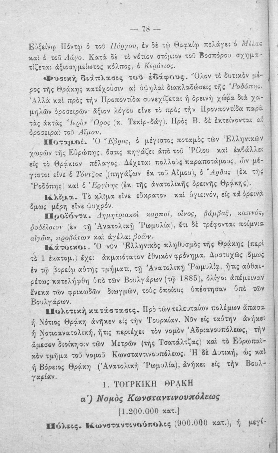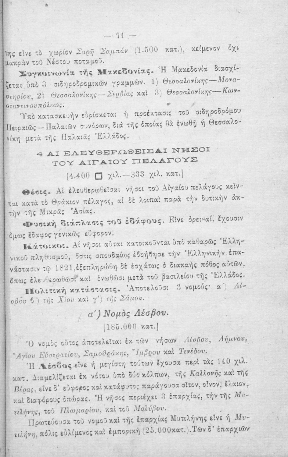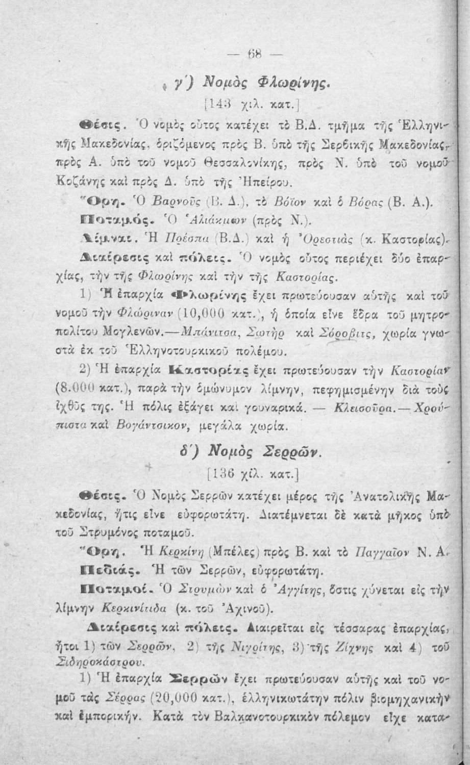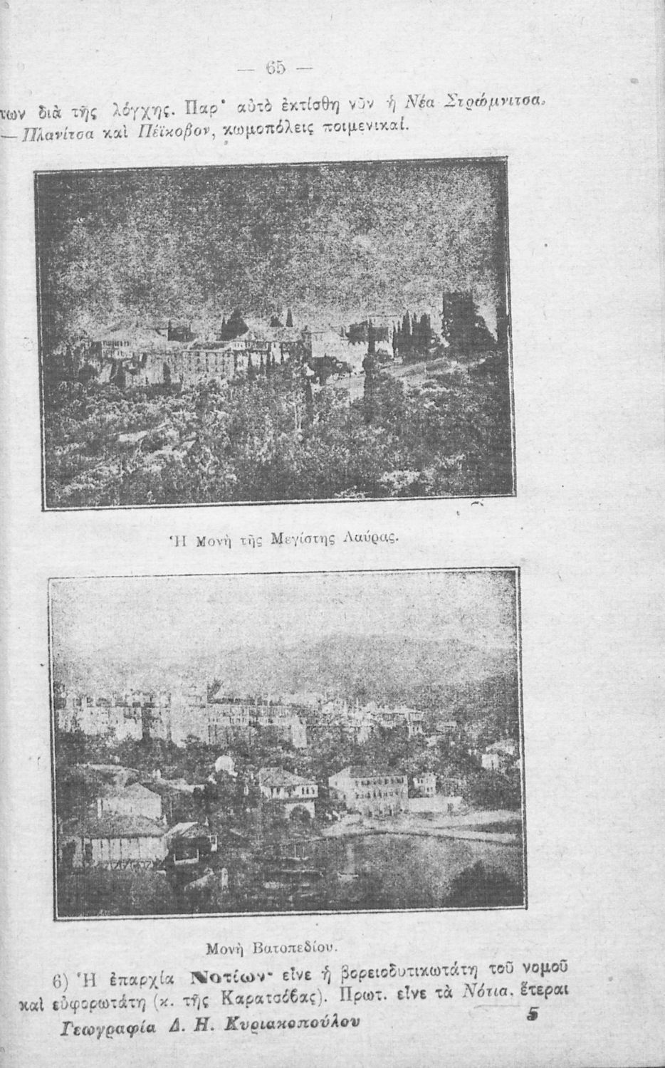 Σχολικό εγχειρίδιο Γεωγραφίας Δημοτικού που παρουσιάζει την φυσική, οικονομική και πολιτική γεωγραφία της Παλαιάς και Νέας Ελλάδας. Περιέχει και εκτενή αναφορά στις "λοιπές ελληνικές χώρες" στις οποίες περιλαμβάνει την Σερβική και Βουλγαρική Μακεδονία, τη Θράκη, τα Δωδεκάνησα, την Ανατολική Ρωμυλία, την Μικρά Ασία, την Συρία και την Παλαιστίνη.