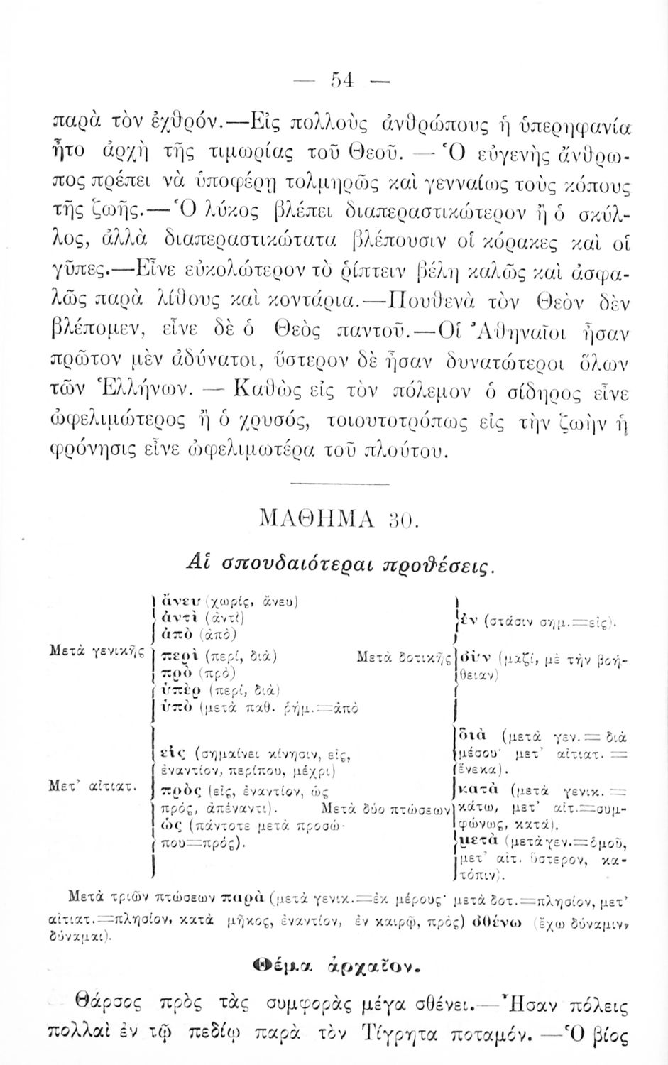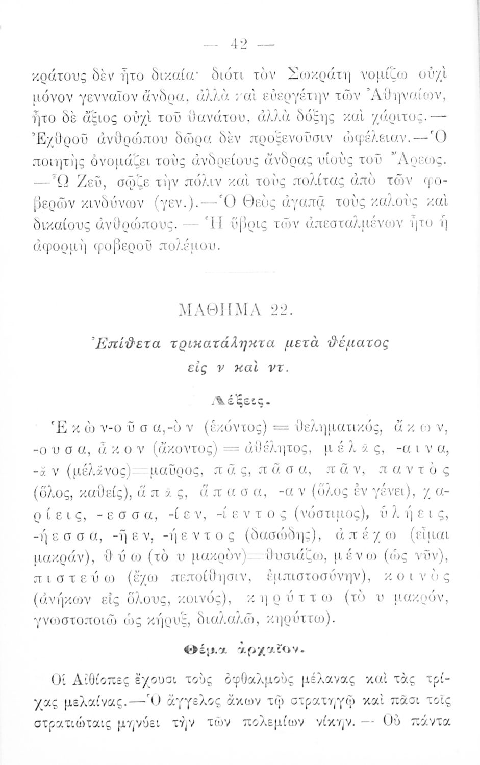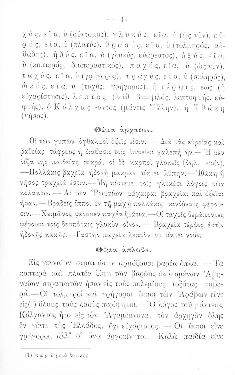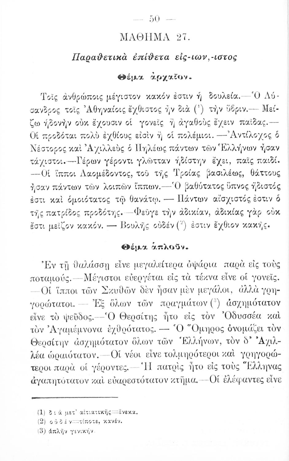 Σχολικό εγχειρίδιο Αρχαίων Ελληνικών για την Α΄ Ελληνικών Σχολείων και Παρθεναγωγείων που περιλαμβάνει σύντομα κείμενα γραμμένα σε αρχαία ελληνικά και την απόδοσή τους σε καθαρεύουσα τα οποία χρησιμοποιεί για τη διδασκαλία των γραμματικών φαινομένων.