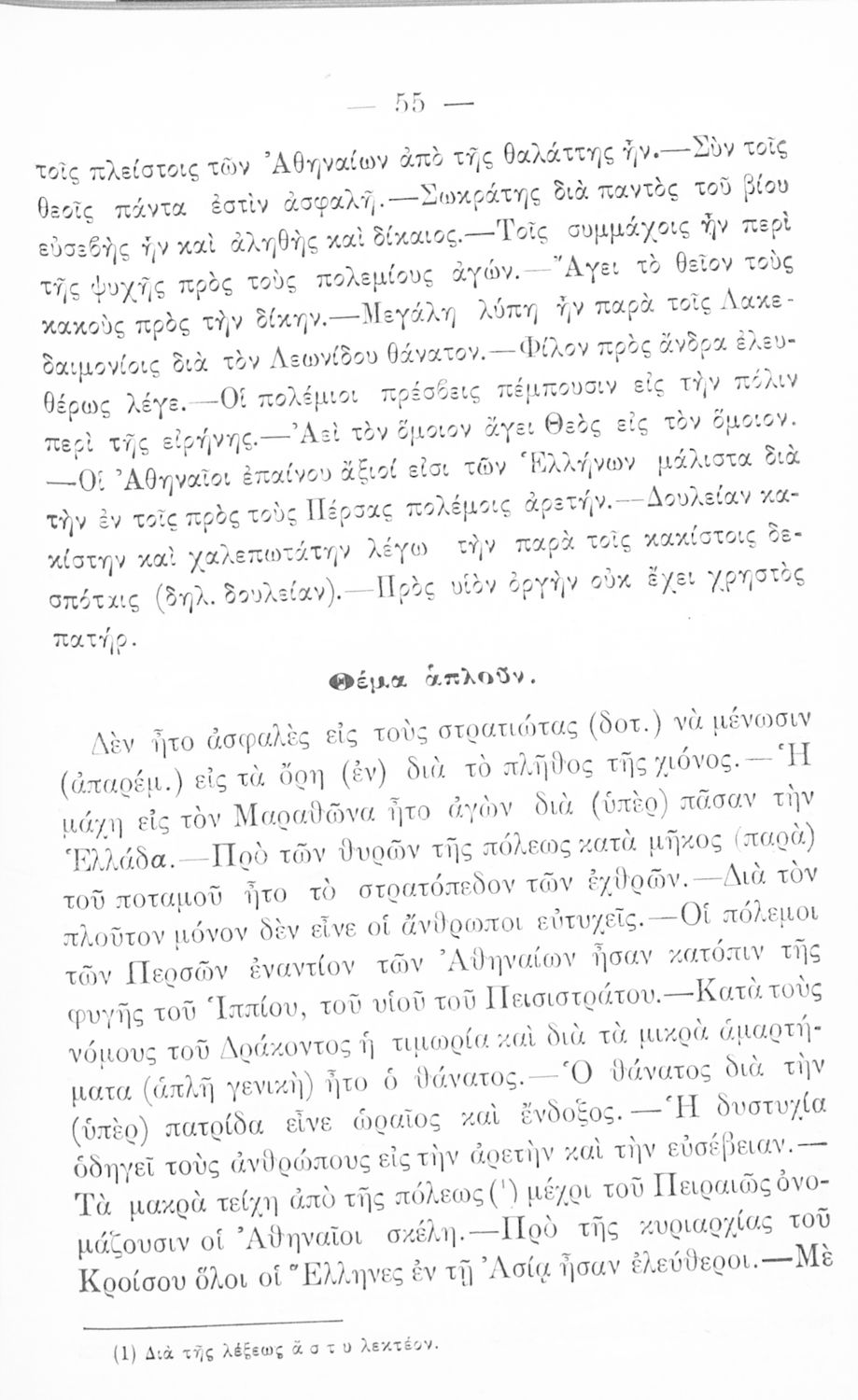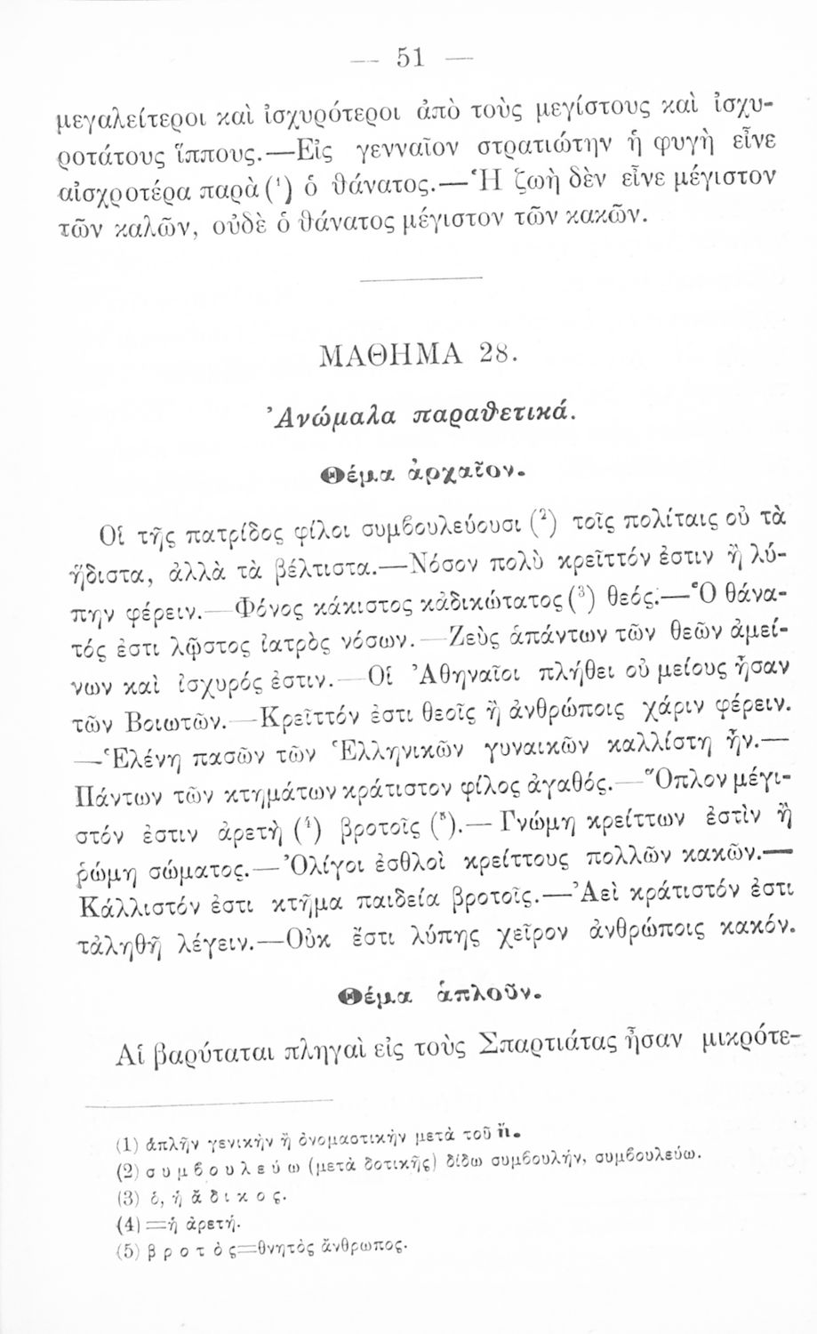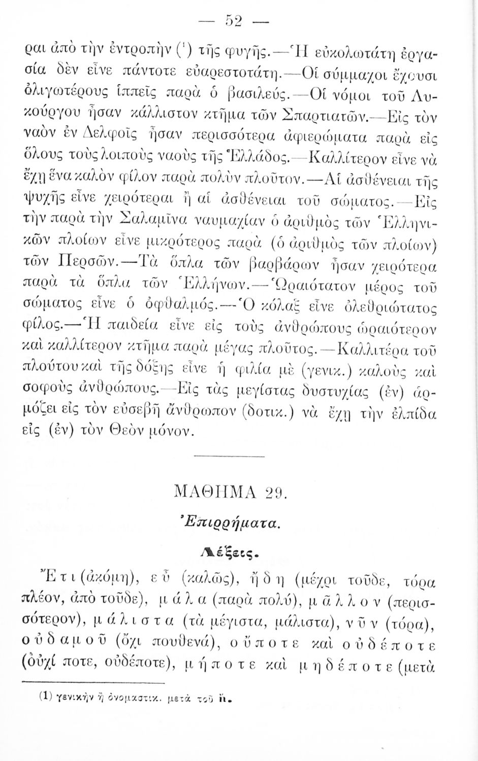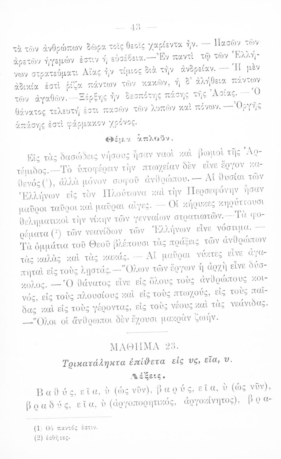 Σχολικό εγχειρίδιο Αρχαίων Ελληνικών για την Α΄ Ελληνικών Σχολείων και Παρθεναγωγείων που περιλαμβάνει σύντομα κείμενα γραμμένα σε αρχαία ελληνικά και την απόδοσή τους σε καθαρεύουσα τα οποία χρησιμοποιεί για τη διδασκαλία των γραμματικών φαινομένων.