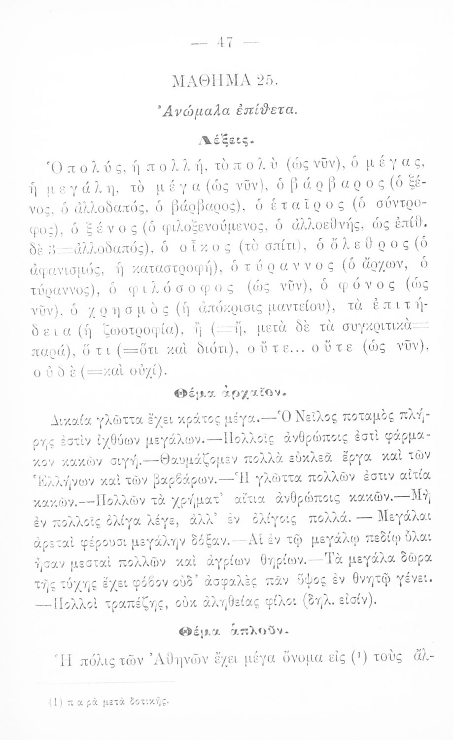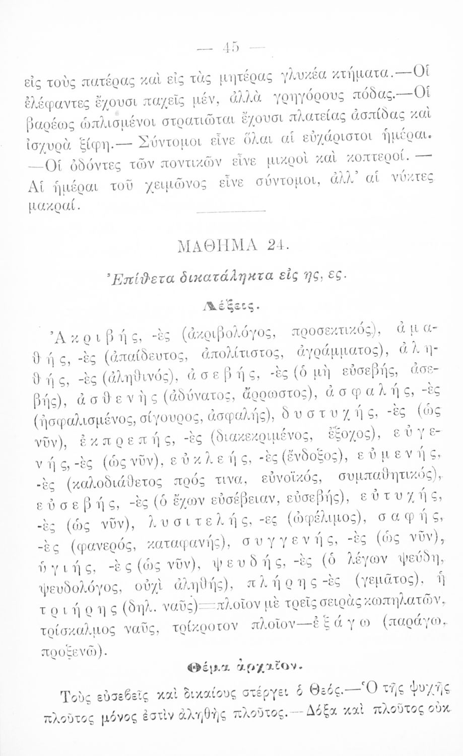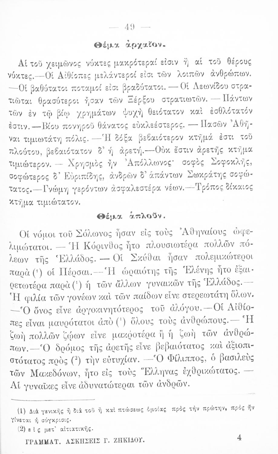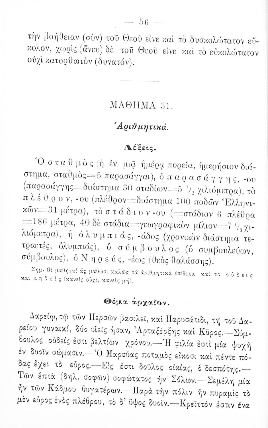 Σχολικό εγχειρίδιο Αρχαίων Ελληνικών για την Α΄ Ελληνικών Σχολείων και Παρθεναγωγείων που περιλαμβάνει σύντομα κείμενα γραμμένα σε αρχαία ελληνικά και την απόδοσή τους σε καθαρεύουσα τα οποία χρησιμοποιεί για τη διδασκαλία των γραμματικών φαινομένων.