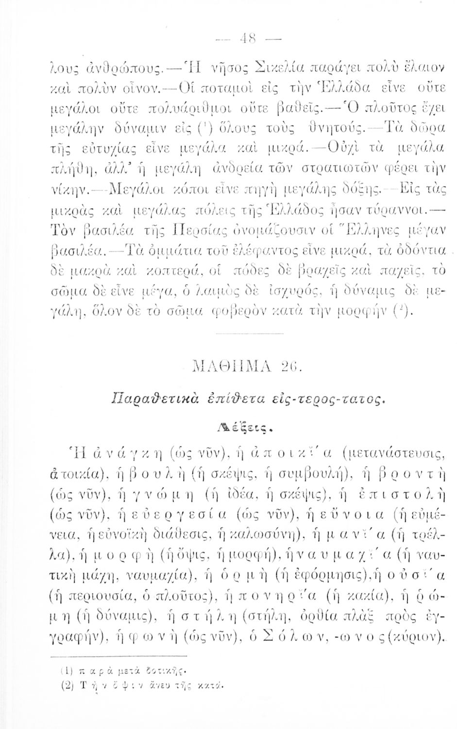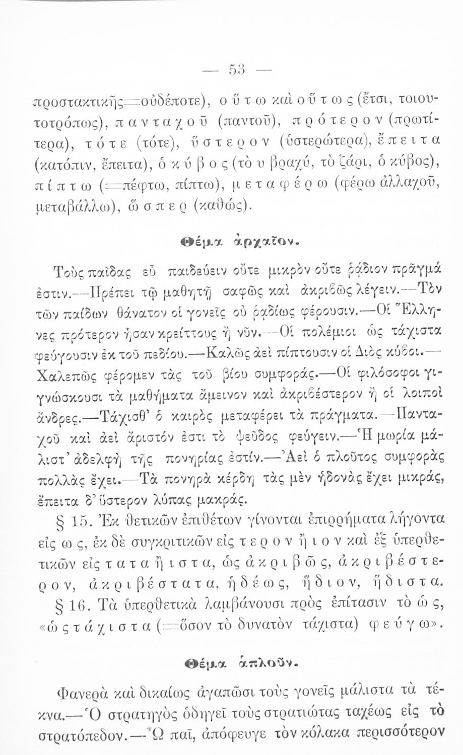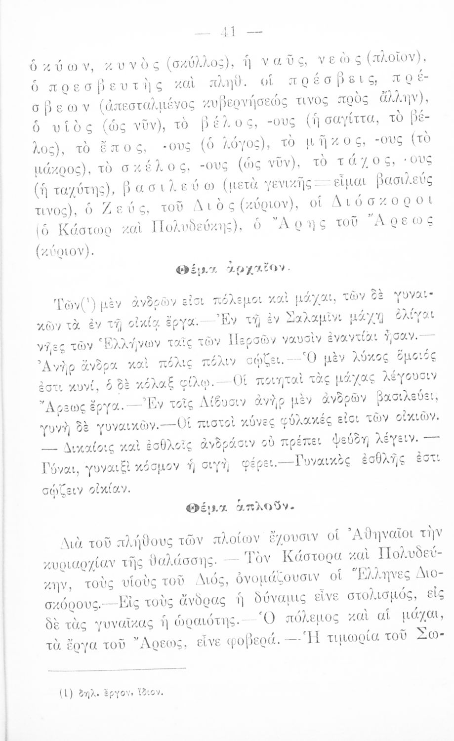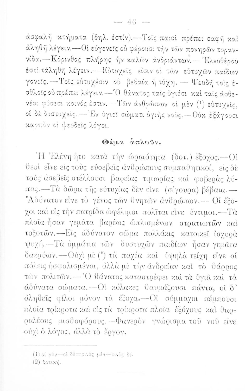 Σχολικό εγχειρίδιο Αρχαίων Ελληνικών για την Α΄ Ελληνικών Σχολείων και Παρθεναγωγείων που περιλαμβάνει σύντομα κείμενα γραμμένα σε αρχαία ελληνικά και την απόδοσή τους σε καθαρεύουσα τα οποία χρησιμοποιεί για τη διδασκαλία των γραμματικών φαινομένων.