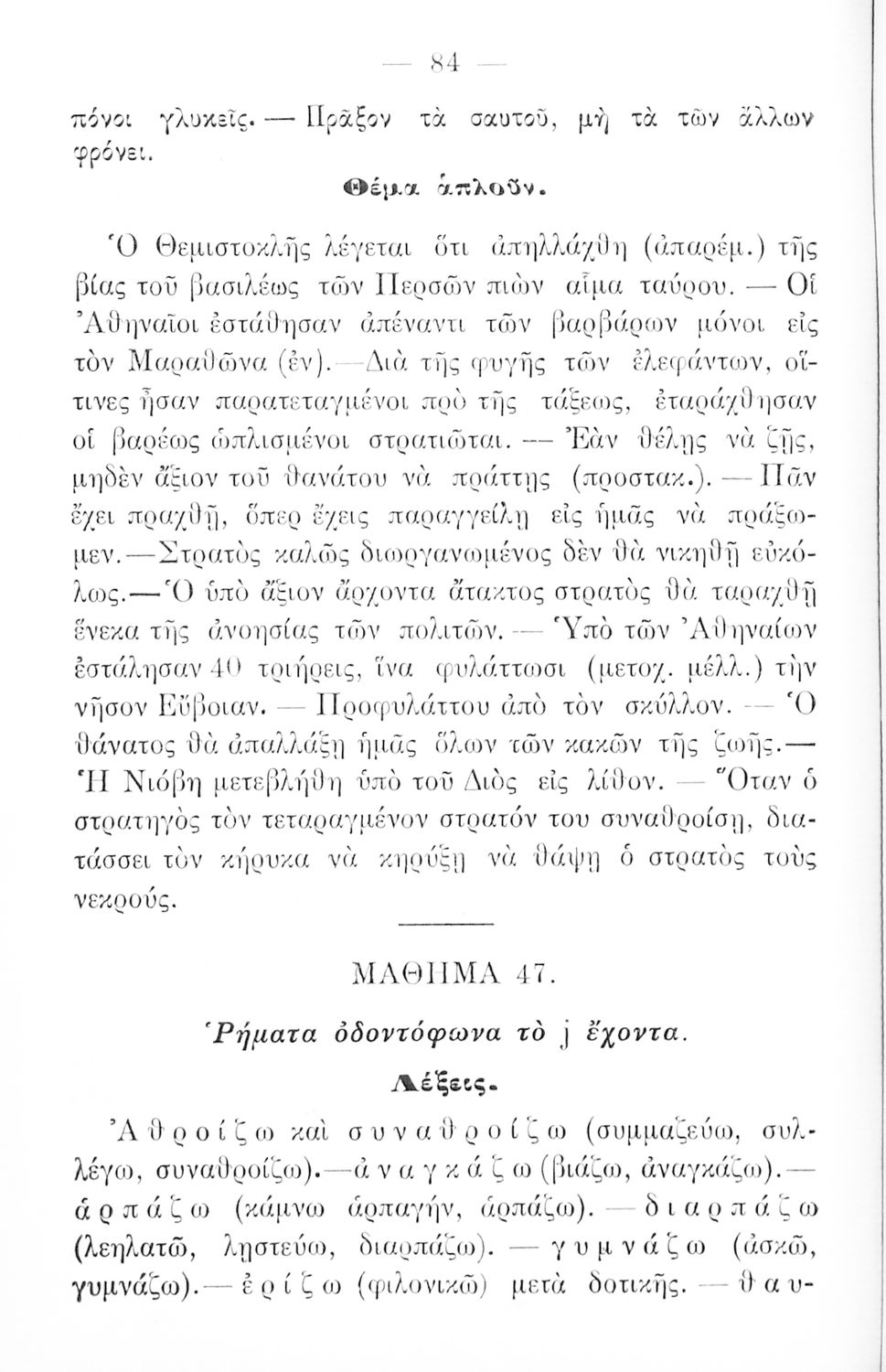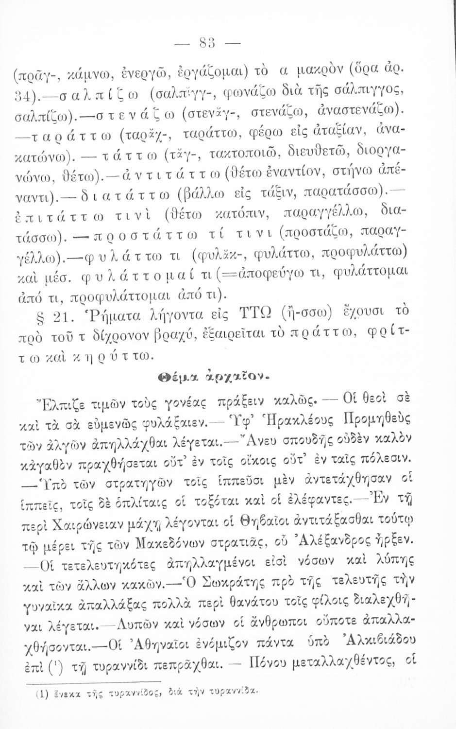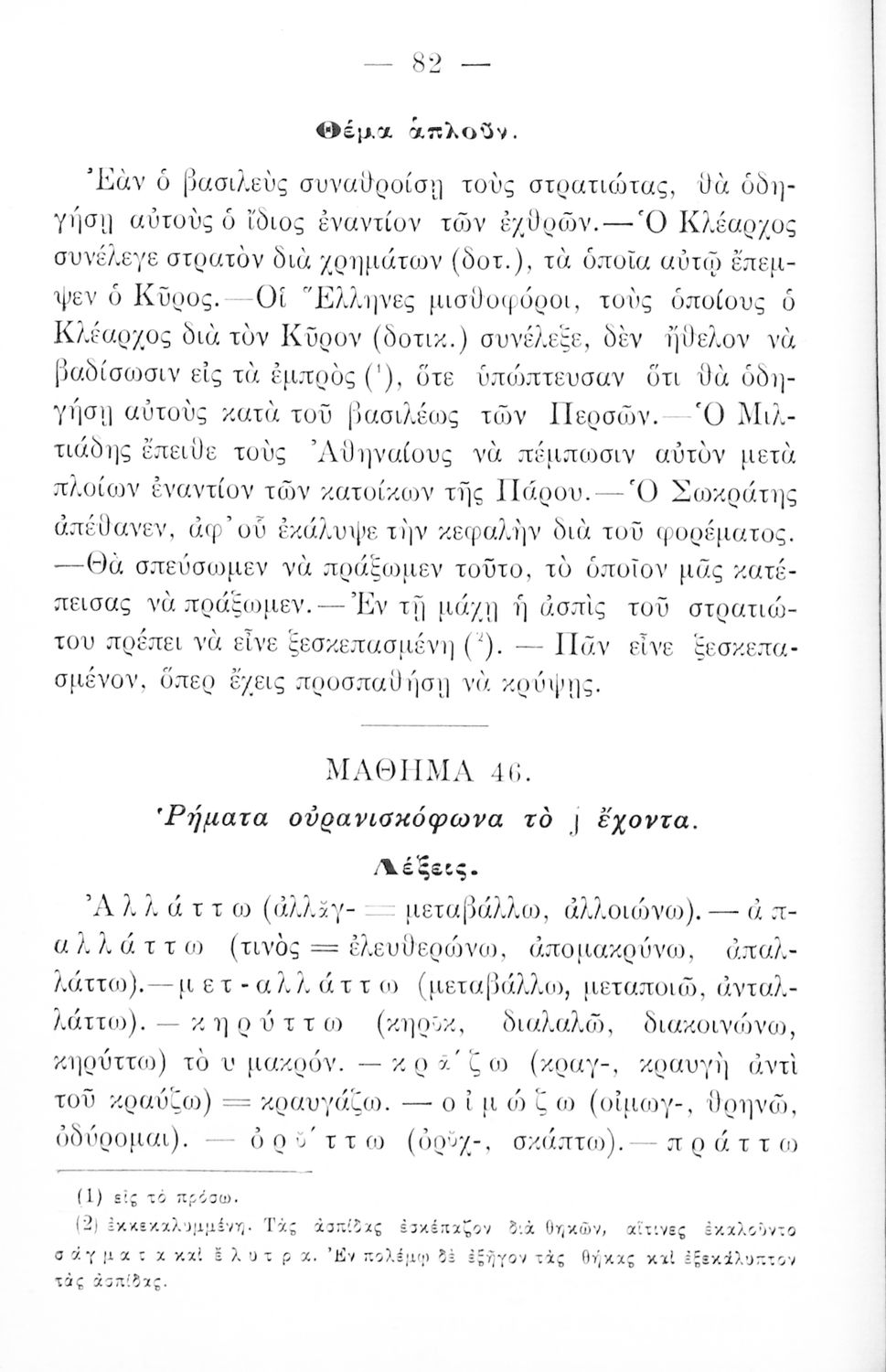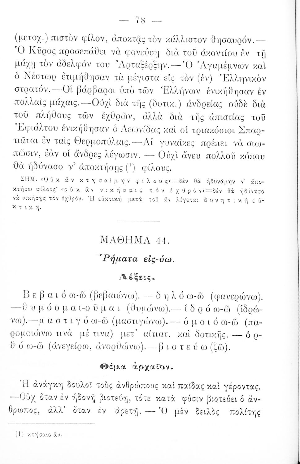 Σχολικό εγχειρίδιο Αρχαίων Ελληνικών για την Α΄ Ελληνικών Σχολείων και Παρθεναγωγείων που περιλαμβάνει σύντομα κείμενα γραμμένα σε αρχαία ελληνικά και την απόδοσή τους σε καθαρεύουσα τα οποία χρησιμοποιεί για τη διδασκαλία των γραμματικών φαινομένων.