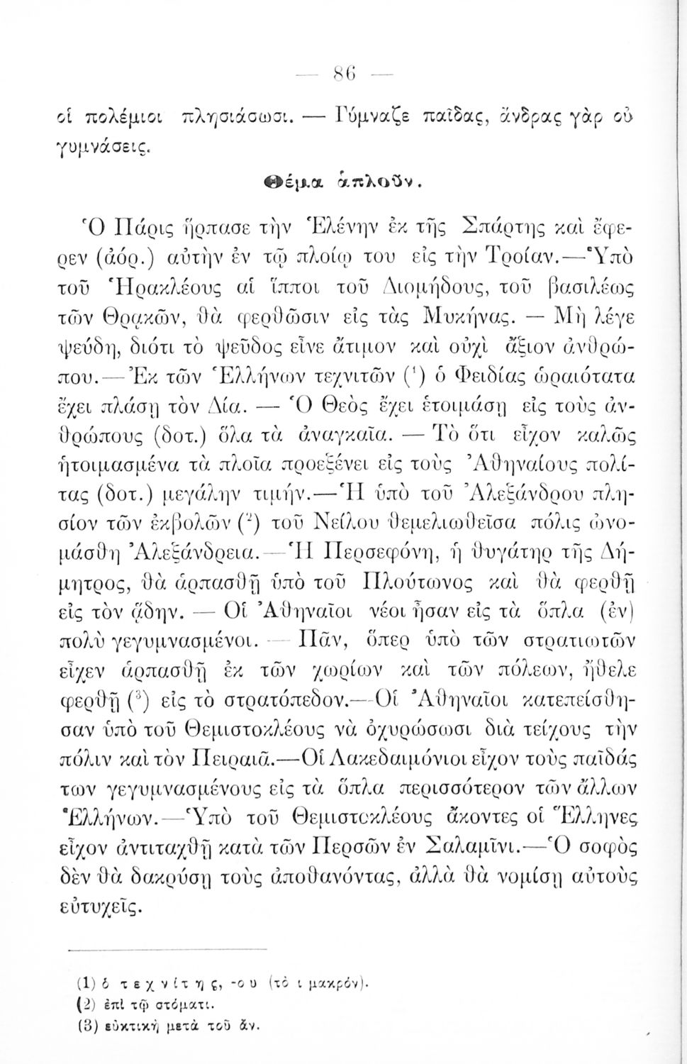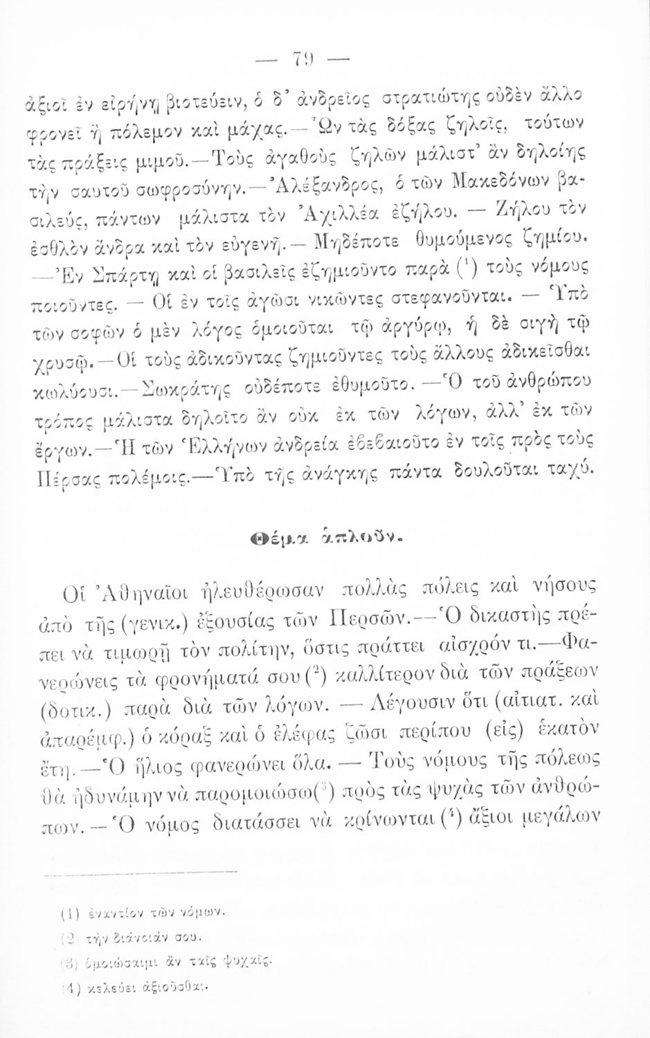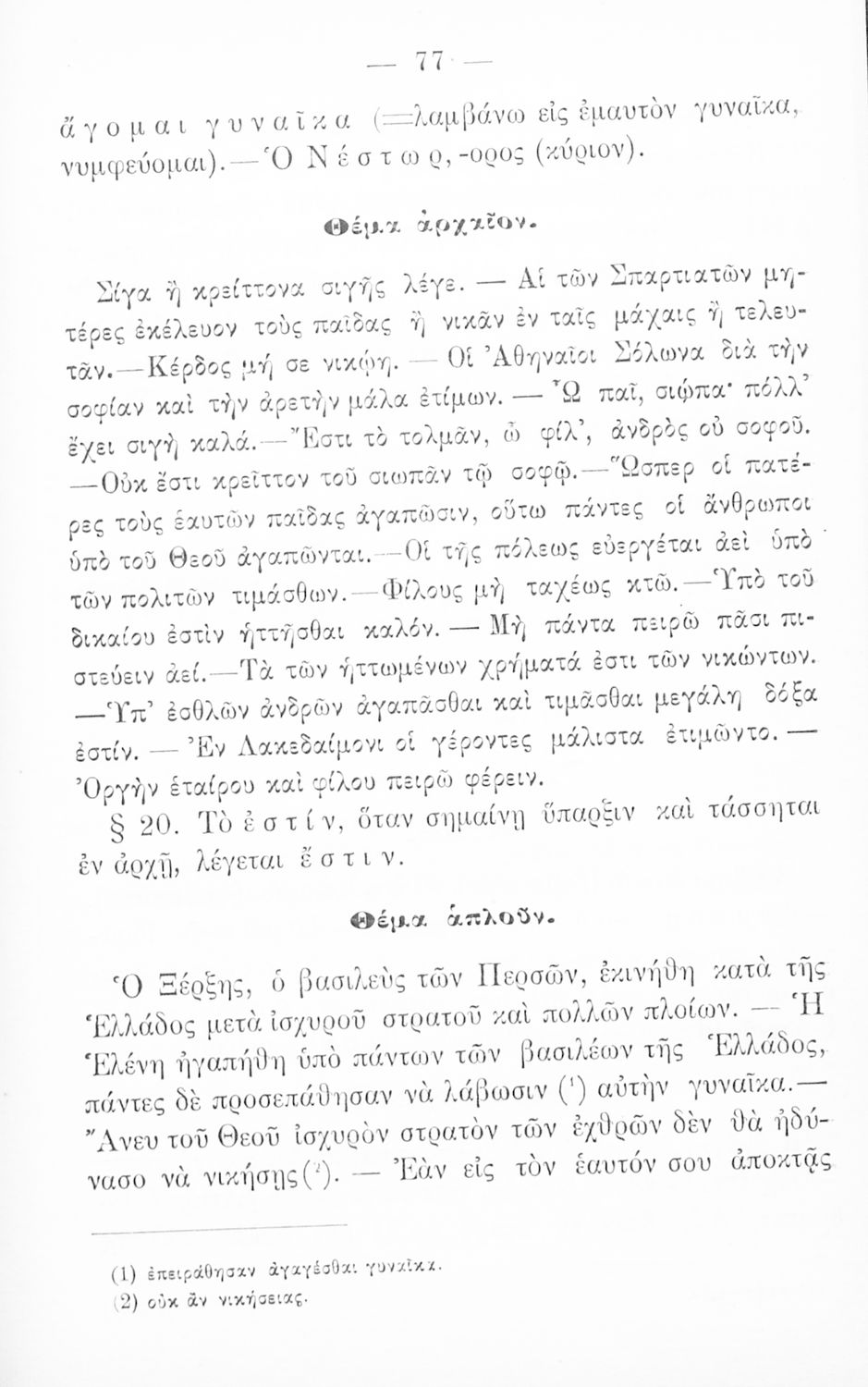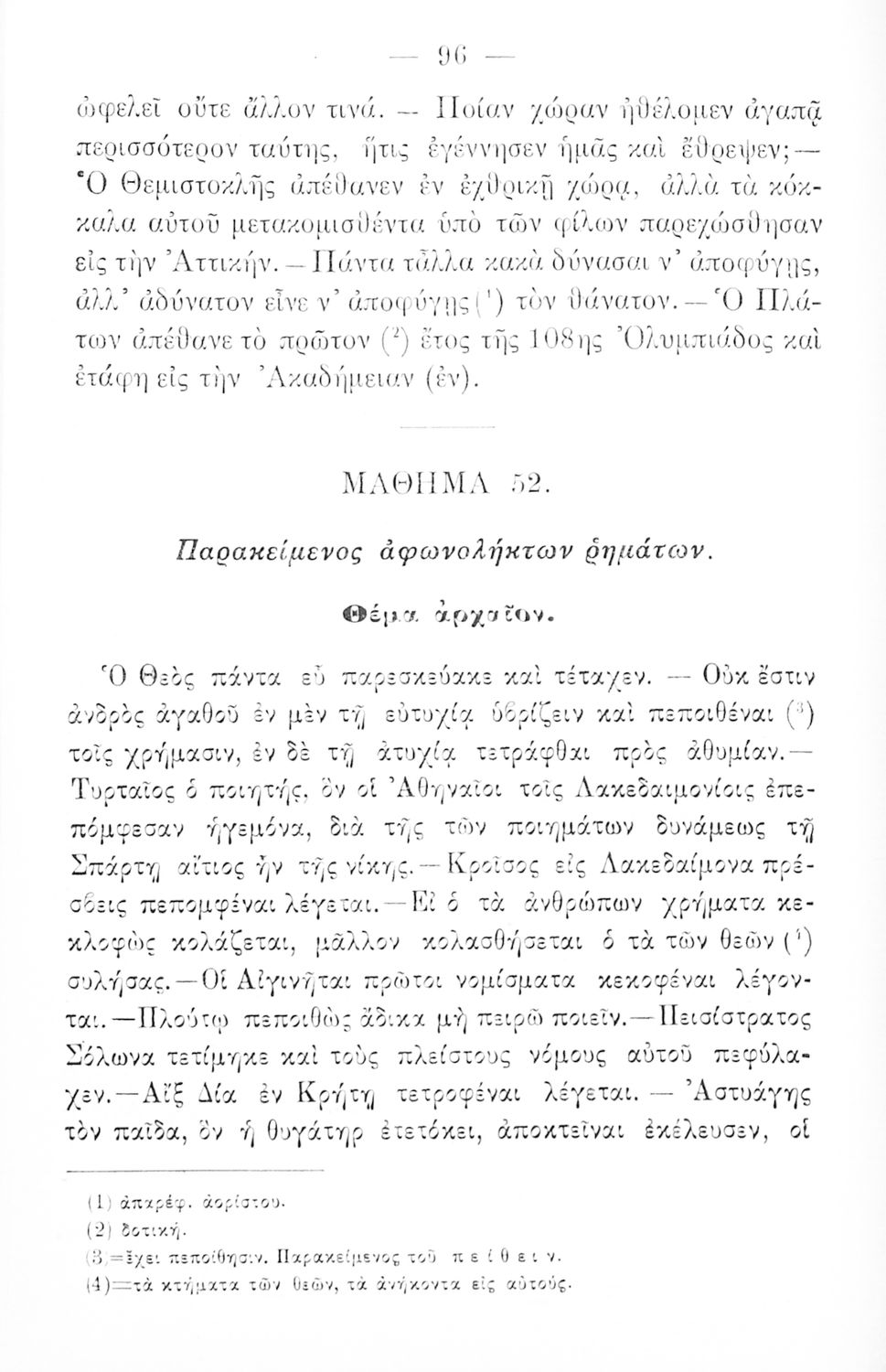 Σχολικό εγχειρίδιο Αρχαίων Ελληνικών για την Α΄ Ελληνικών Σχολείων και Παρθεναγωγείων που περιλαμβάνει σύντομα κείμενα γραμμένα σε αρχαία ελληνικά και την απόδοσή τους σε καθαρεύουσα τα οποία χρησιμοποιεί για τη διδασκαλία των γραμματικών φαινομένων.