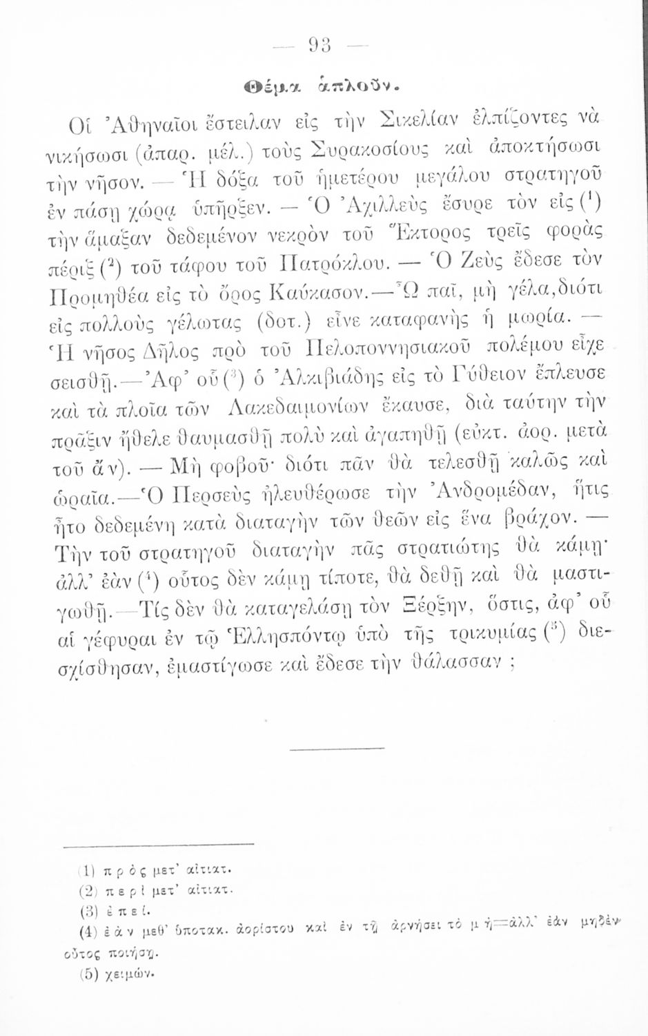 Παρουσίαση περιεχομένου: Σχολικό εγχειρίδιο Αρχαίων Ελληνικών για την Α΄ Ελληνικών Σχολείων και Παρθεναγωγείων που περιλαμβάνει σύντομα κείμενα γραμμένα σε αρχαία ελληνικά και την απόδοσή τους σε καθαρεύουσα τα οποία χρησιμοποιεί για τη διδασκαλία των γραμματικών φαινομένων.